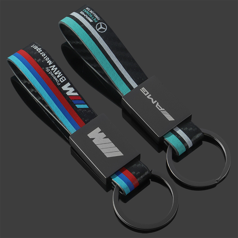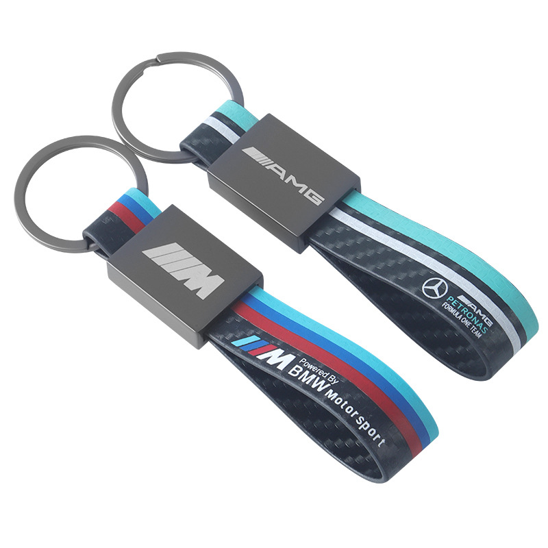 跨境M三色运动标奔驰AMG真皮碳纤维汽车改装车标金属钥匙扣圈挂件