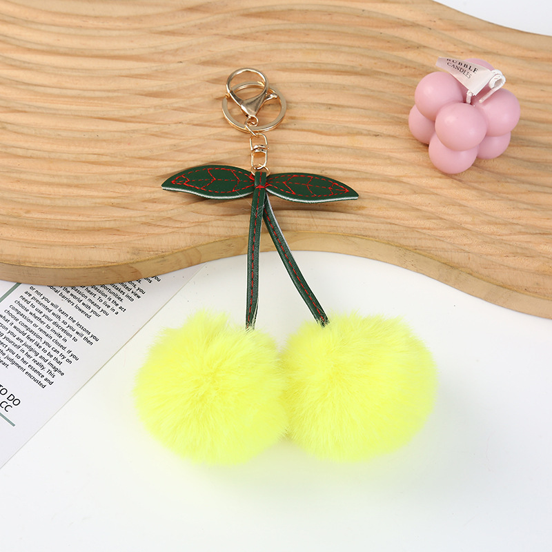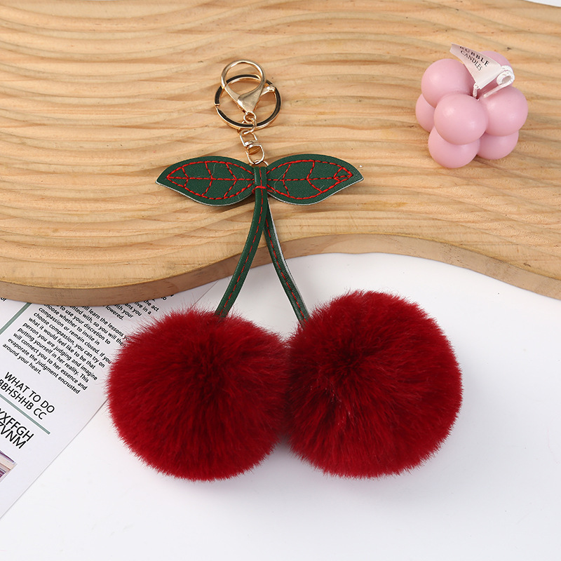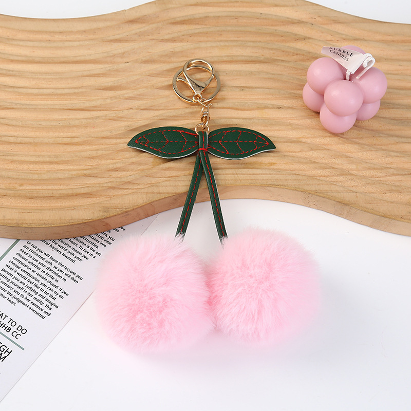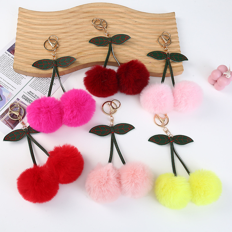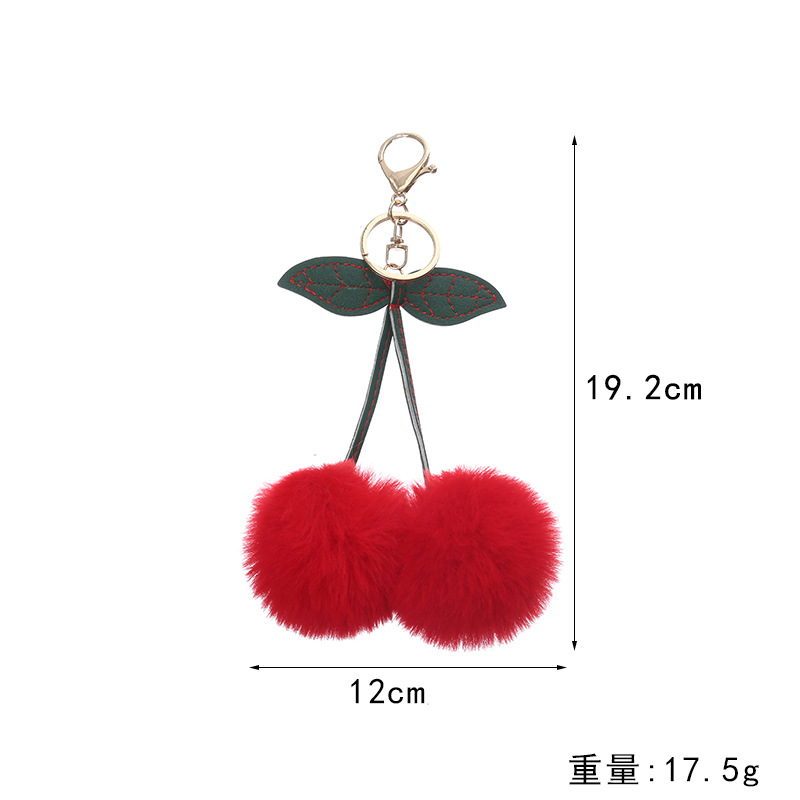 韩系皮质樱桃毛球钥匙扣濑兔毛女士包包挂件小清新双叶挂饰挂件