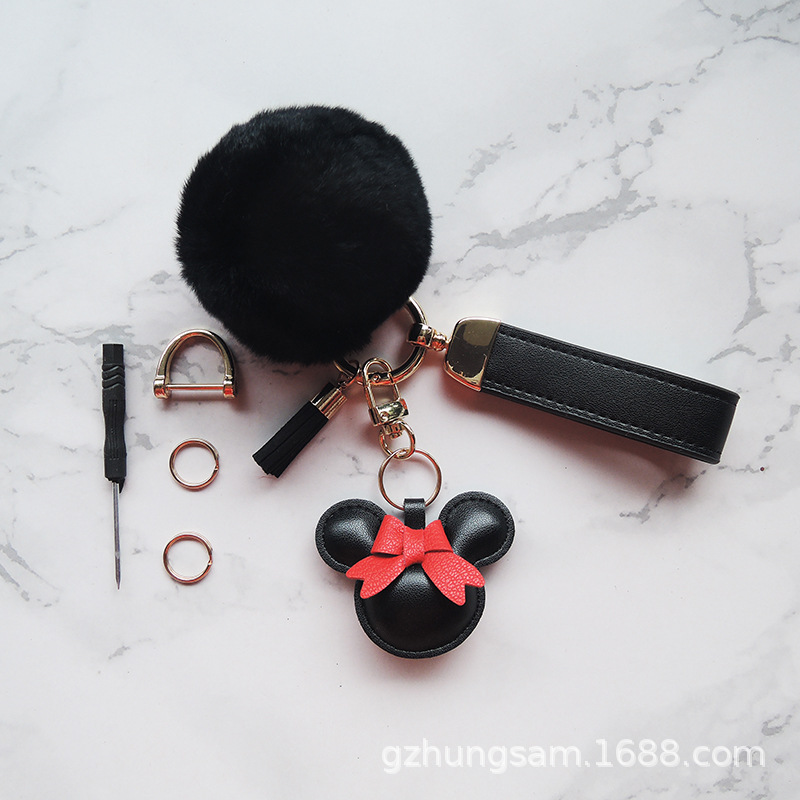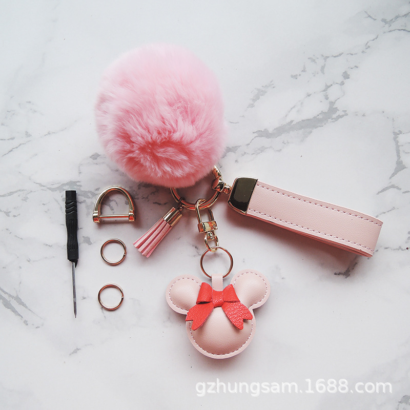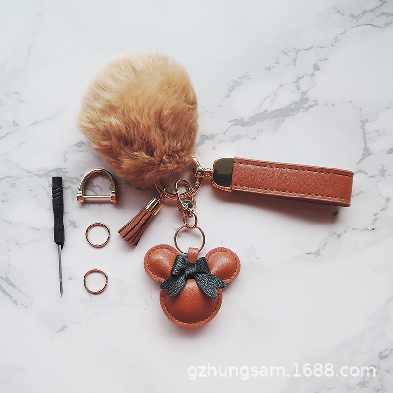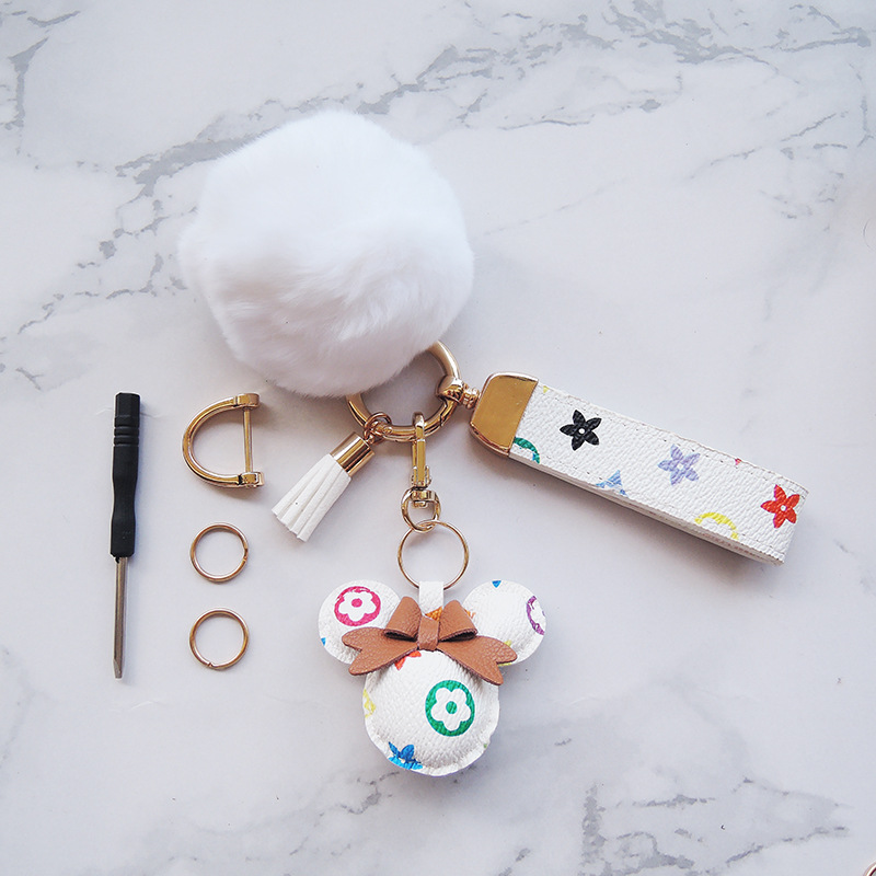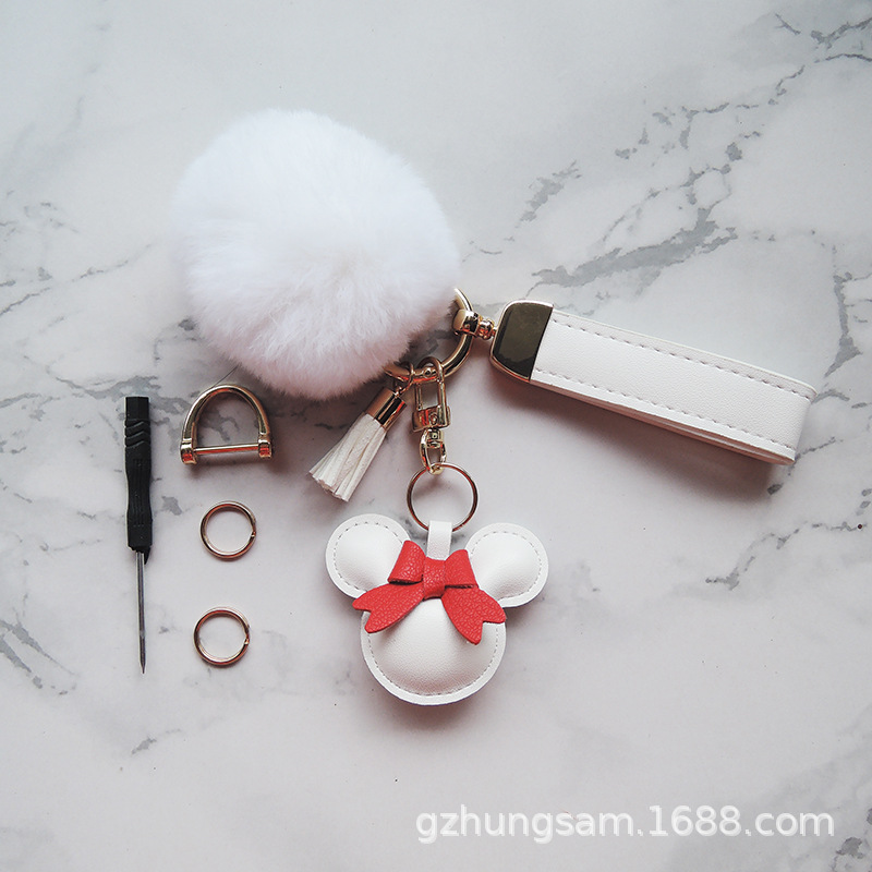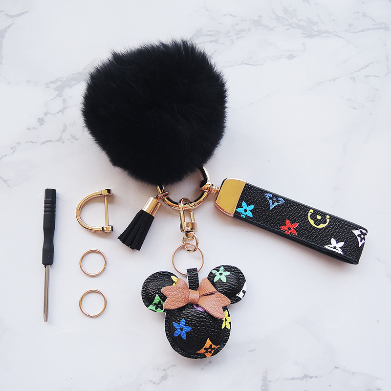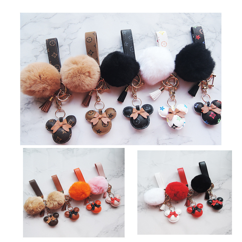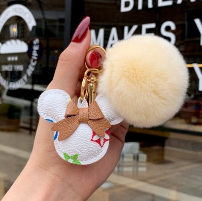 老花钥匙扣皮革蝴蝶结米奇 格子纹米妮兔毛球挂件手绳汽车钥匙链