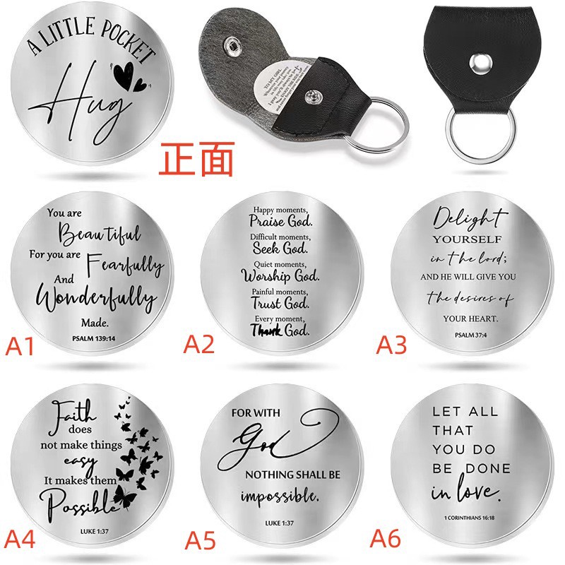跨境不锈钢双面励志钥匙扣带PU皮革钥匙扣送家人朋友关系纪念品