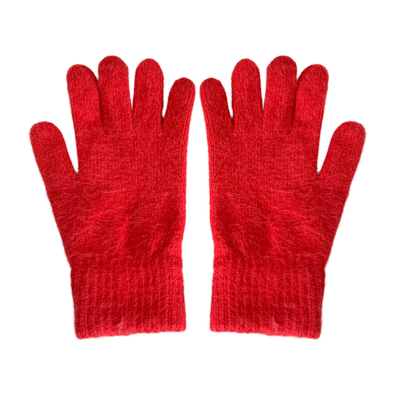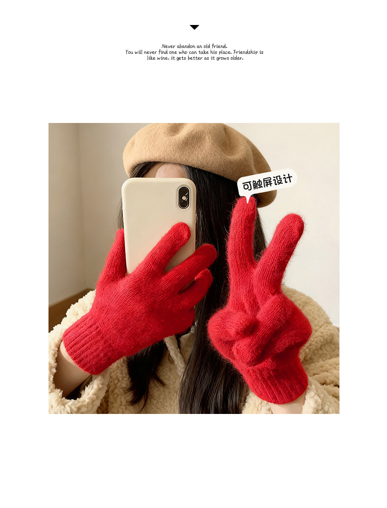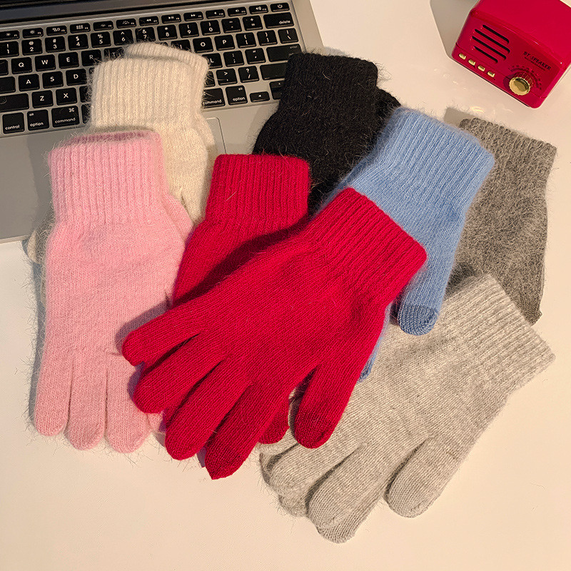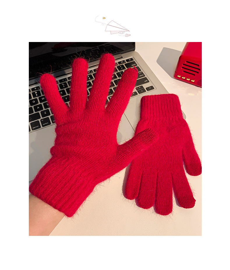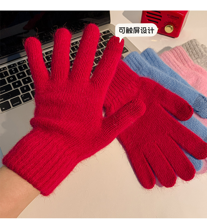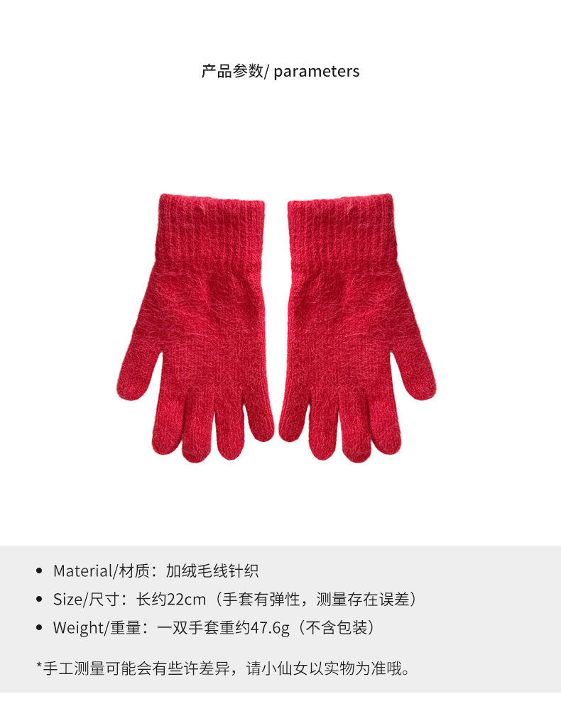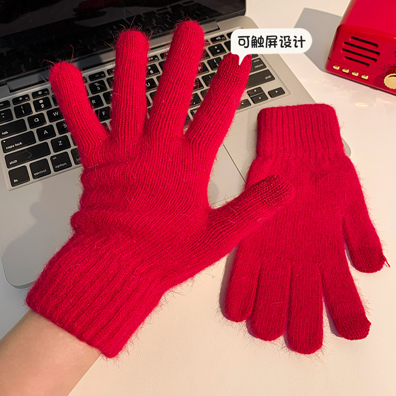 纯色兔毛针织毛线手套女冬季可触屏红色保暖防寒五指新年圣诞加厚