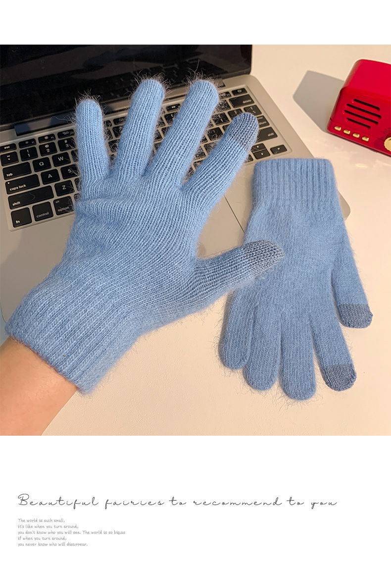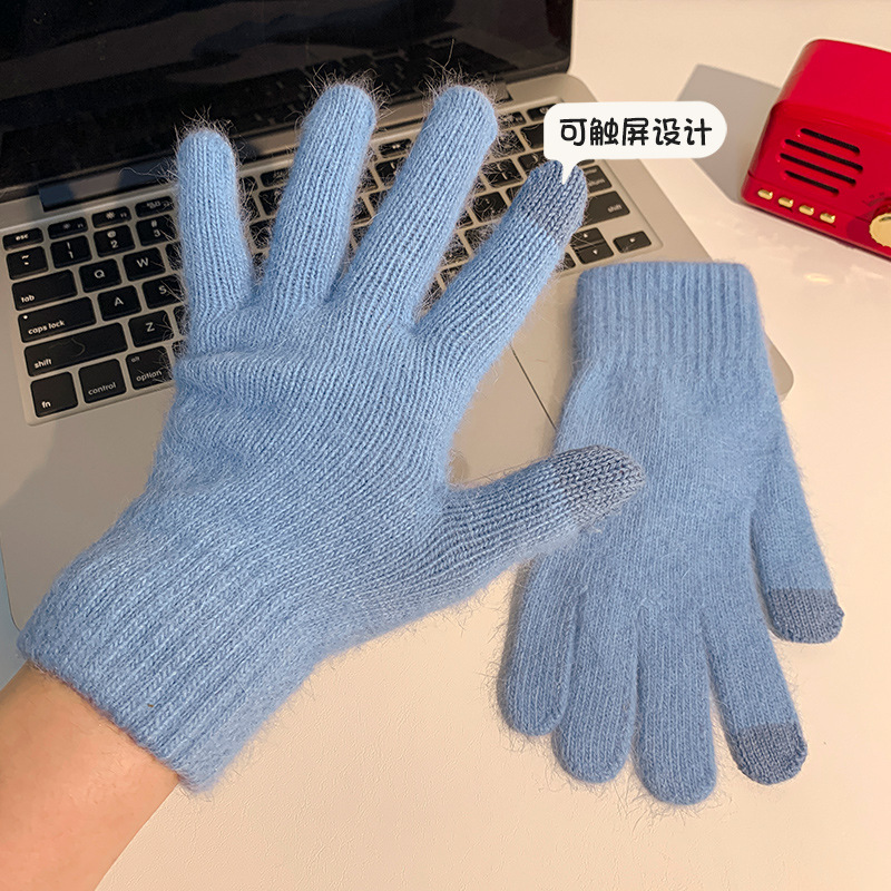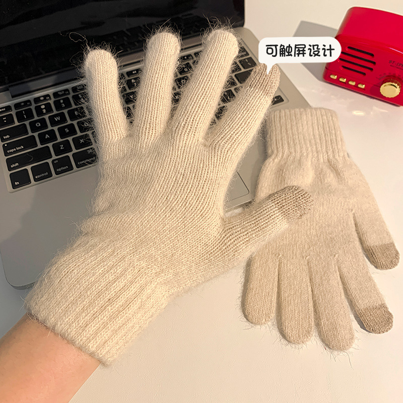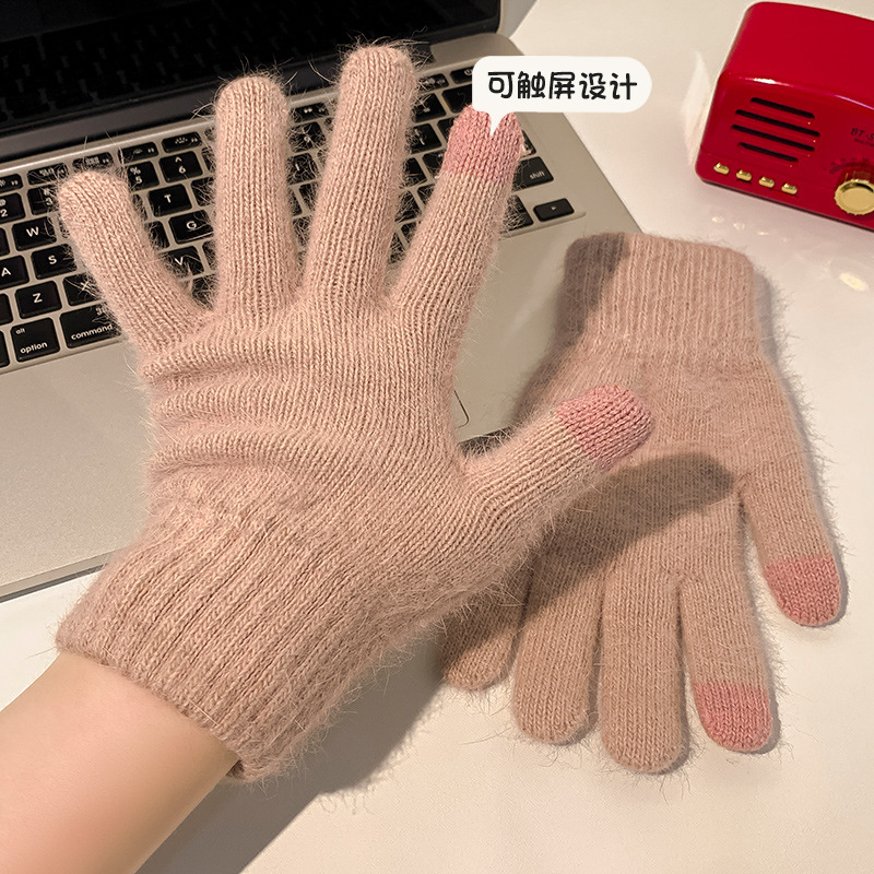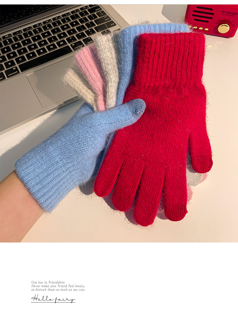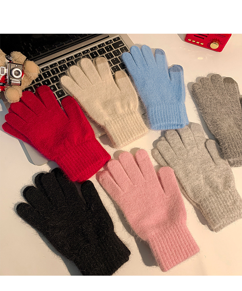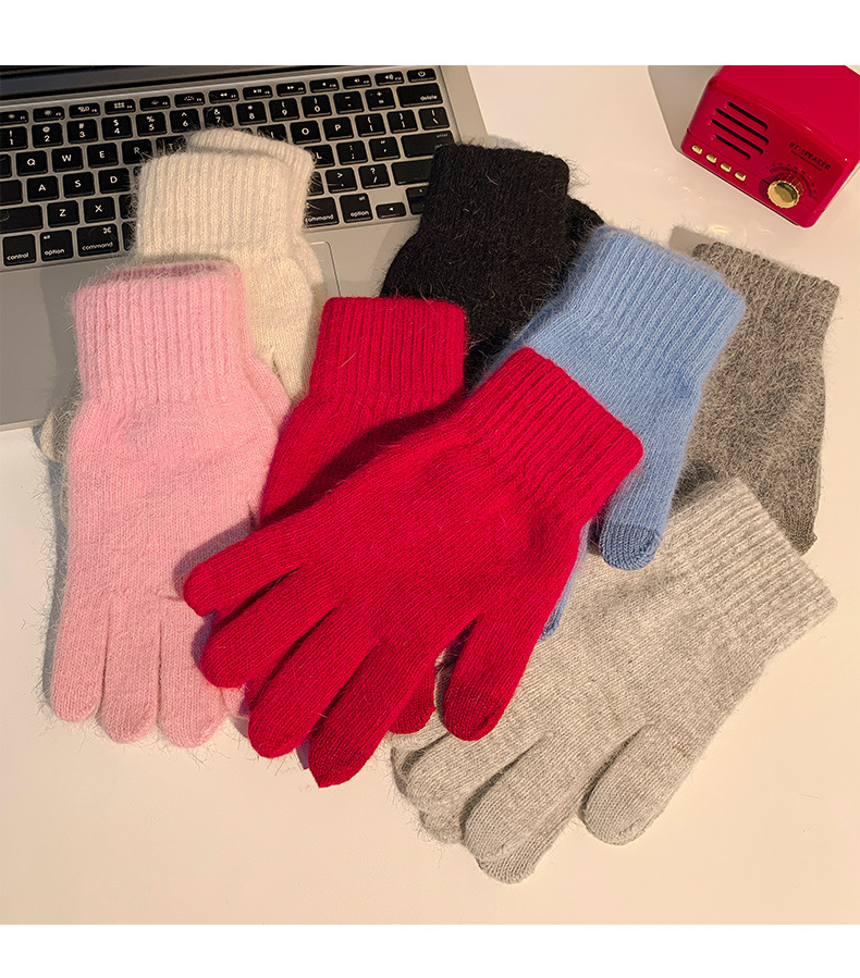 纯色兔毛针织毛线手套女冬季可触屏红色保暖防寒五指新年圣诞加厚