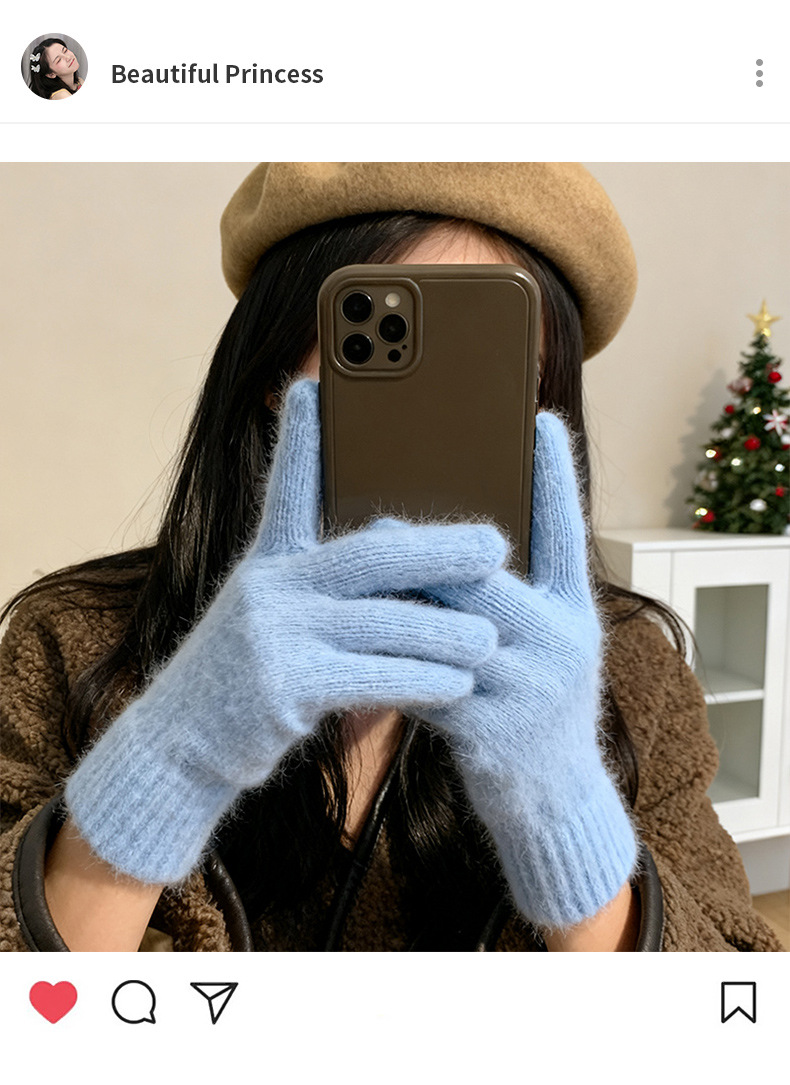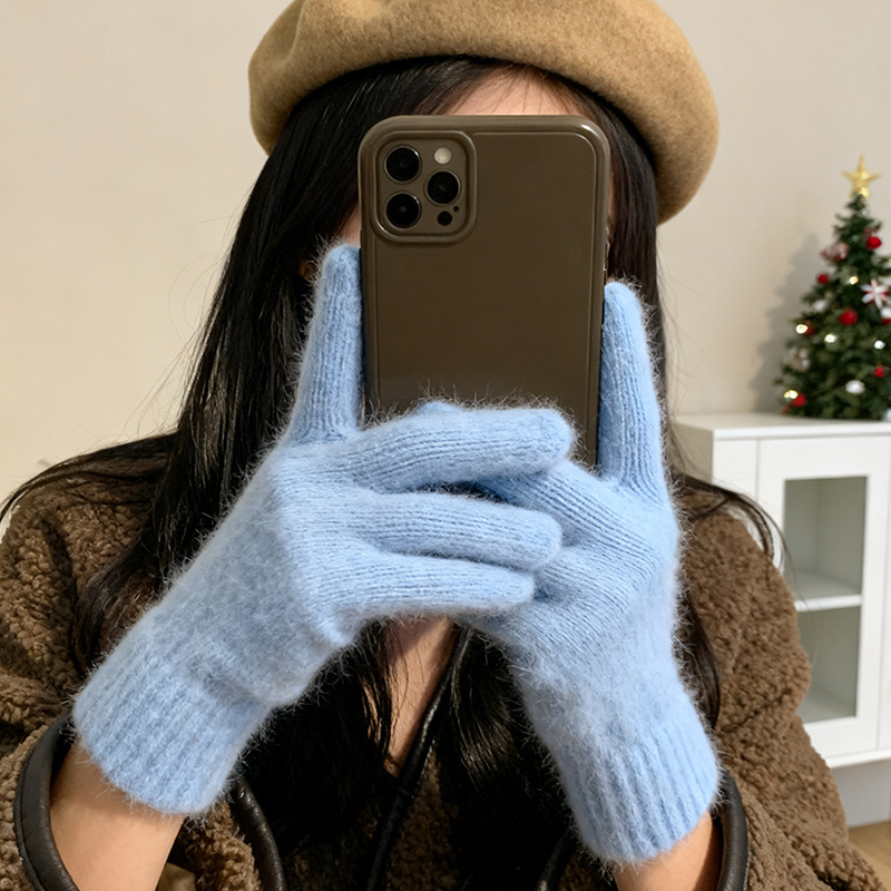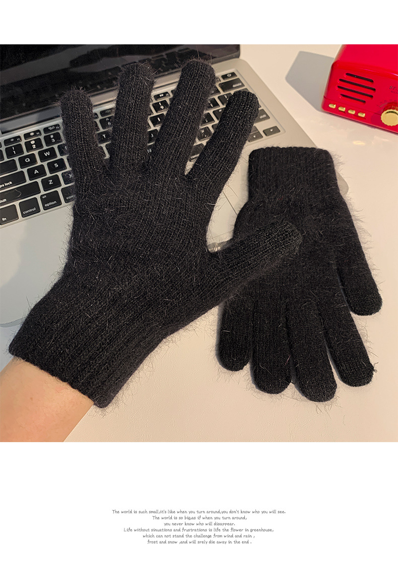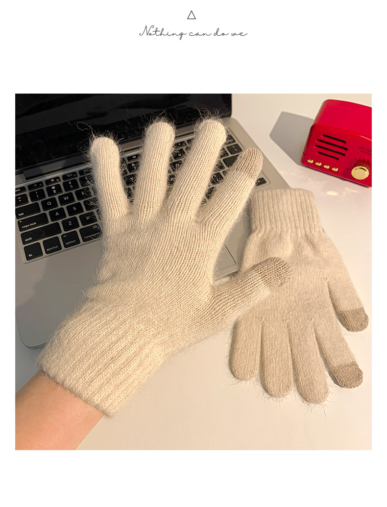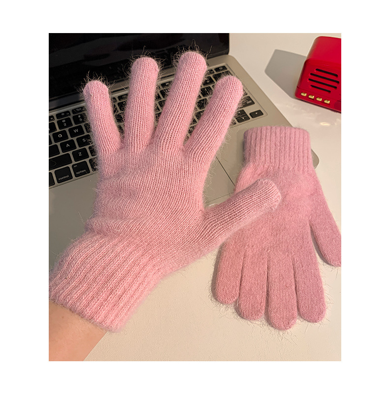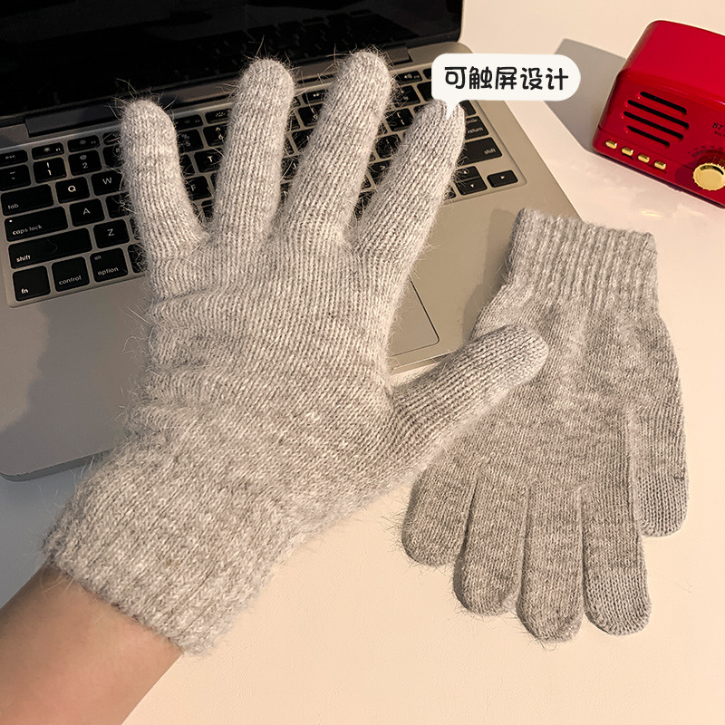 纯色兔毛针织毛线手套女冬季可触屏红色保暖防寒五指新年圣诞加厚