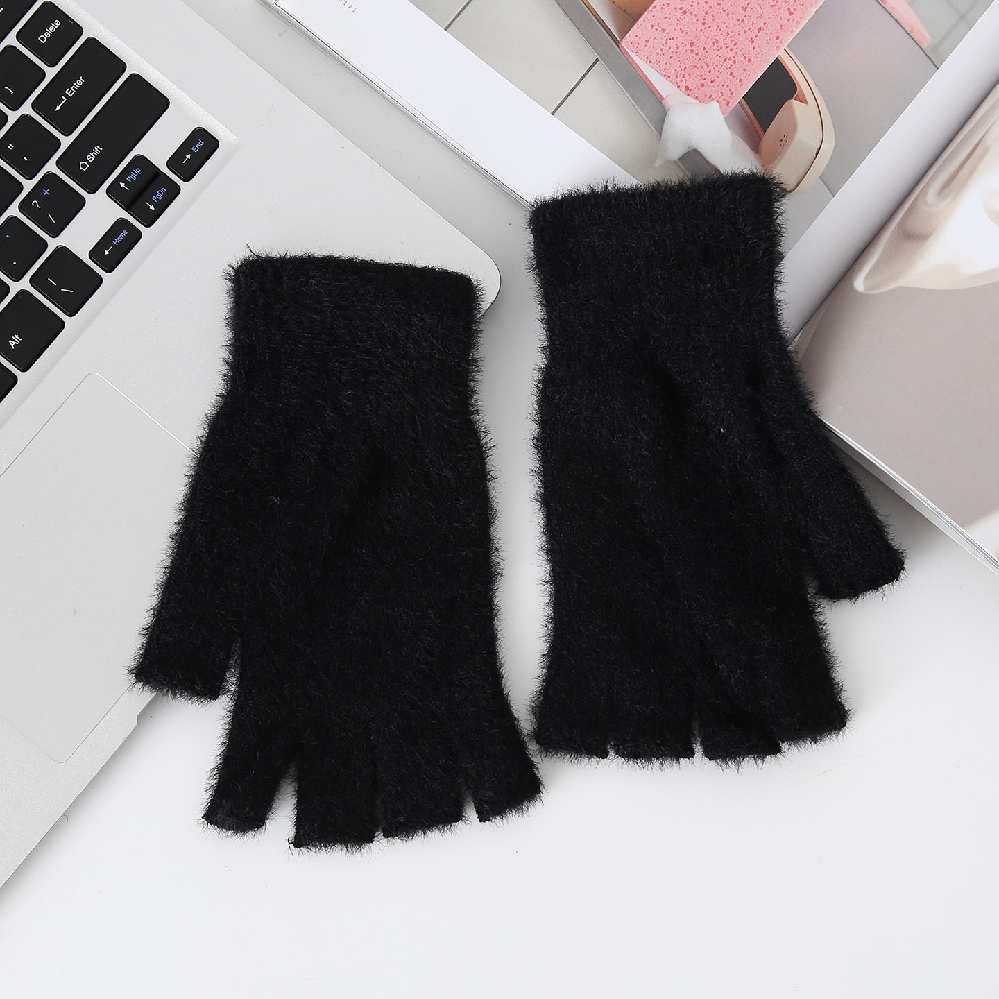 二半指仿貂毛手套秋冬学生写字女露手指骑行手套纯色通勤保暖手套