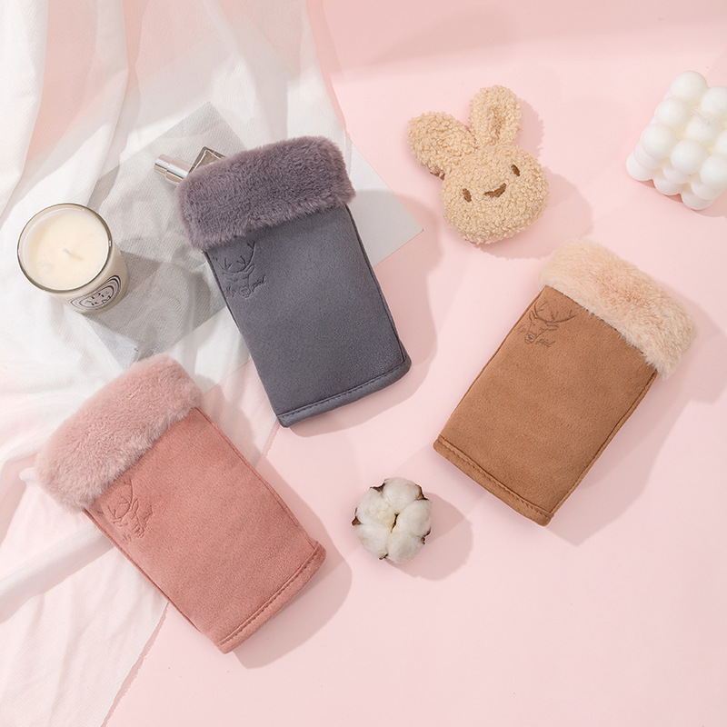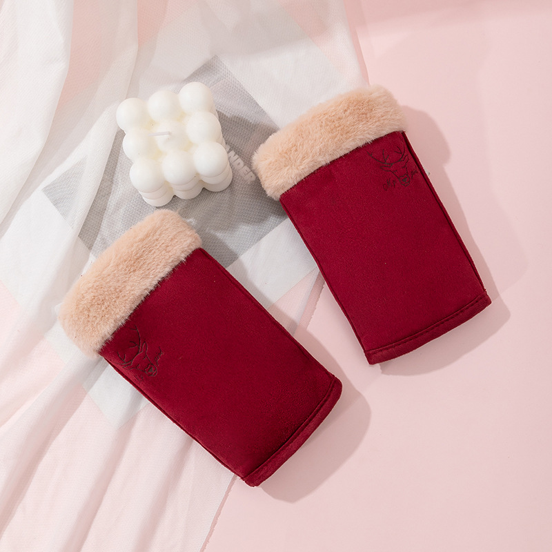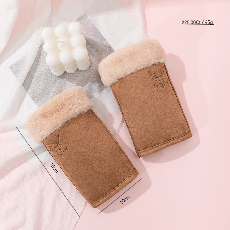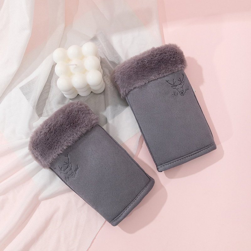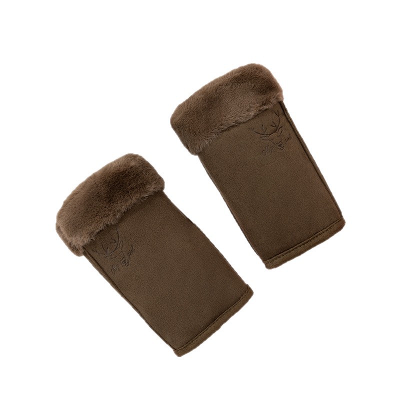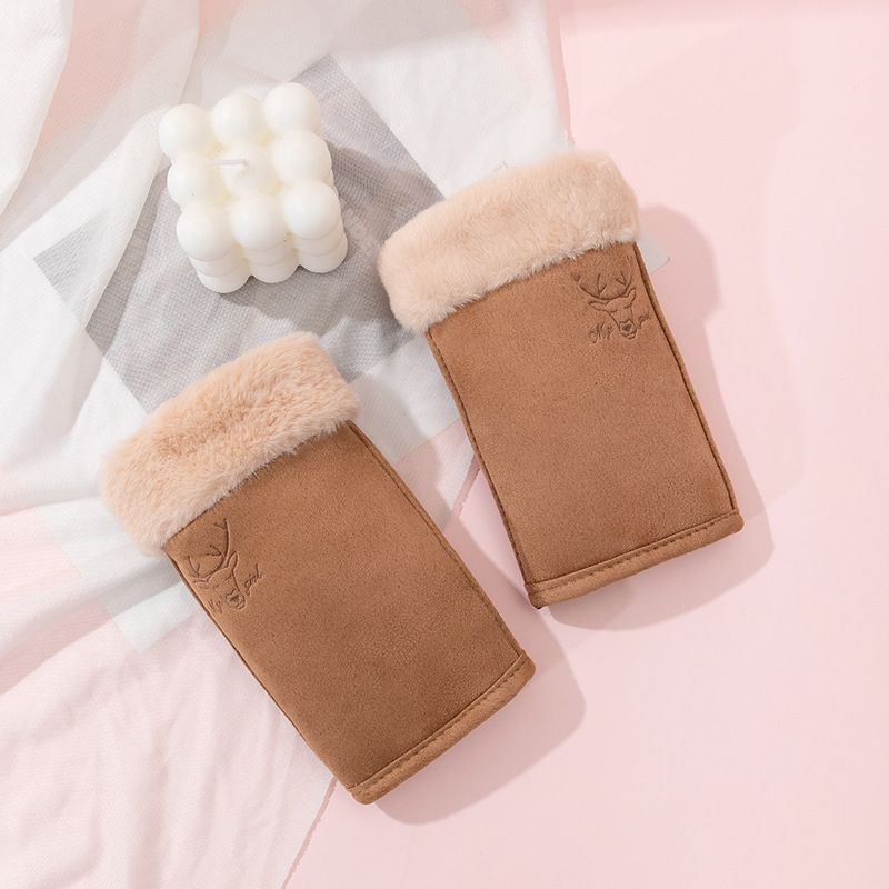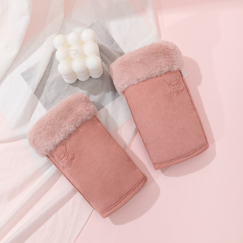 女士手套冬季半指加厚保暖加绒学生写字办公女孩麂皮绒半截护手