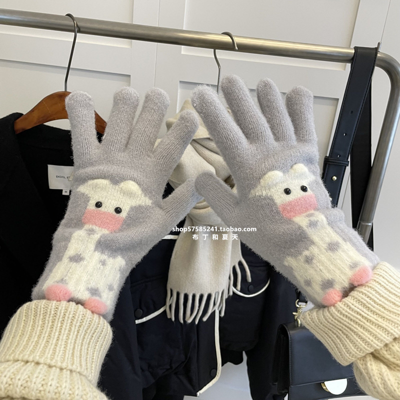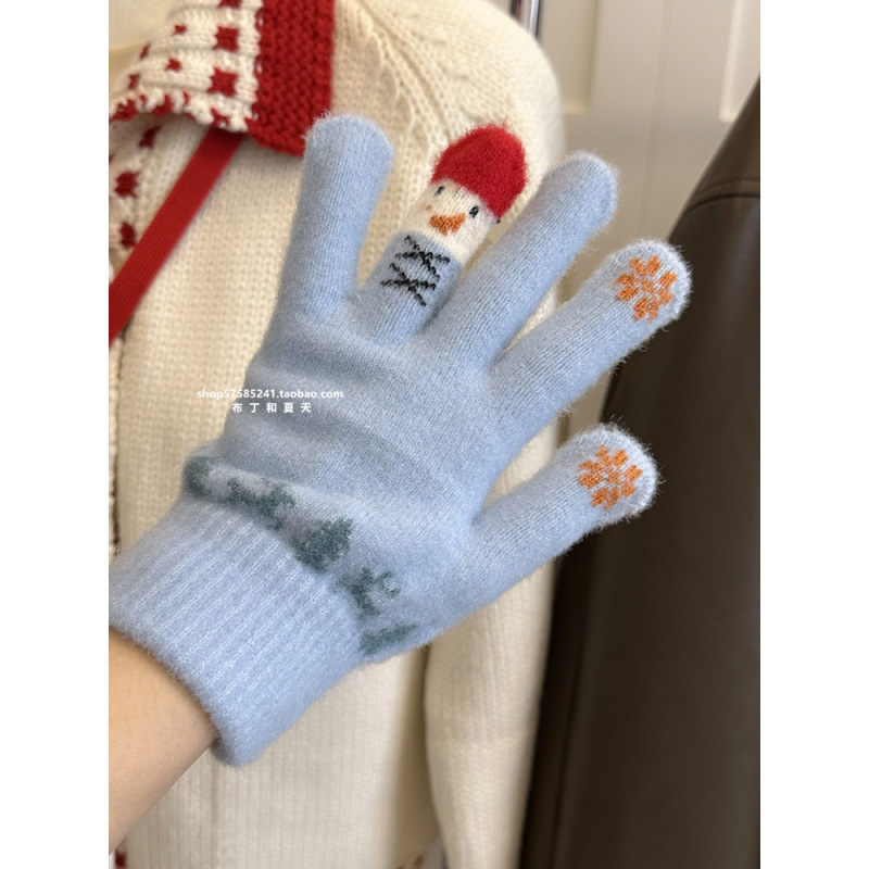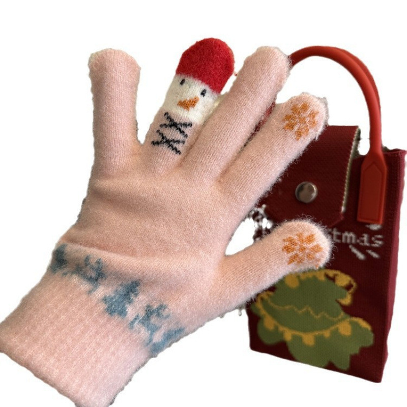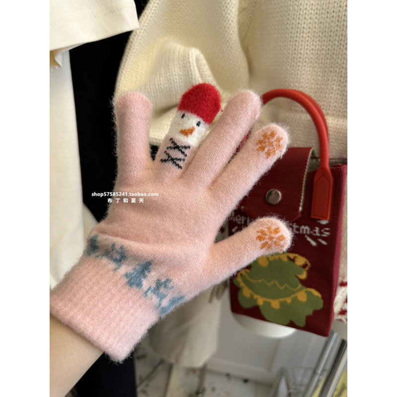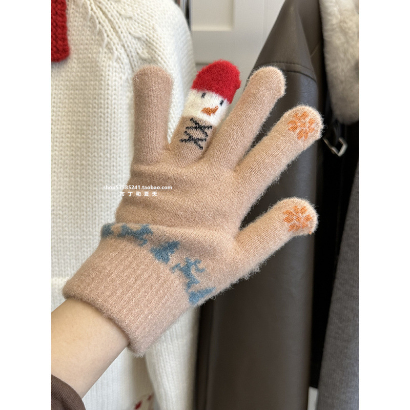 ins可爱雪人卡通手套女加绒保暖冬季五指可触屏分指骑车防风防寒