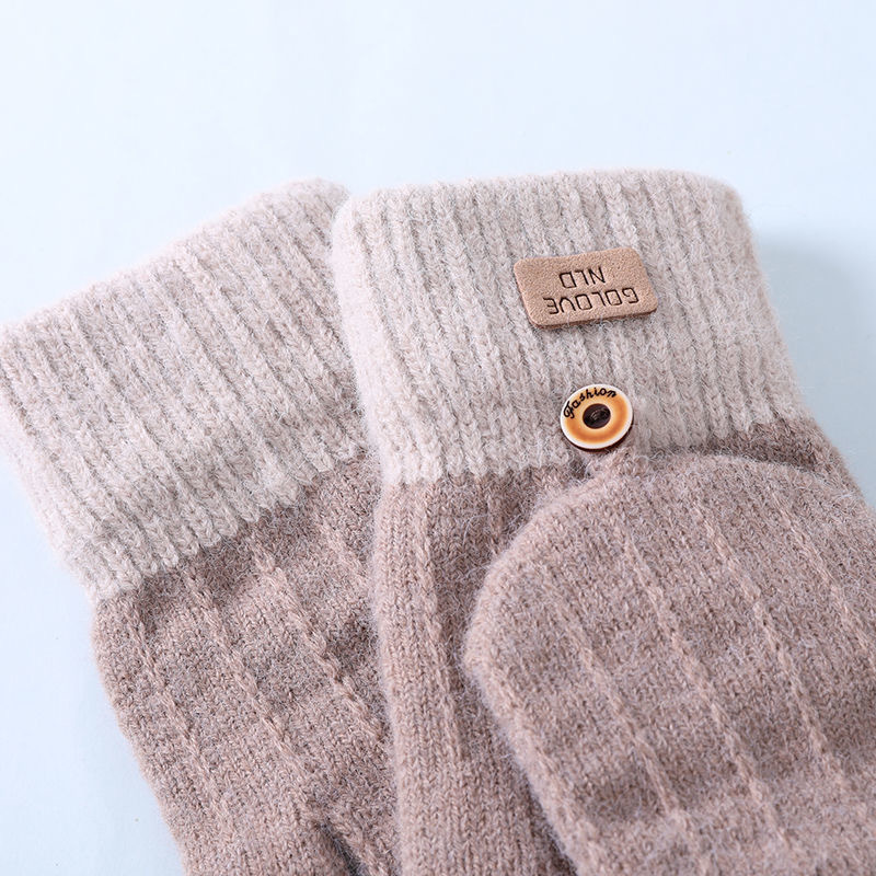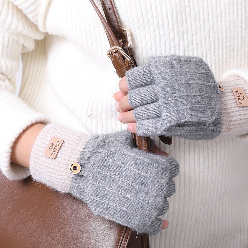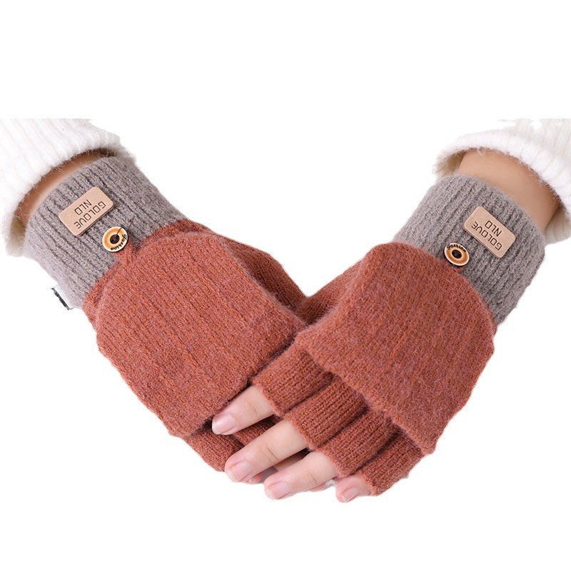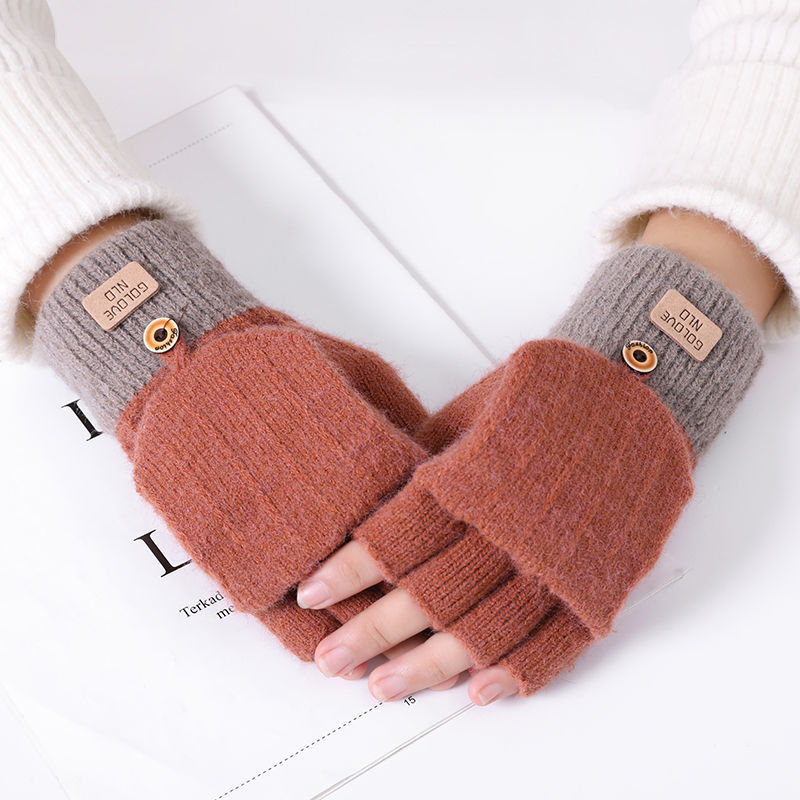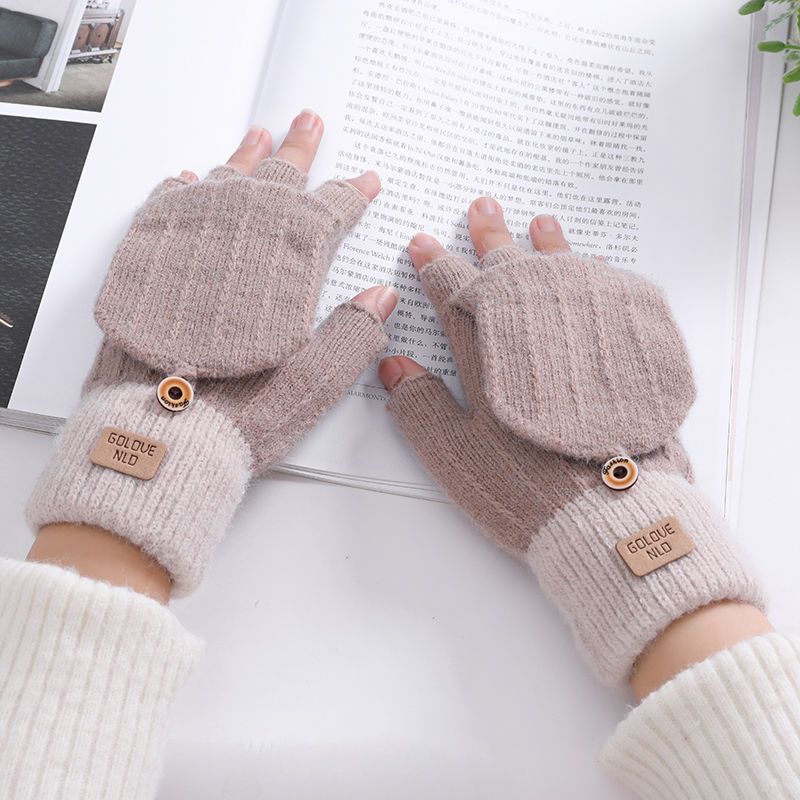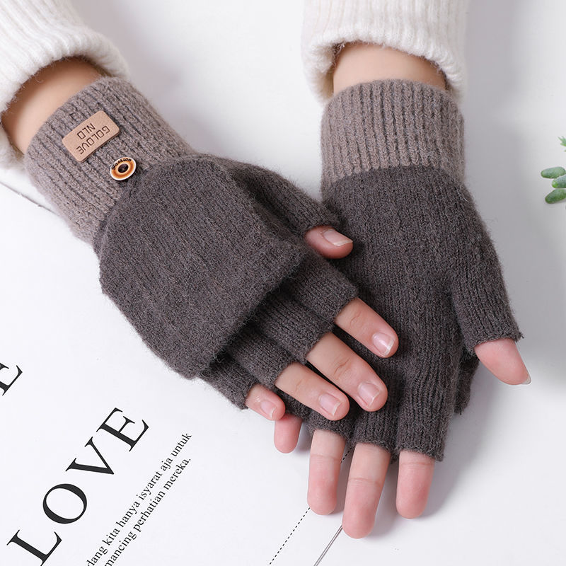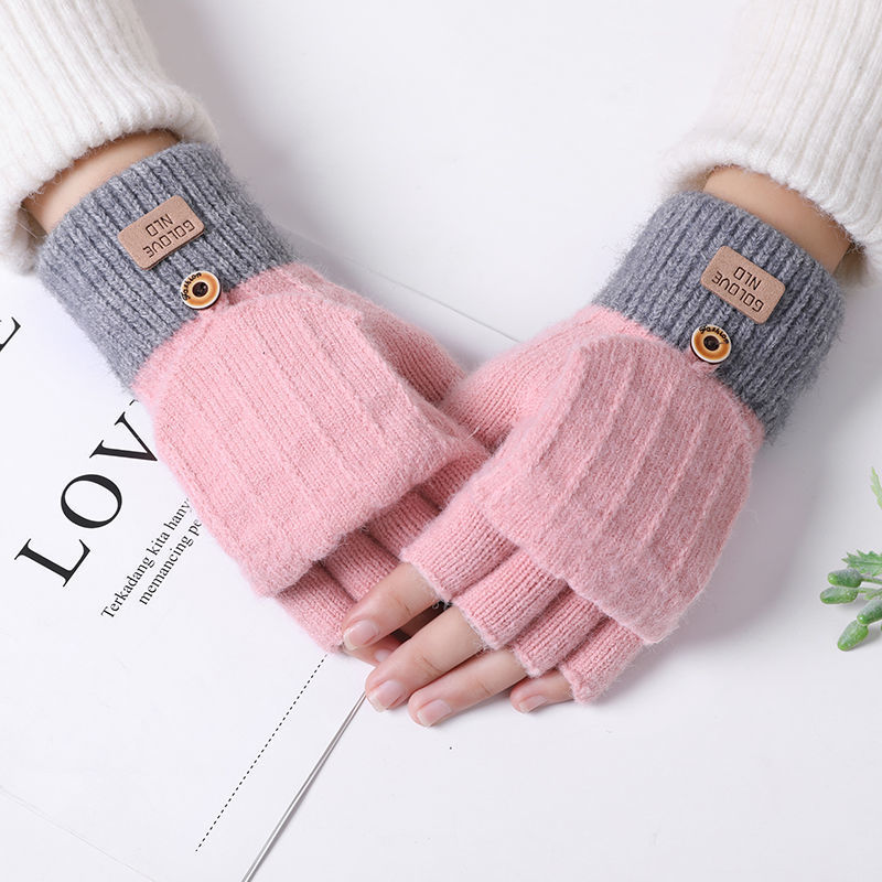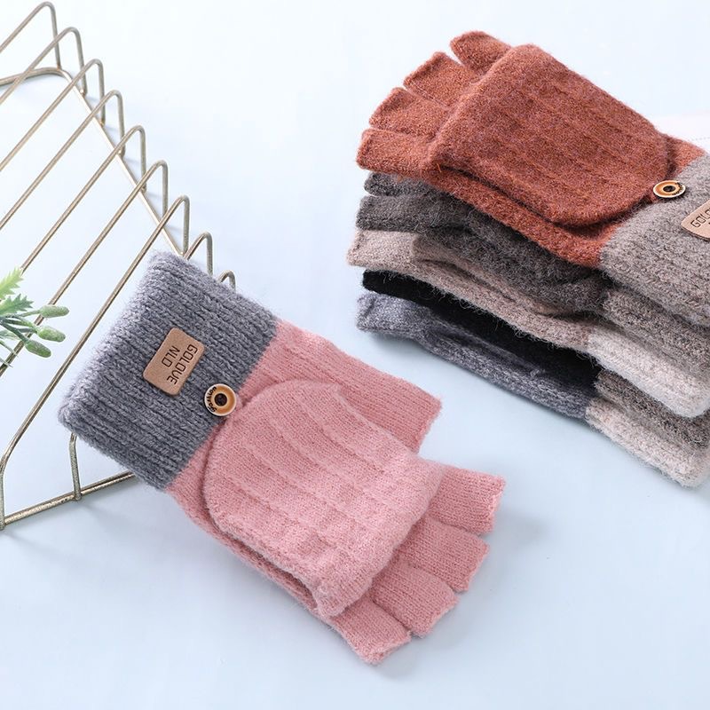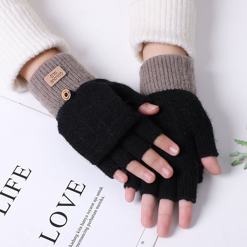 半指翻盖手套冬季女士可爱加绒防寒保暖毛线秋冬露指半截学生写字