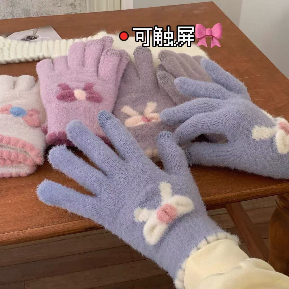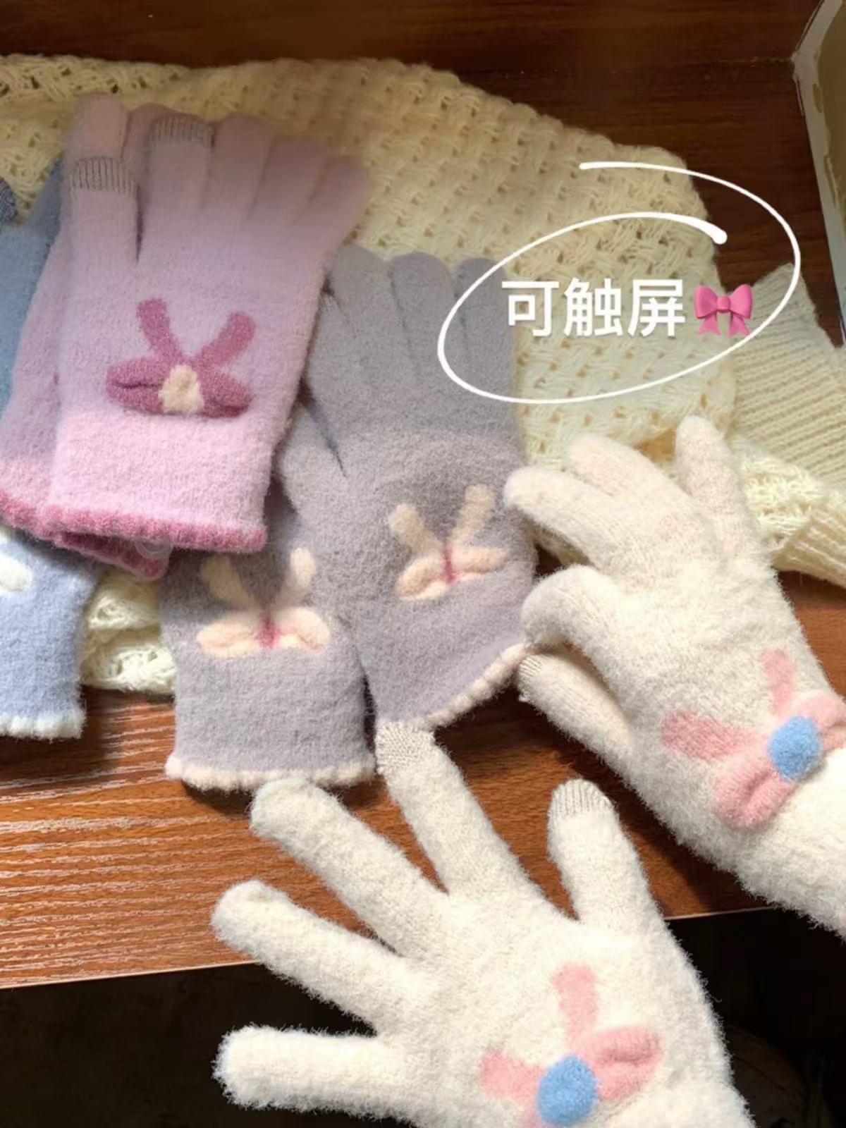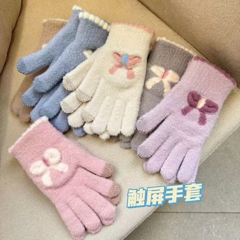 2025新款可触屏针织手套女秋冬季毛线保暖五指可爱学生冬天骑蝴蝶