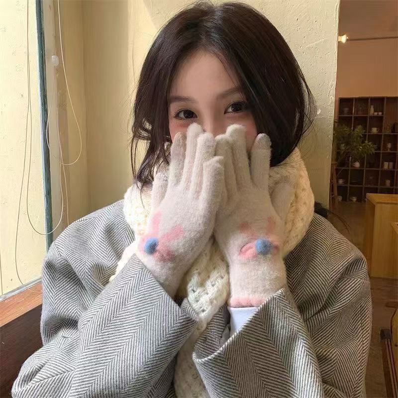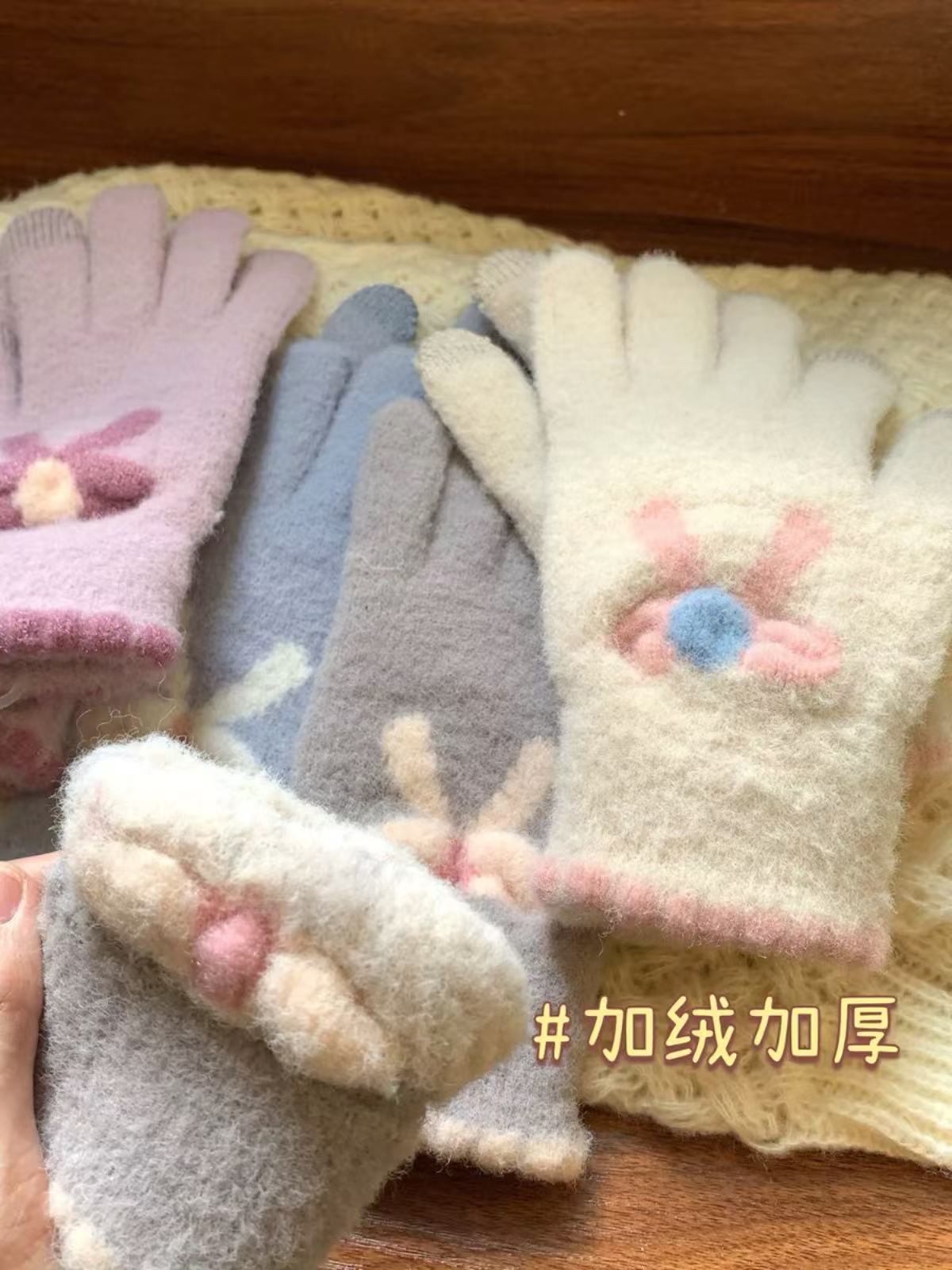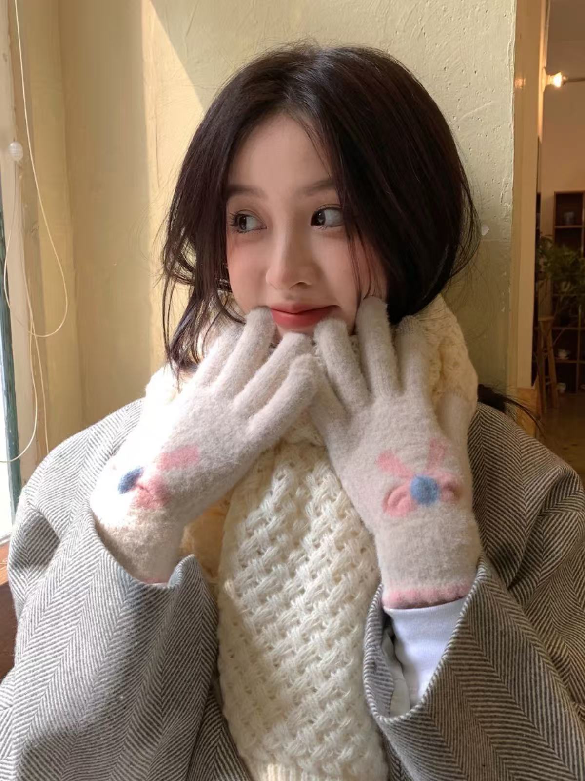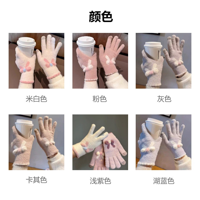 2025新款可触屏针织手套女秋冬季毛线保暖五指可爱学生冬天骑蝴蝶