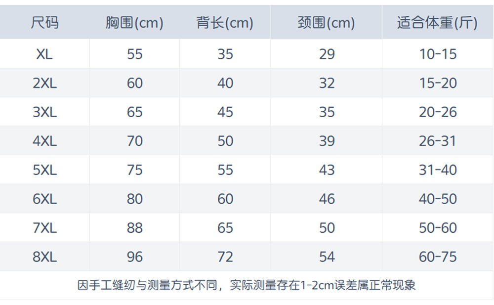 | 2XL(背长40cm) | USD $5.2 | 195 piece available |