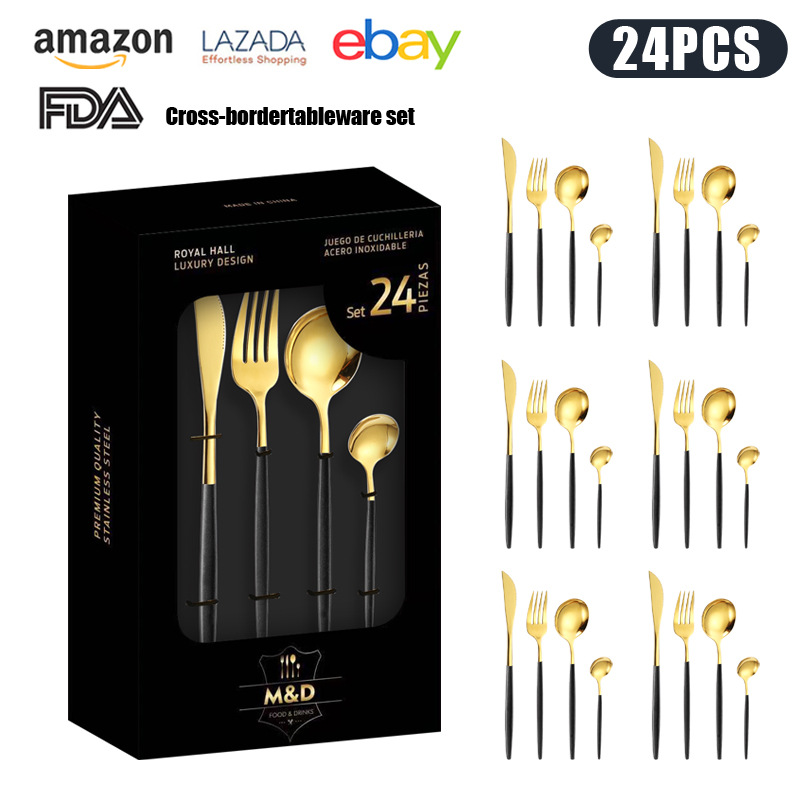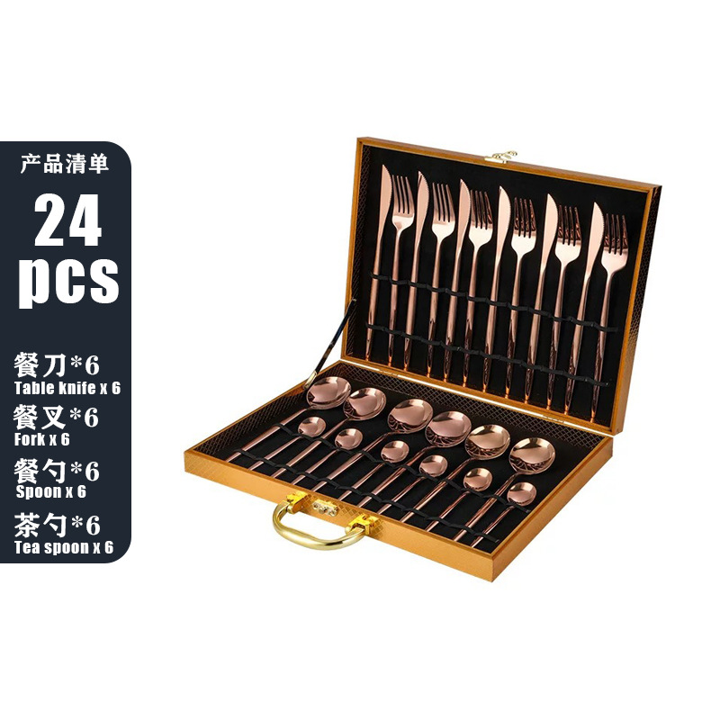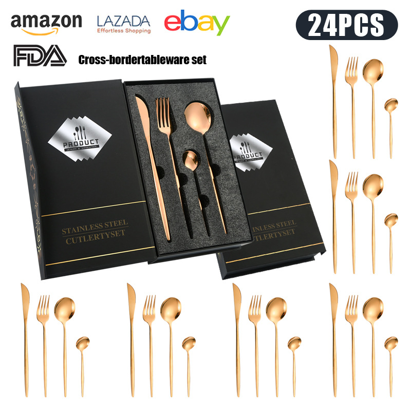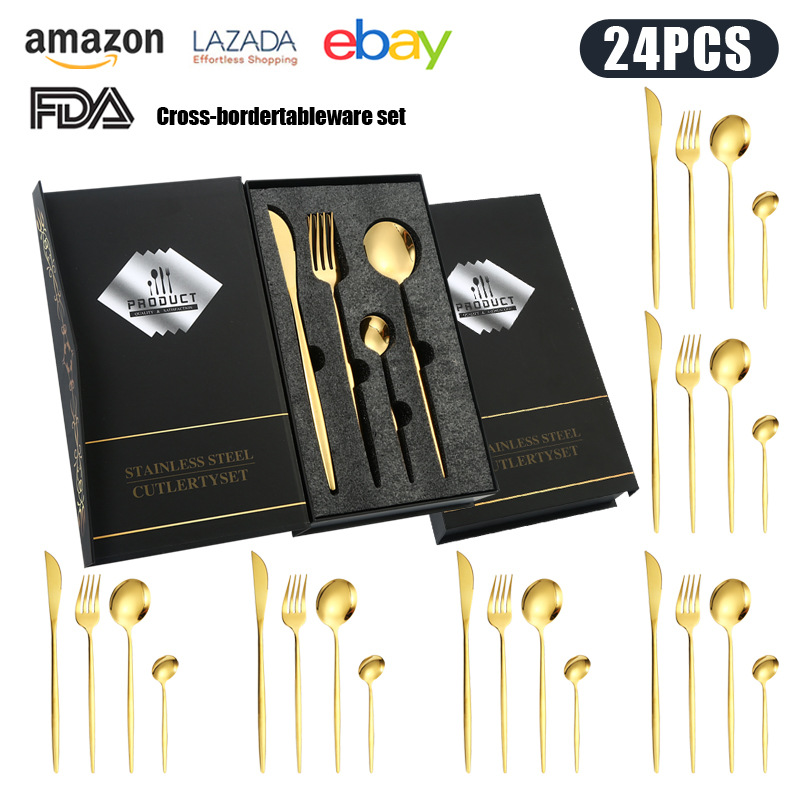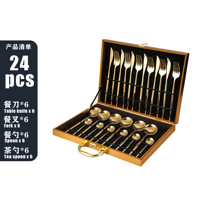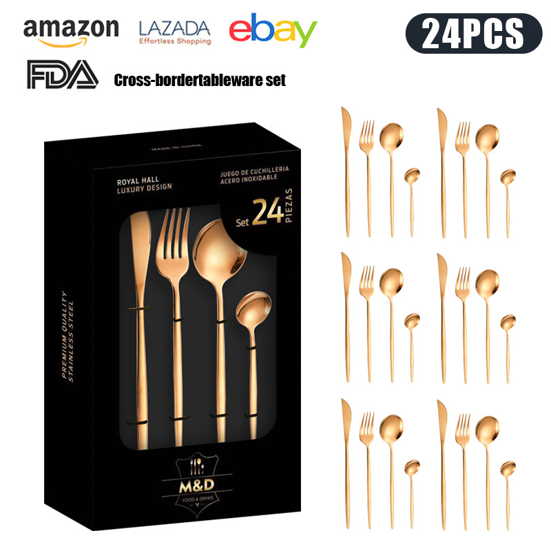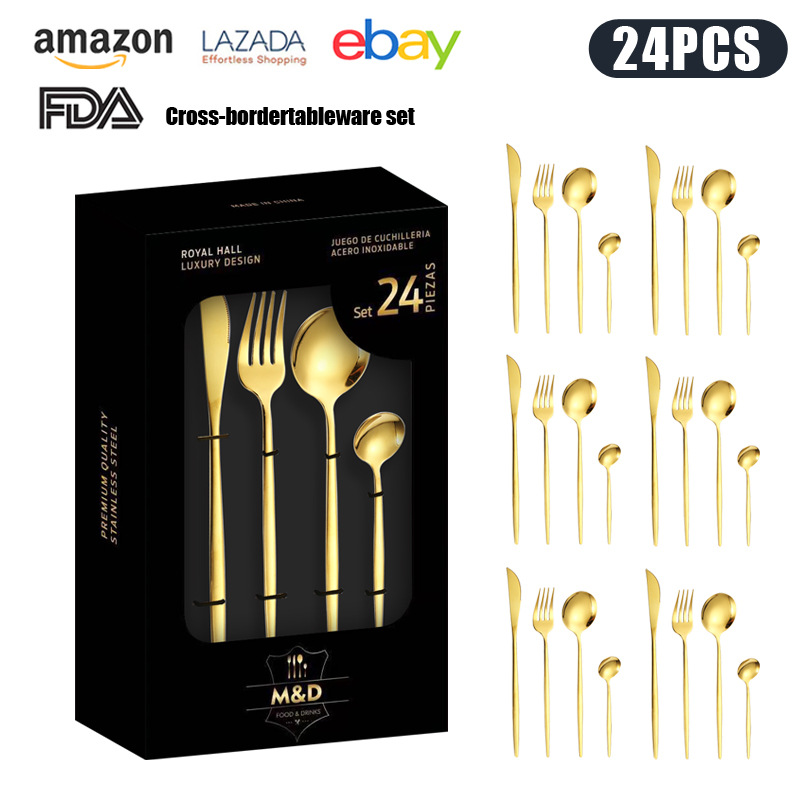 跨境热销葡萄牙不锈钢刀叉24件套餐具套装礼盒装镀钛金色西餐勺子