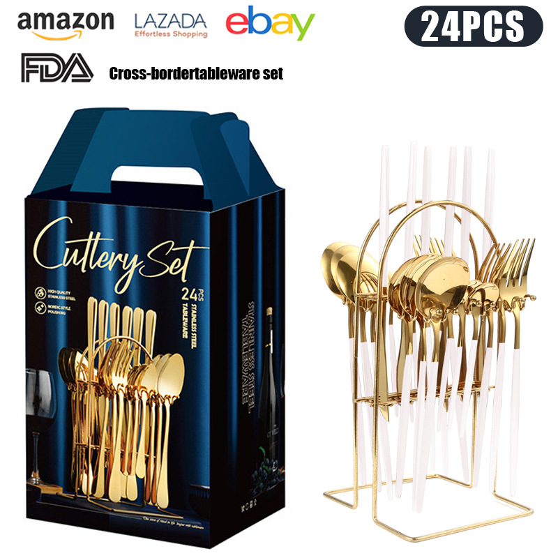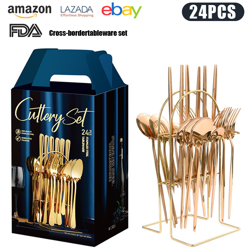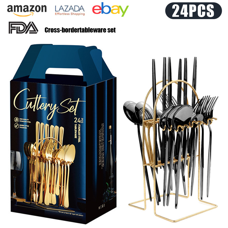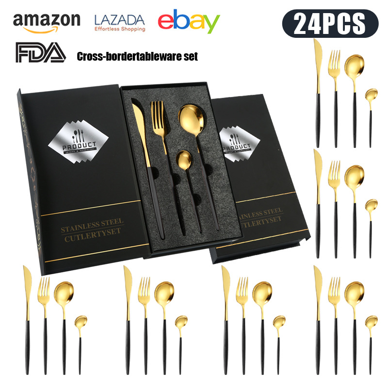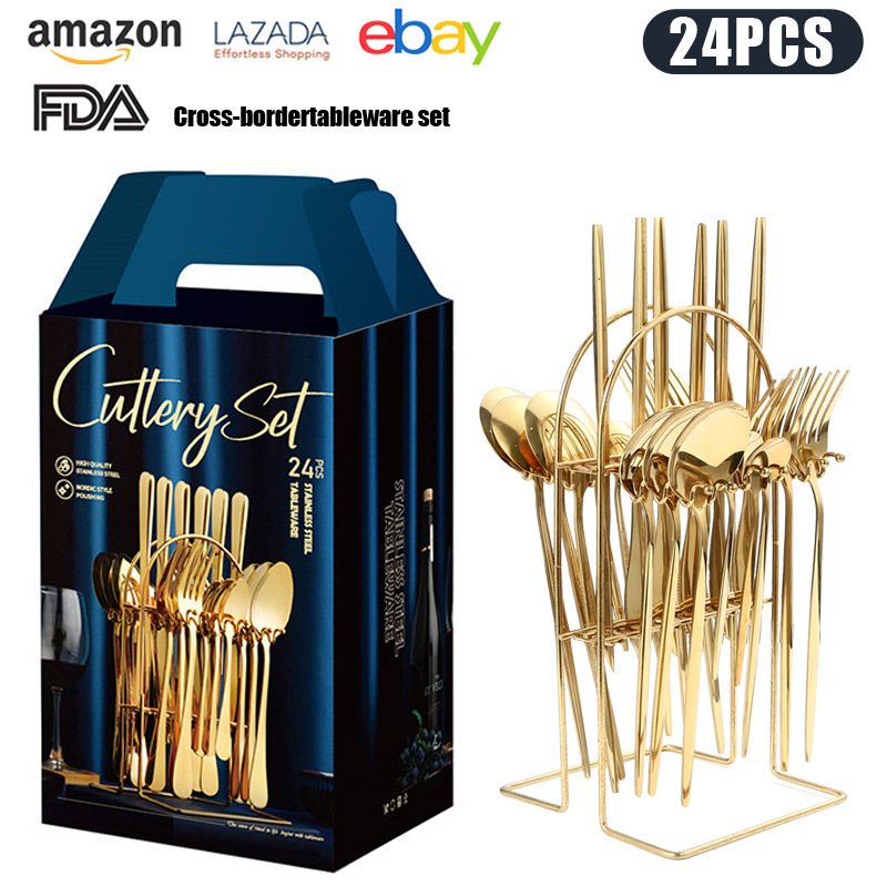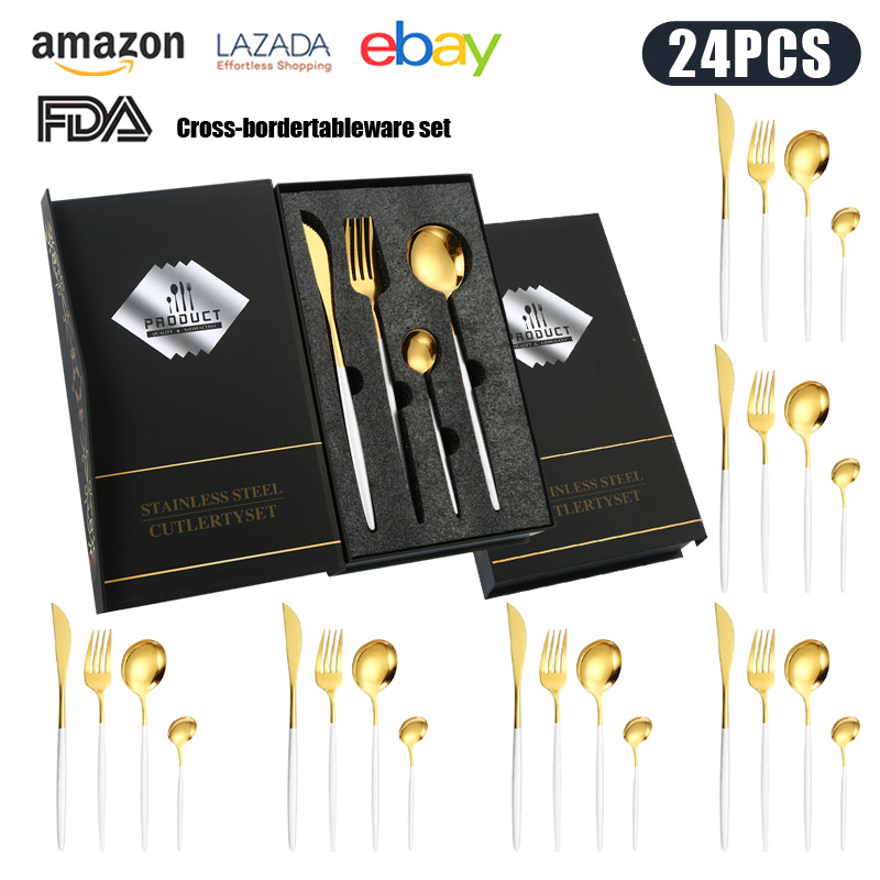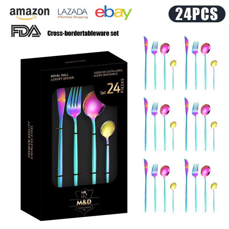 跨境热销葡萄牙不锈钢刀叉24件套餐具套装礼盒装镀钛金色西餐勺子