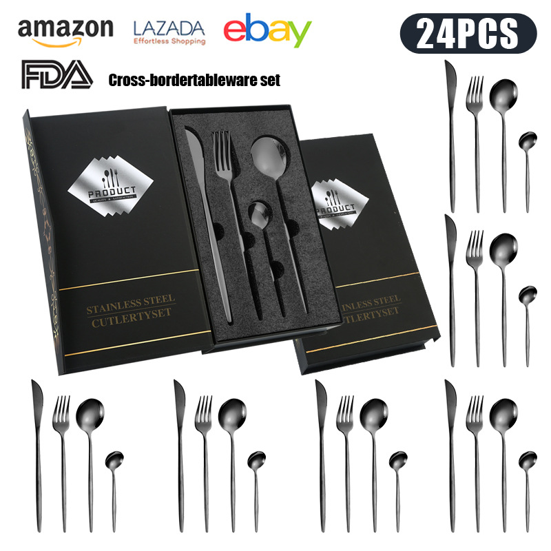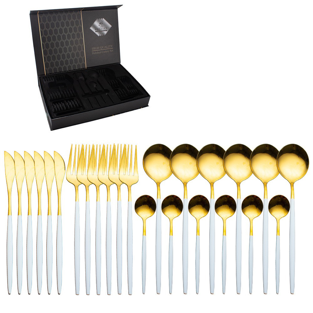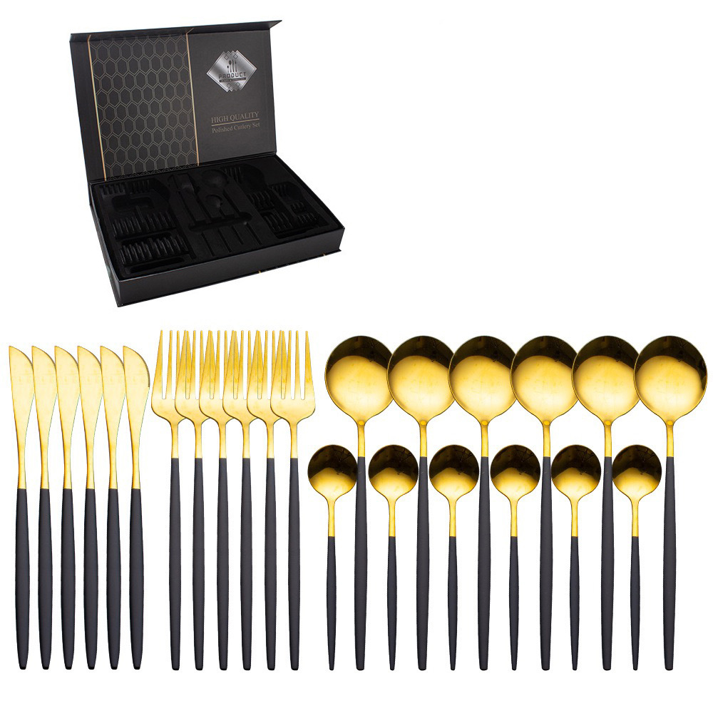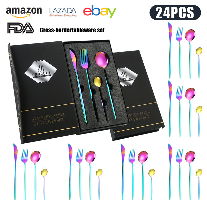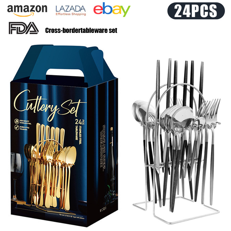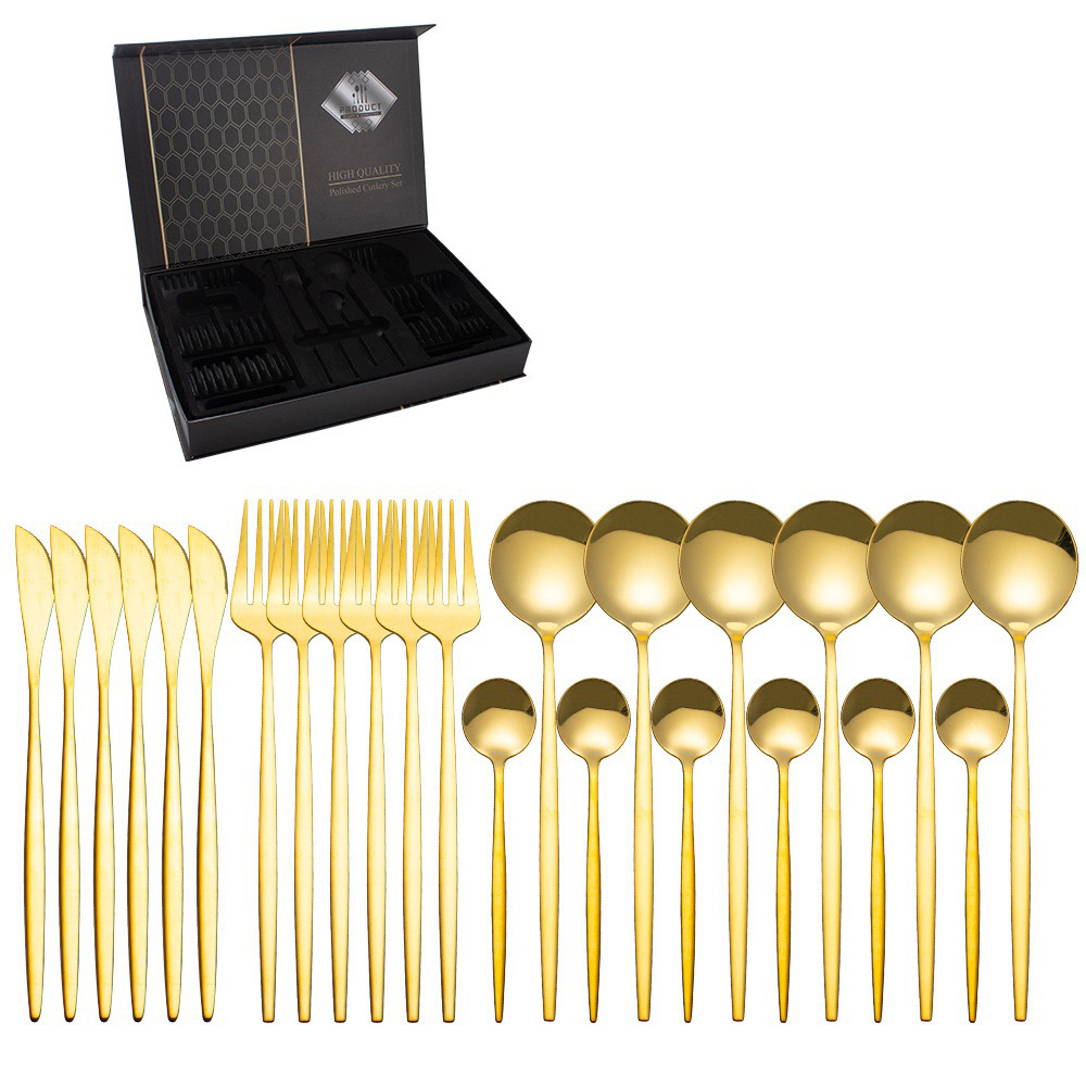 跨境热销葡萄牙不锈钢刀叉24件套餐具套装礼盒装镀钛金色西餐勺子