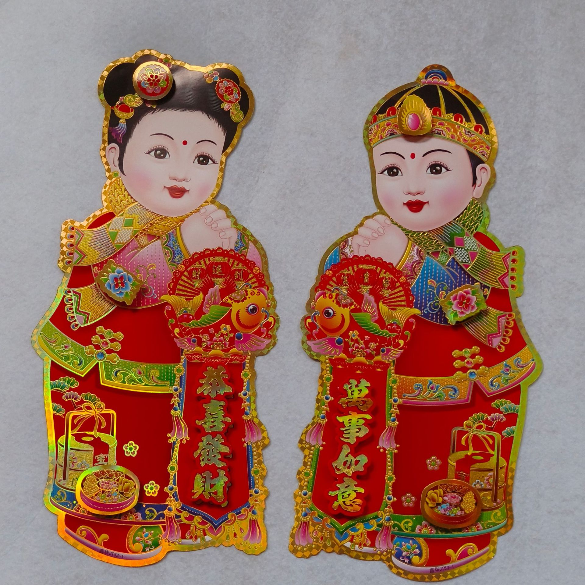 新款立体植绒金童玉女 福字门贴 春节年画窗贴 春节门画用品批发