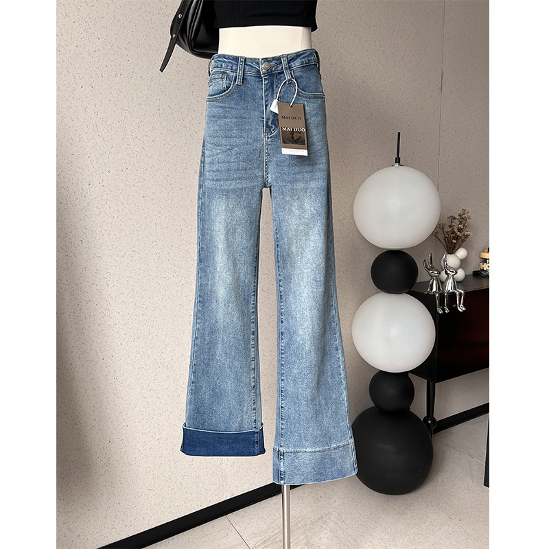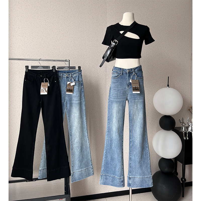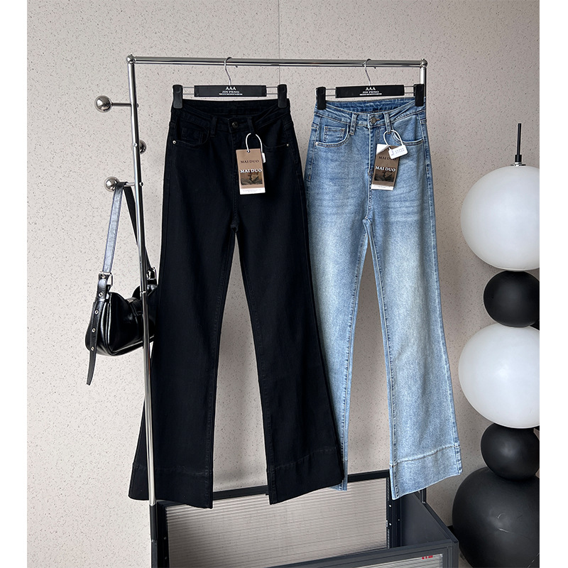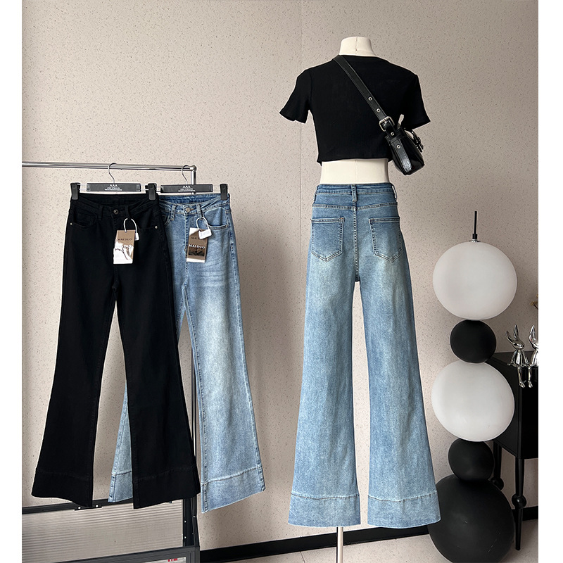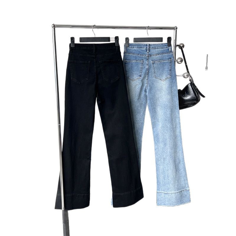 春秋新款黑色微弹水洗做旧显瘦长裤韩系复古微喇牛仔裤女