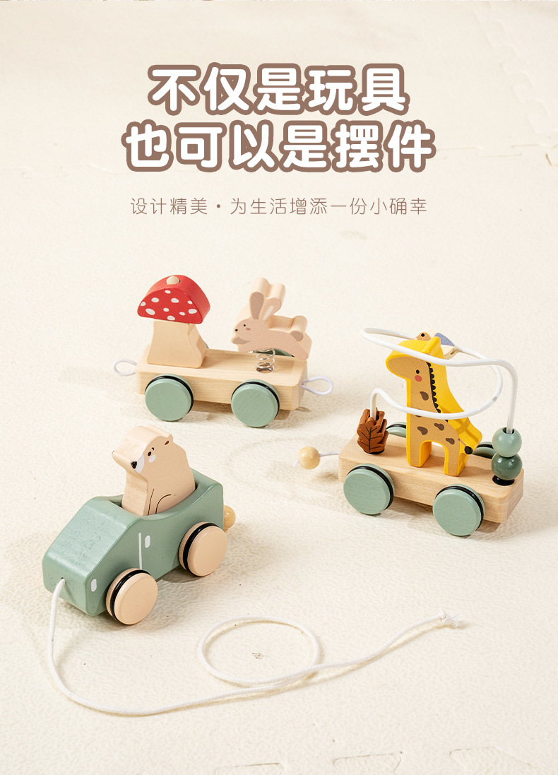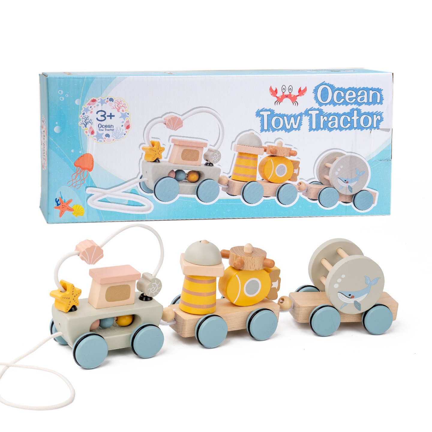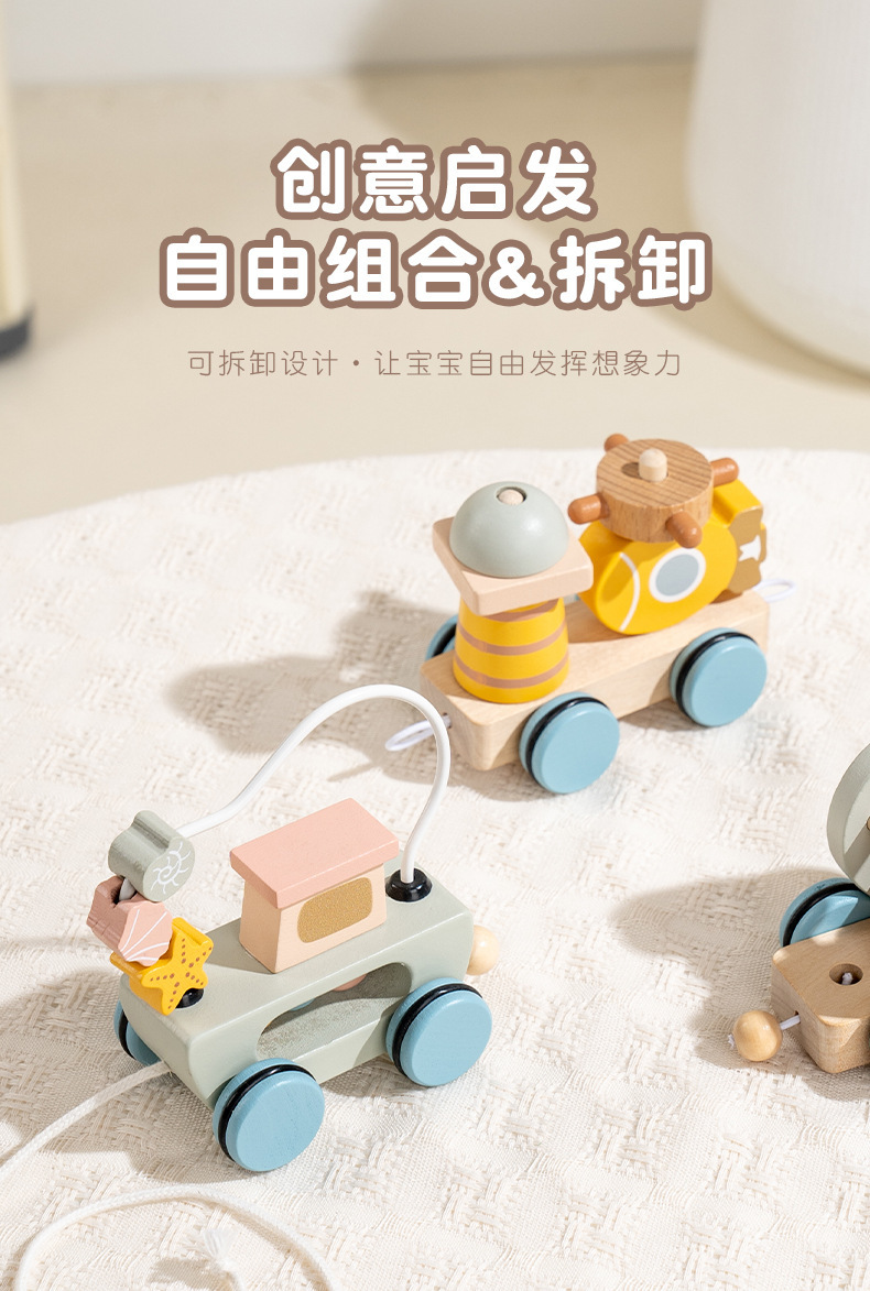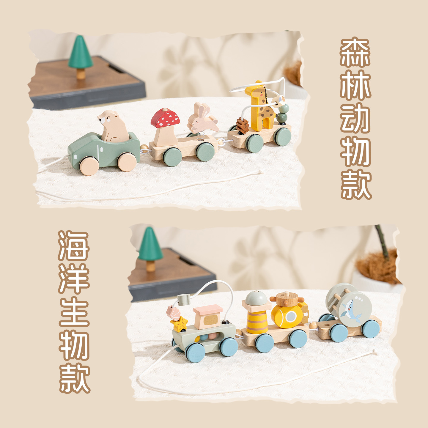 跨境儿童木制拖拉车宝宝早教积木亲子学步三节拉绳小拖车益智玩具