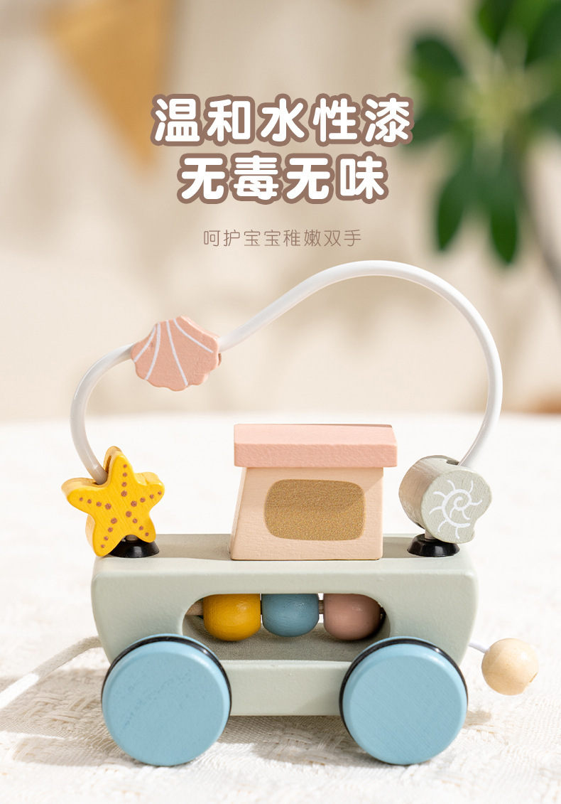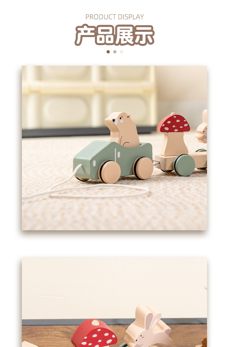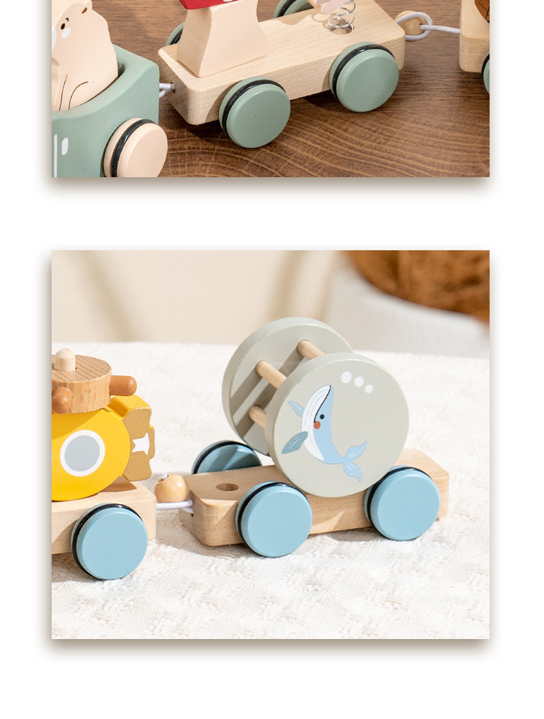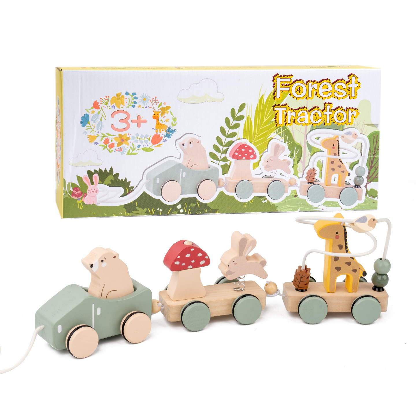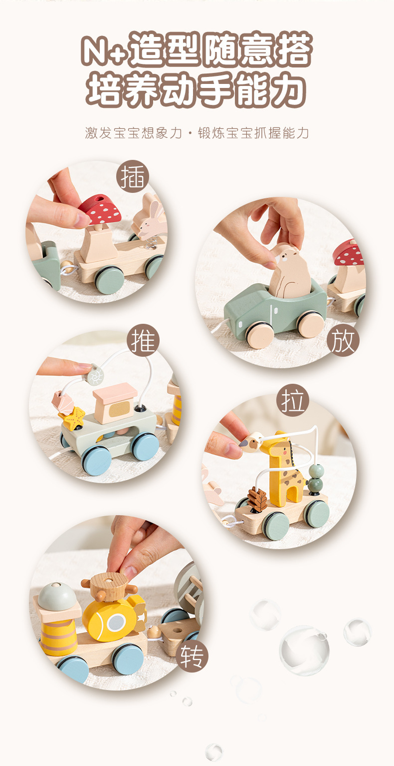 跨境儿童木制拖拉车宝宝早教积木亲子学步三节拉绳小拖车益智玩具