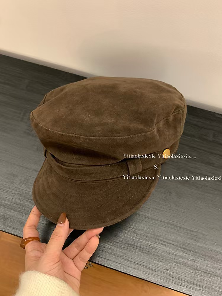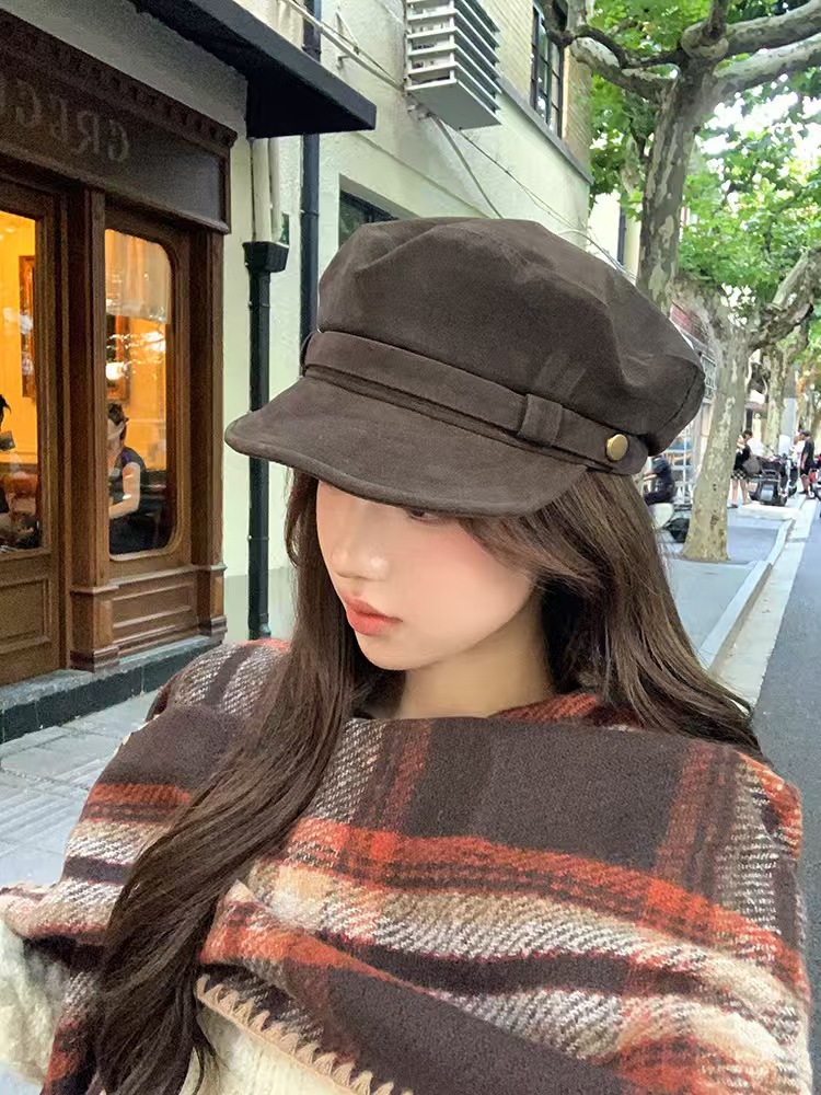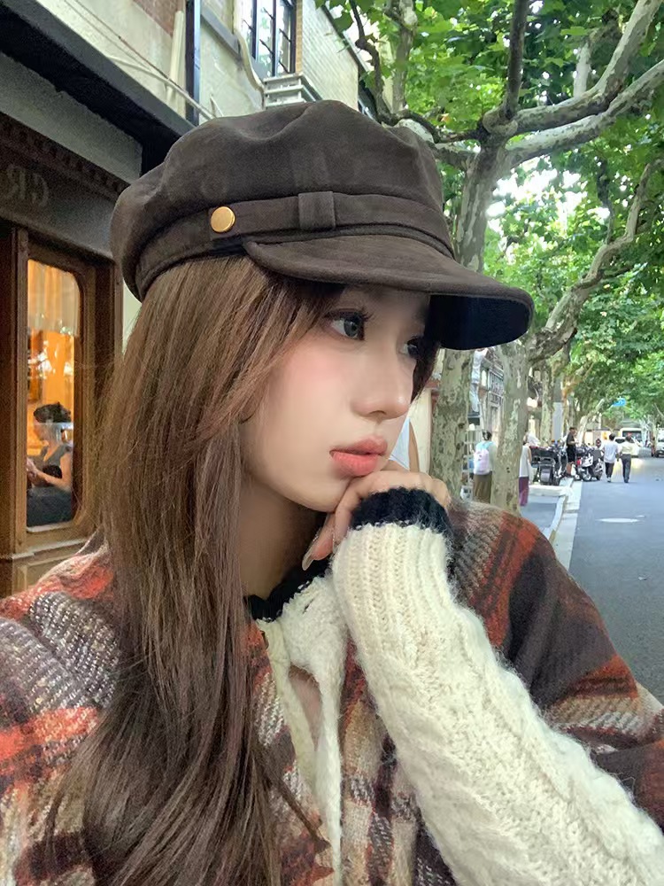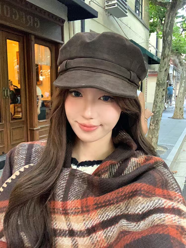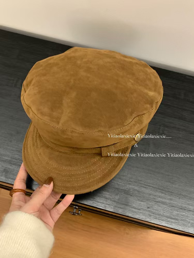 入秋氛围感美拉德~棕色麂皮平顶报童帽女秋冬复古英伦八角贝雷帽