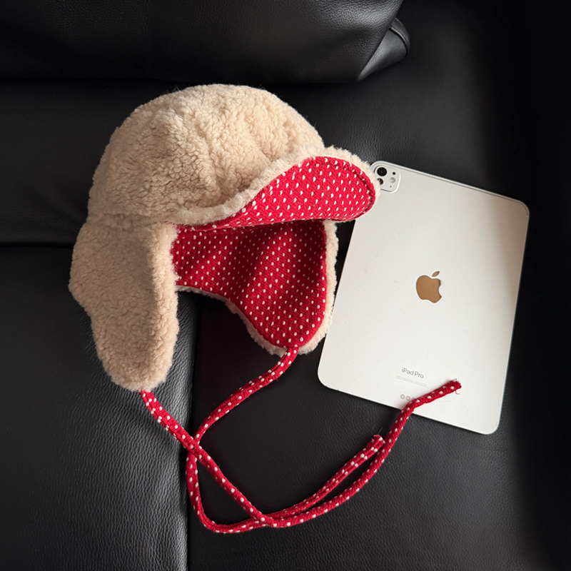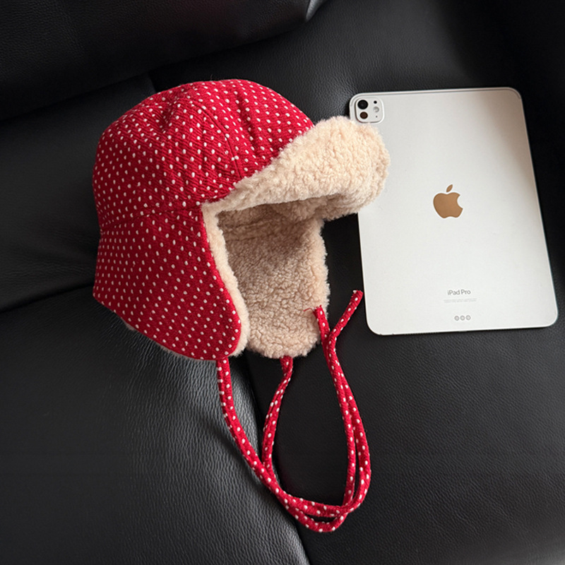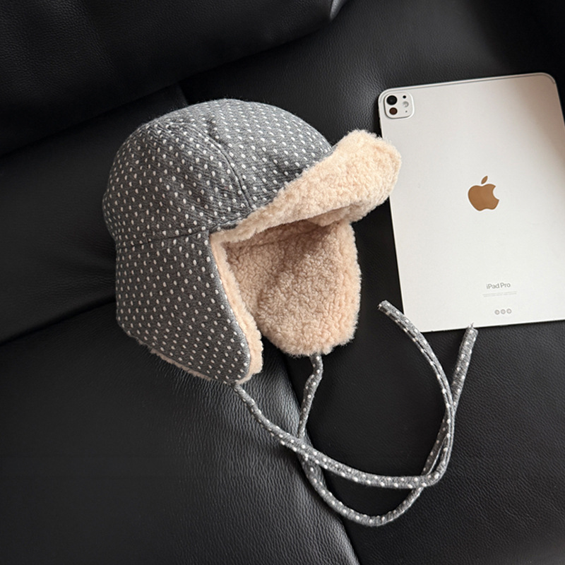 韩国可爱波点羊羔绒加厚雷锋帽女冬天骑车保暖护耳帽双面戴飞行帽