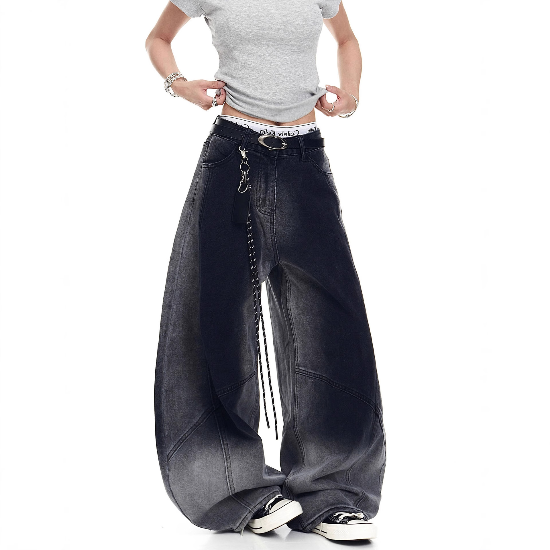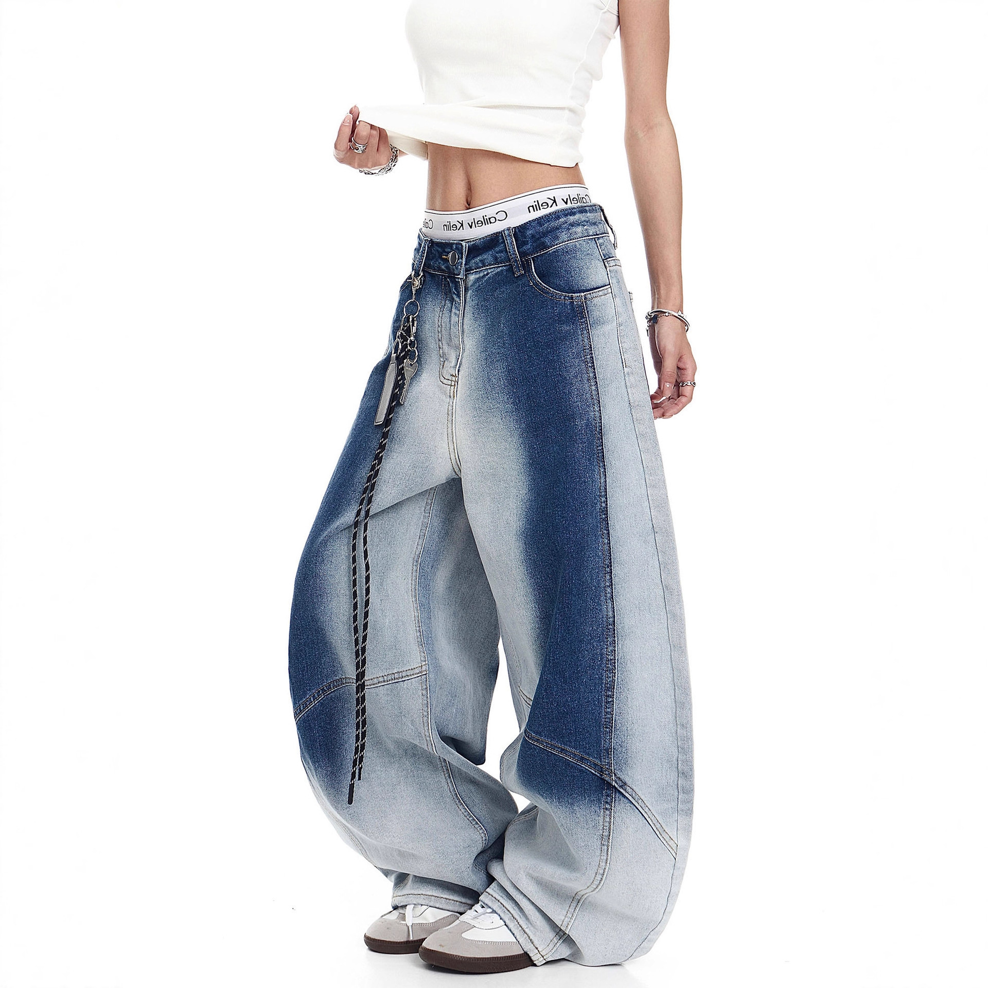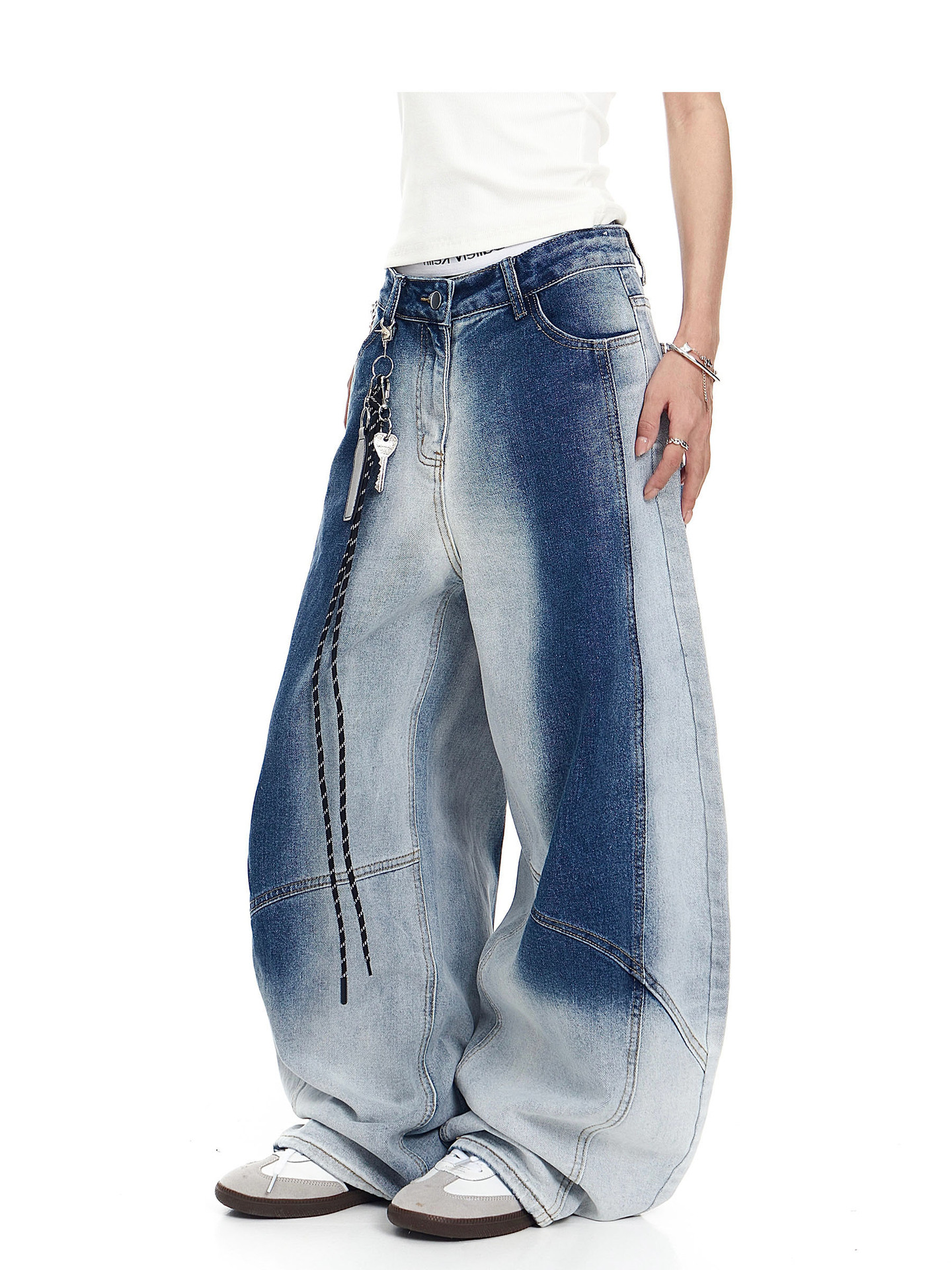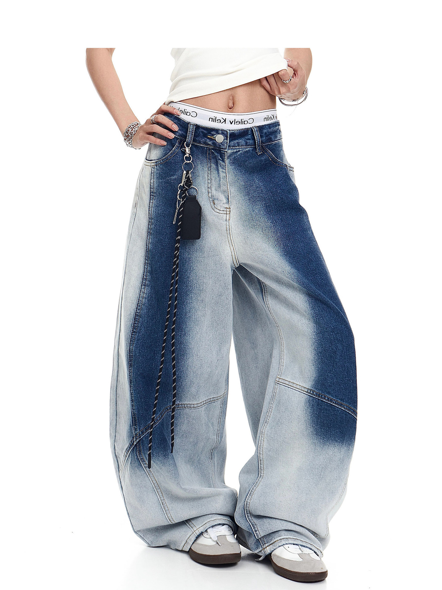 美式复古水洗渐变弯刀牛仔裤男女高街潮牌痞帅慵懒宽松休闲阔腿裤