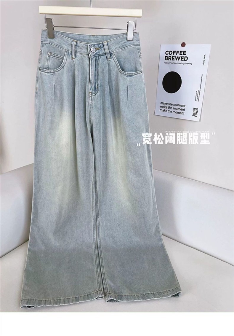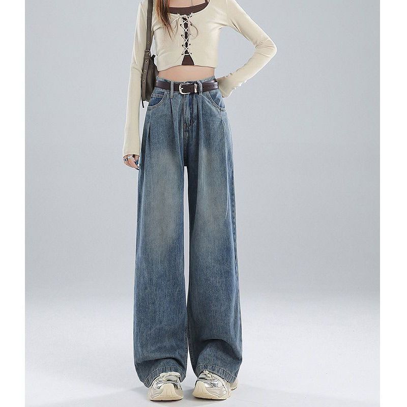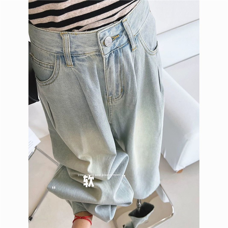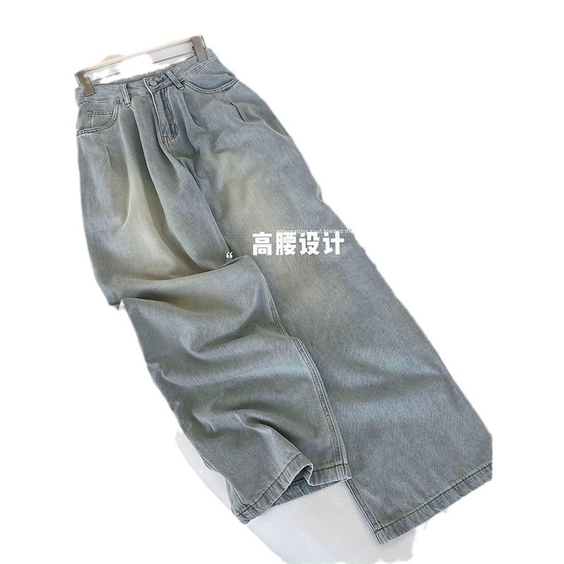 做旧高腰阔腿牛仔裤女新款宽松遮肉显瘦褶皱设计百搭修身直筒裤子