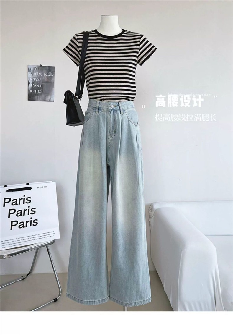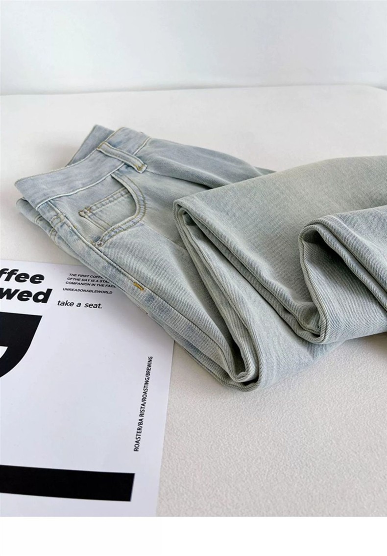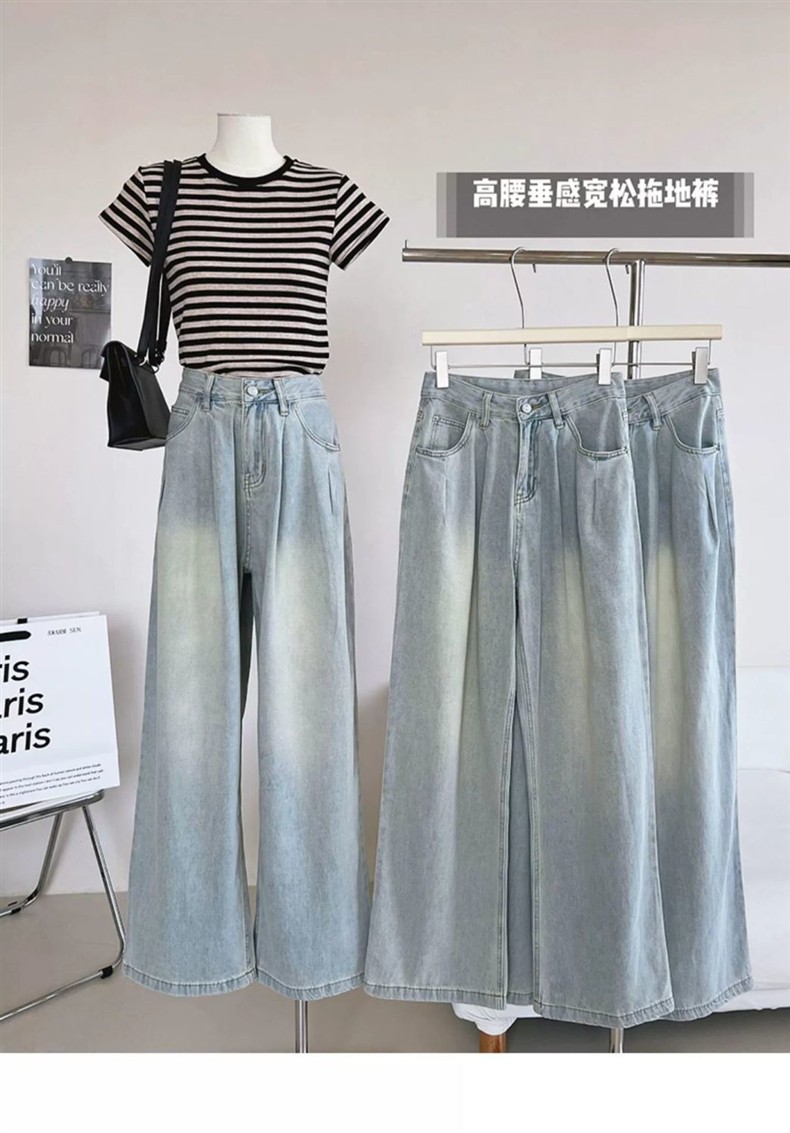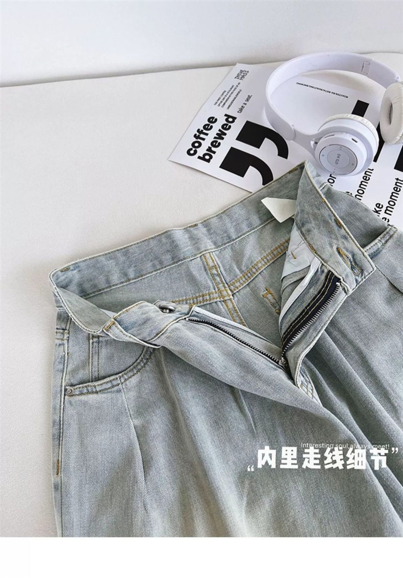 做旧高腰阔腿牛仔裤女新款宽松遮肉显瘦褶皱设计百搭修身直筒裤子