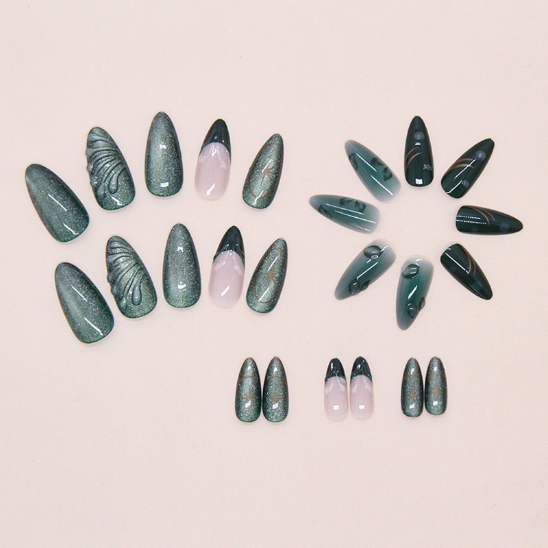 外贸立体绿色波纹法式猫眼清冷感可拆卸穿戴甲24片press on nails