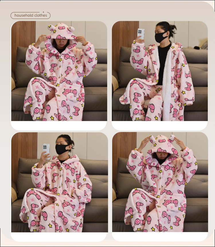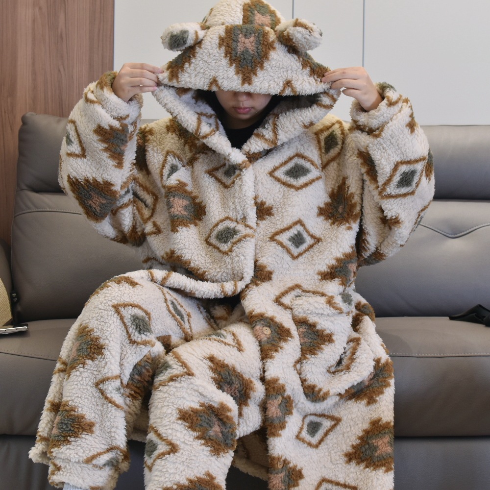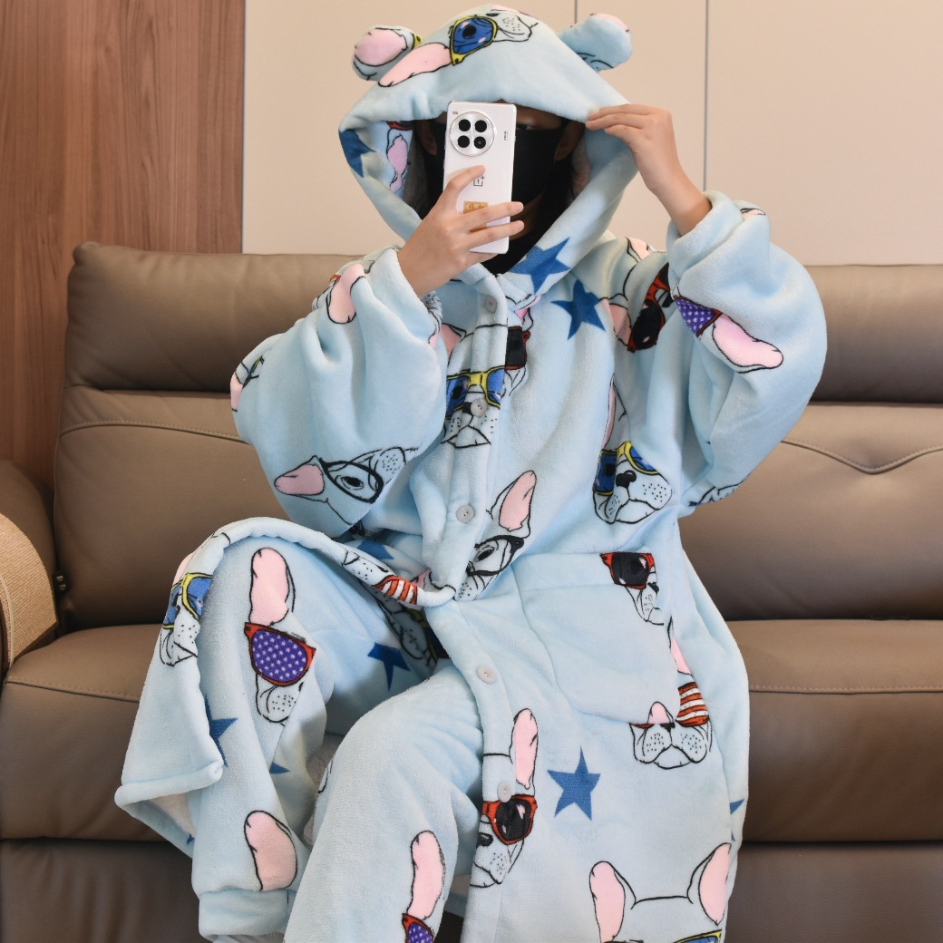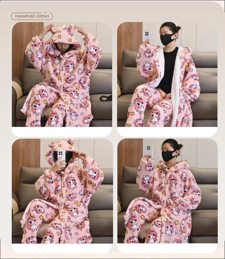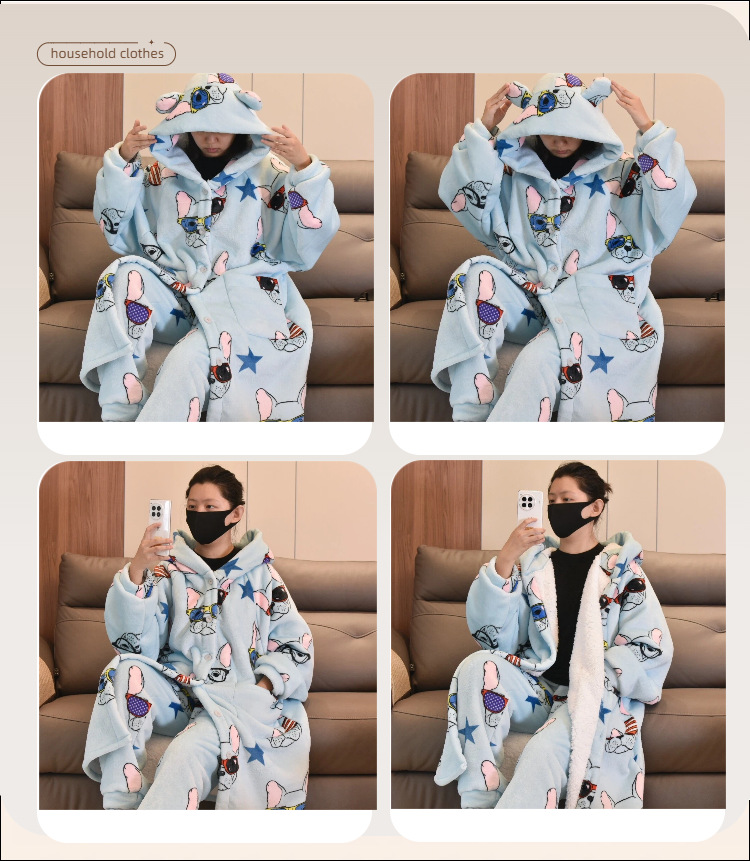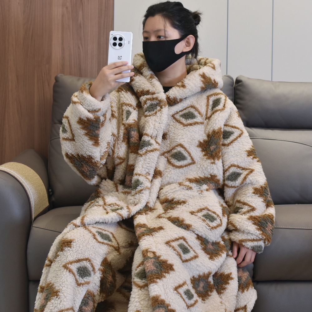 超厚睡衣羊羔绒冬季连帽纽扣青少年休闲居家保暖加厚家居服可外穿