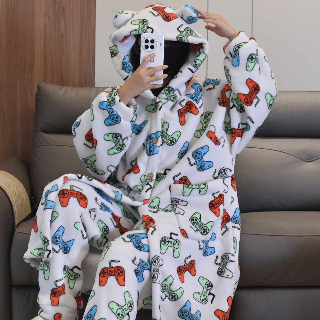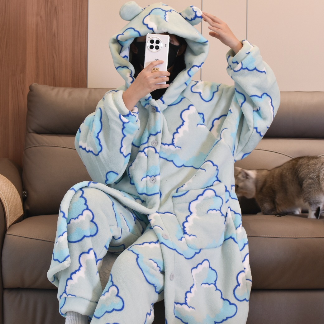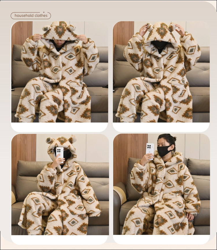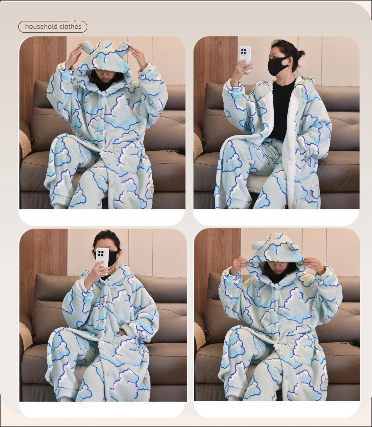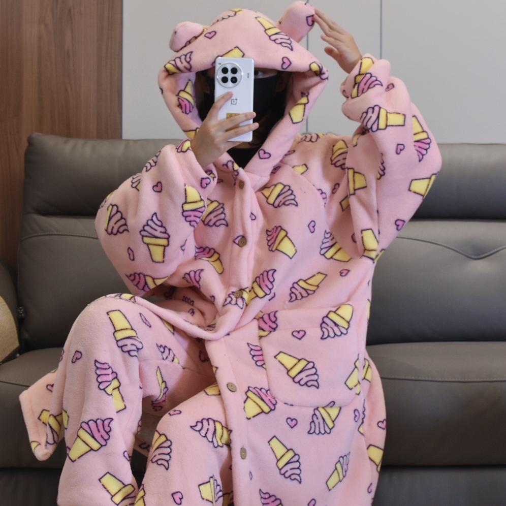 超厚睡衣羊羔绒冬季连帽纽扣青少年休闲居家保暖加厚家居服可外穿