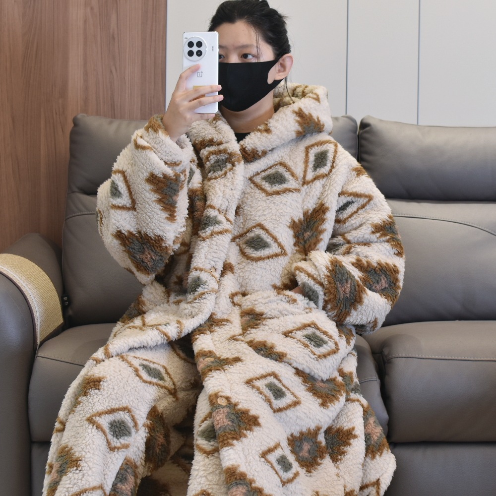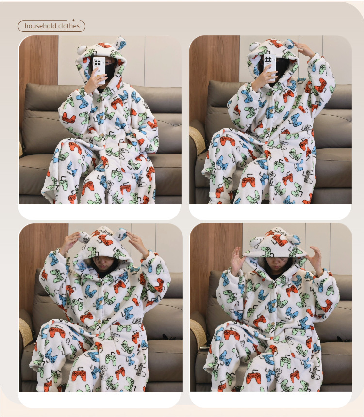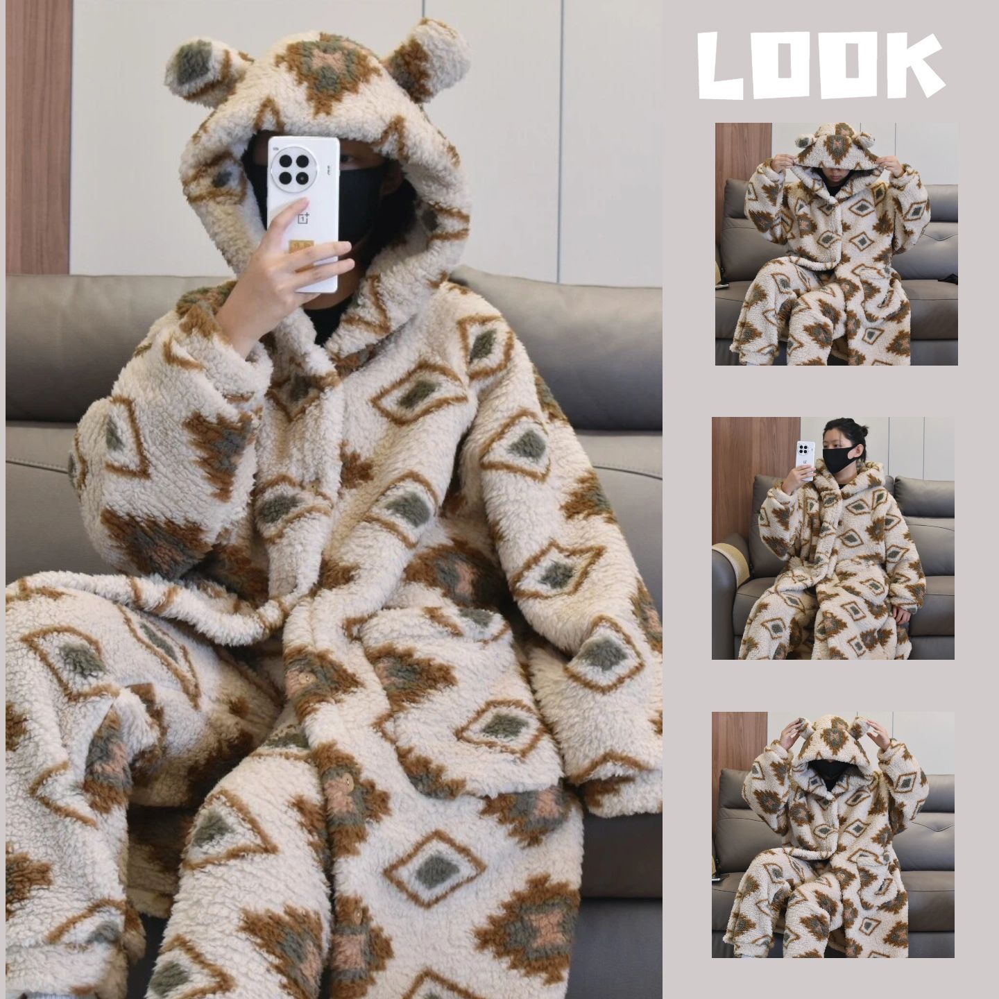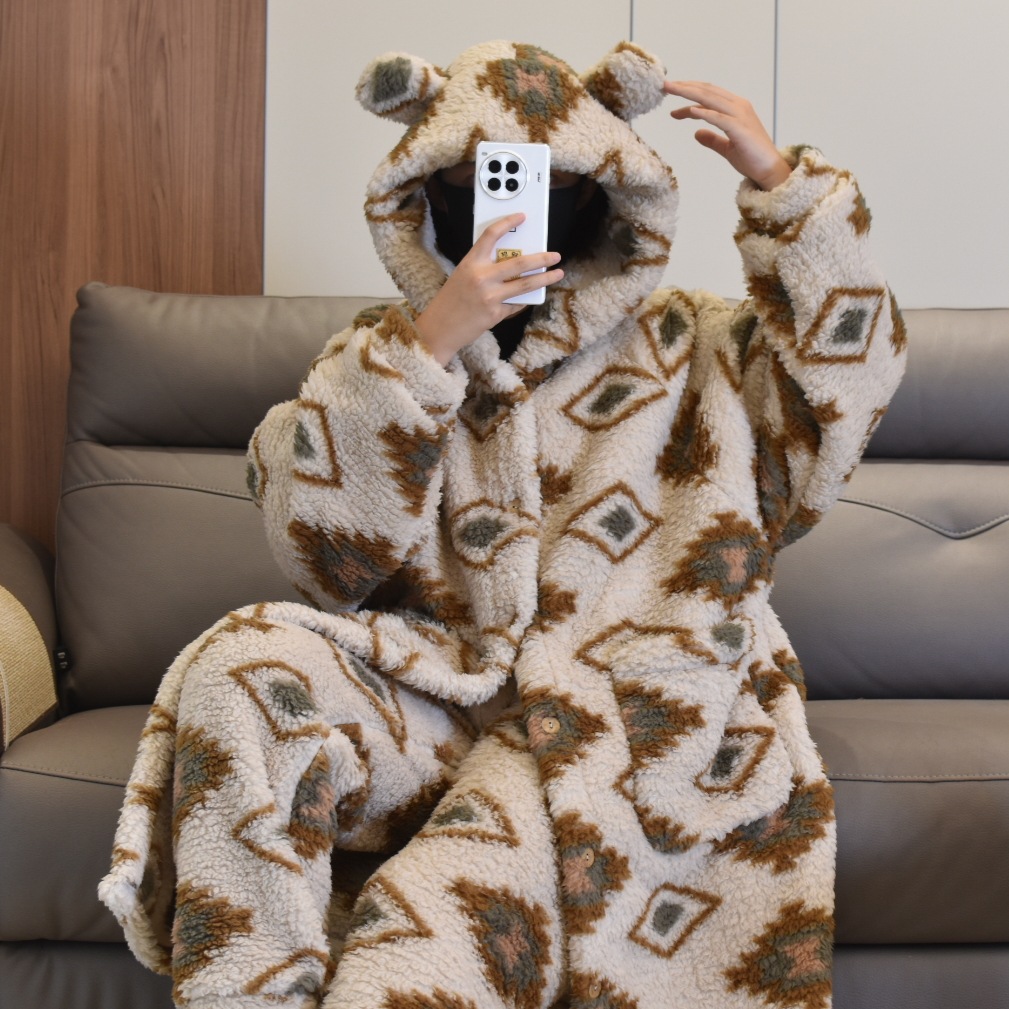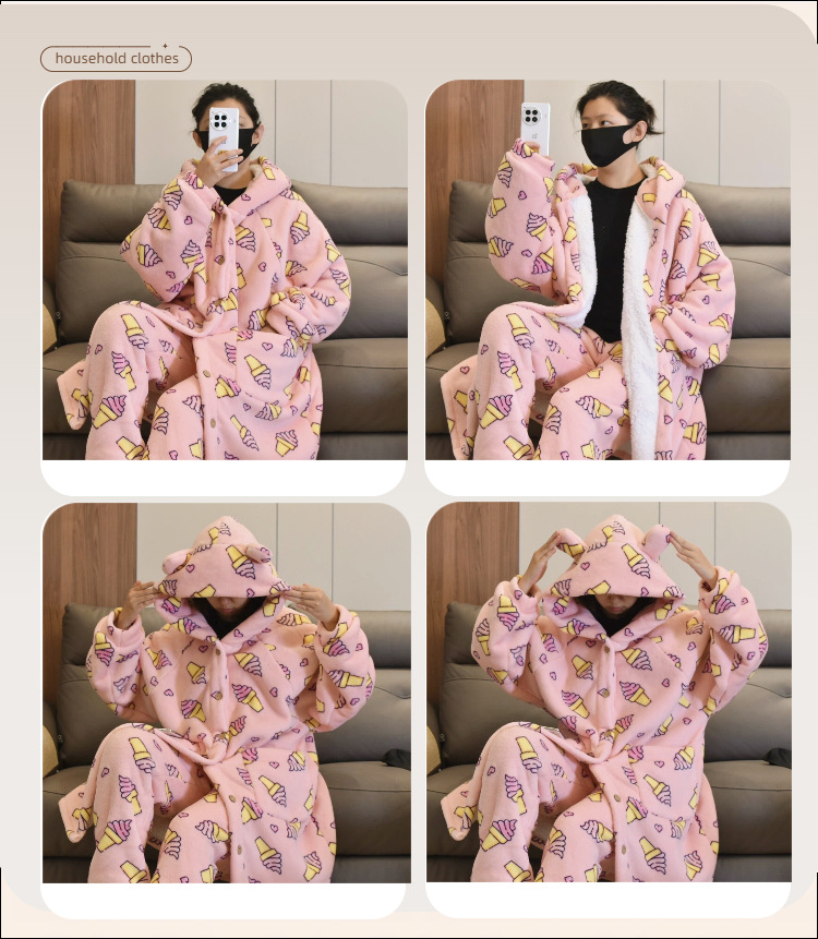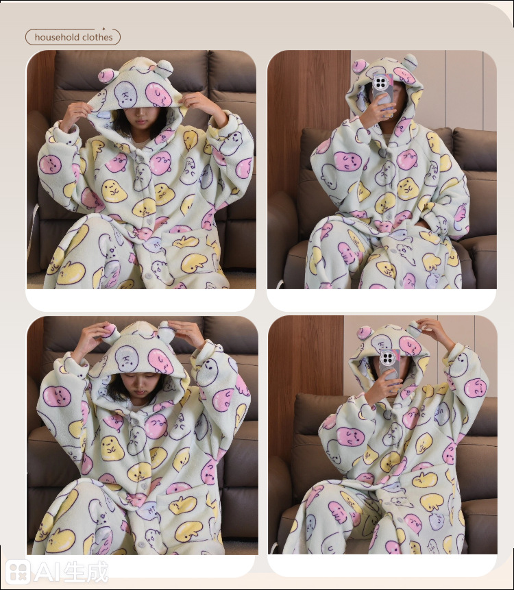 超厚睡衣羊羔绒冬季连帽纽扣青少年休闲居家保暖加厚家居服可外穿