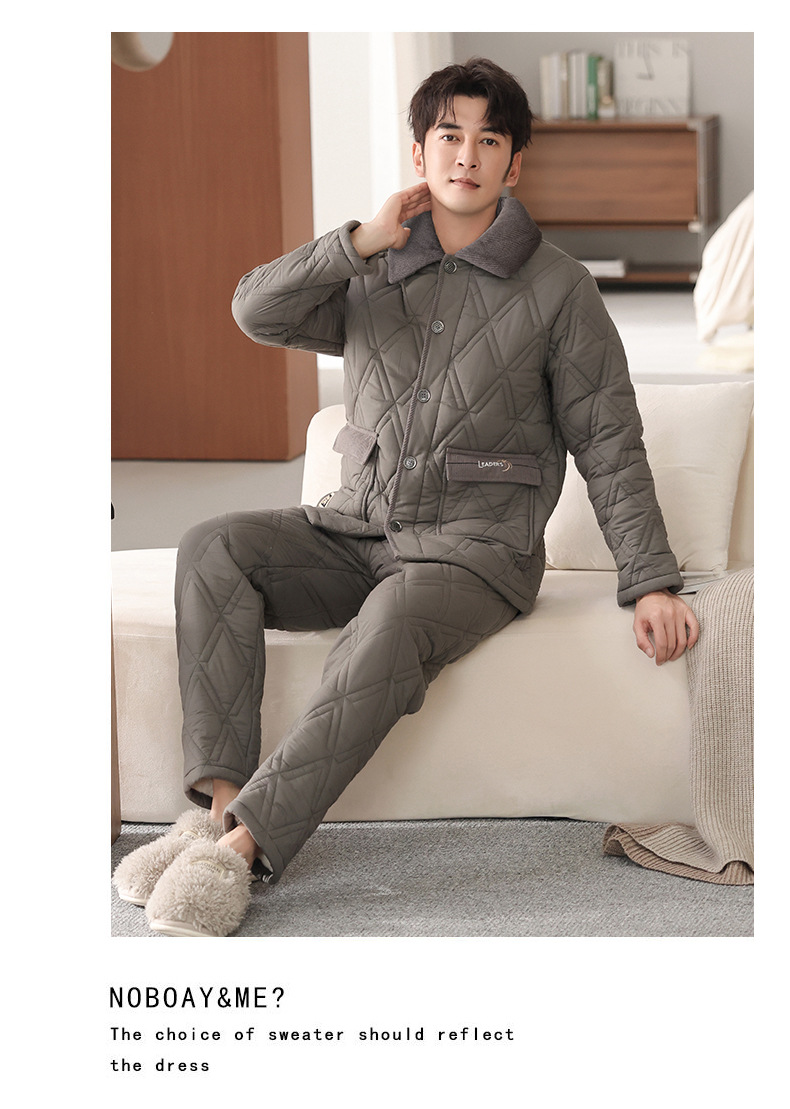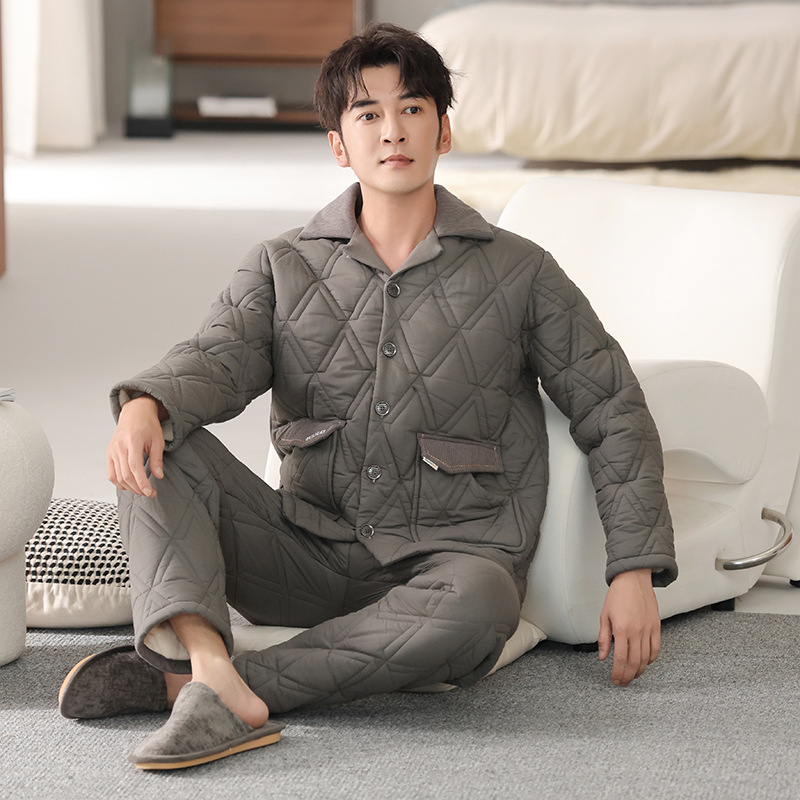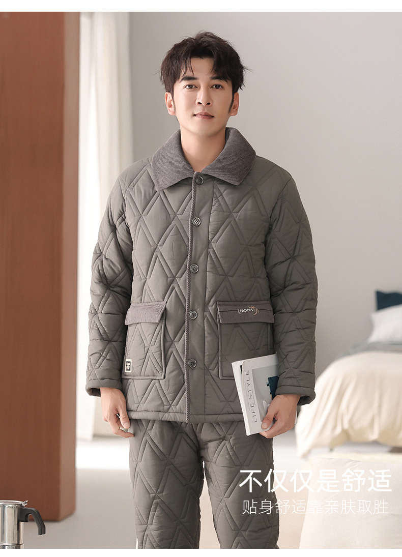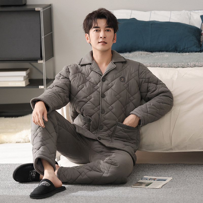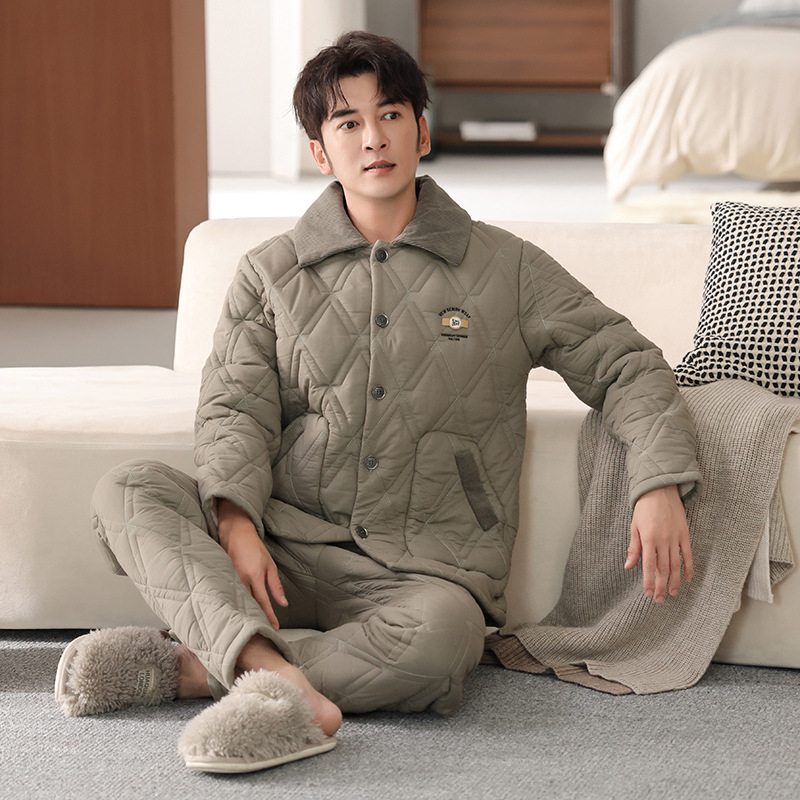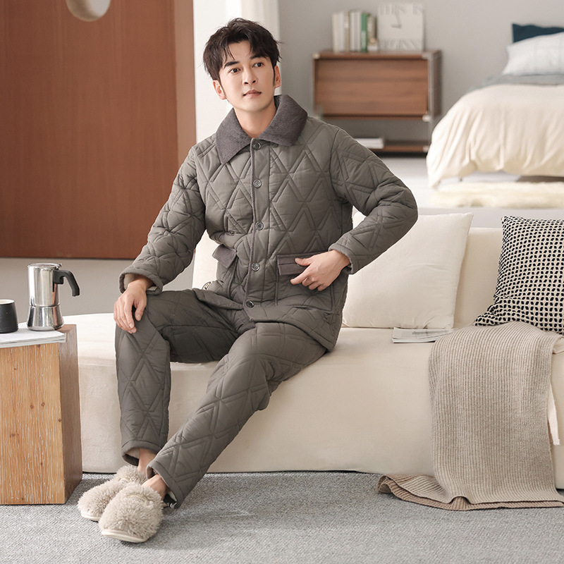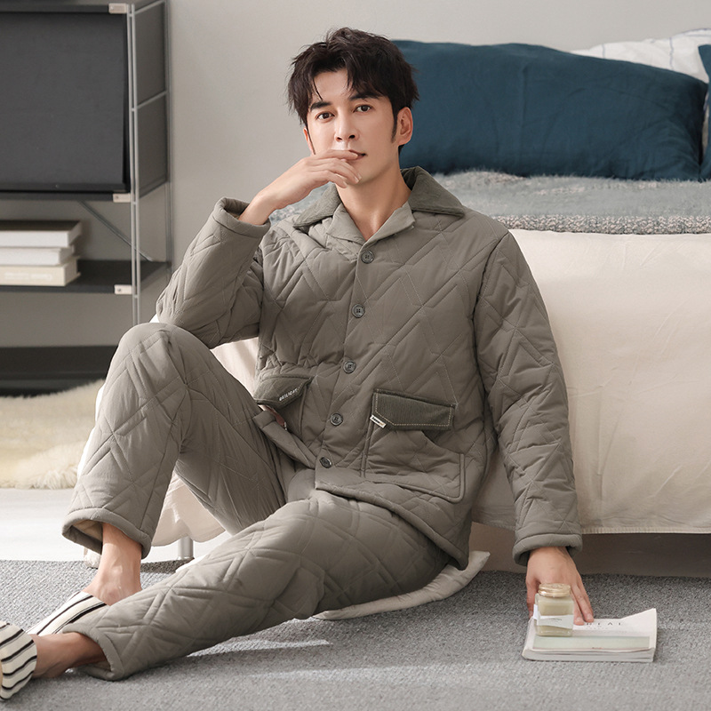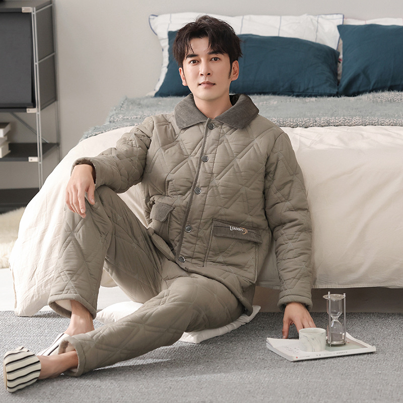 100%纯棉三层加厚夹棉冬季男士睡衣棉袄秋冬款男式大码居家服套装