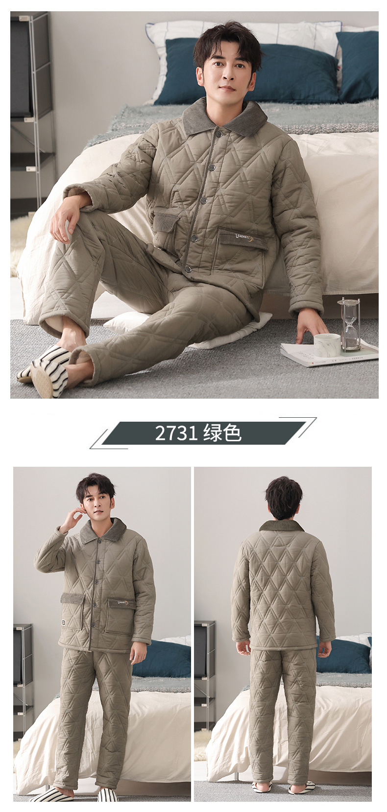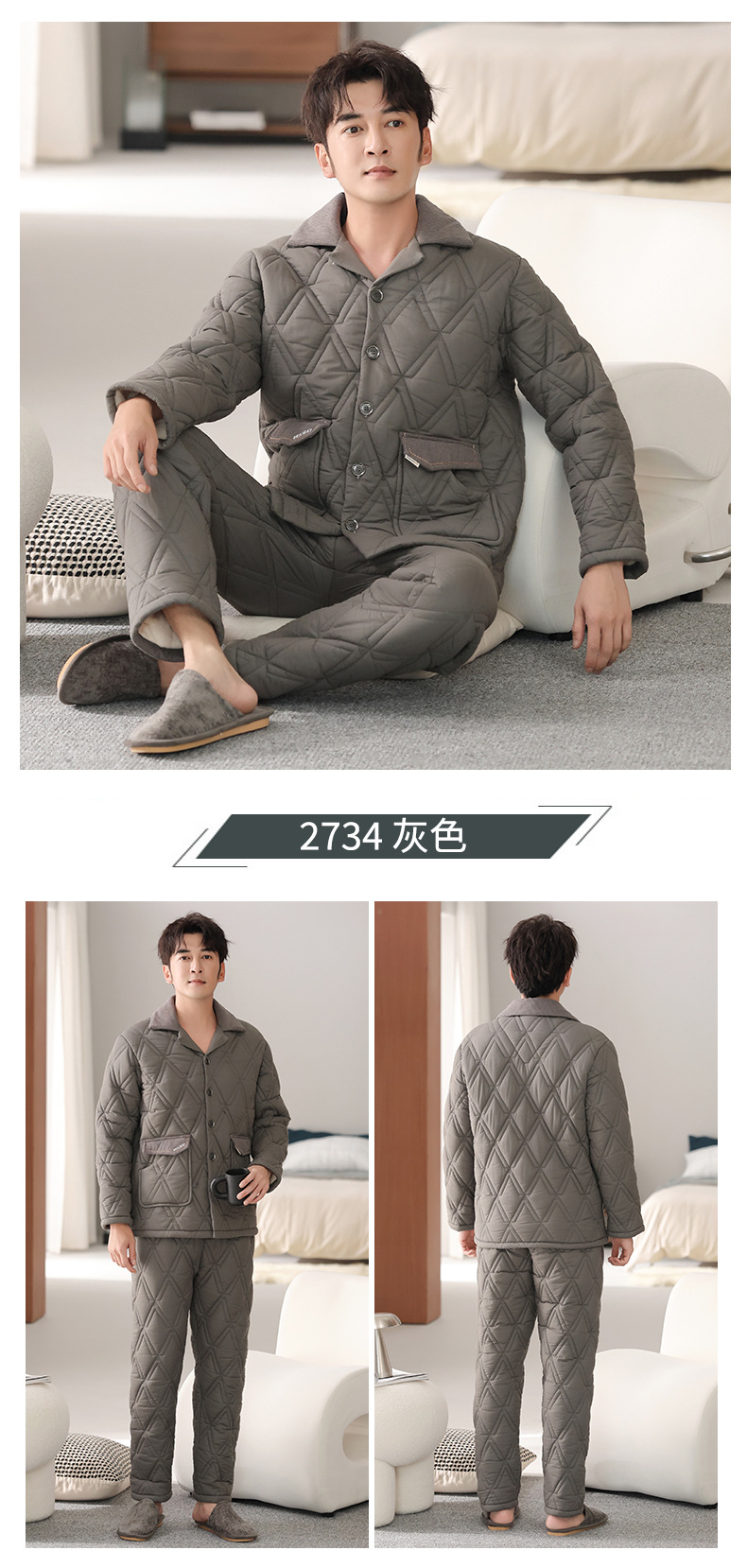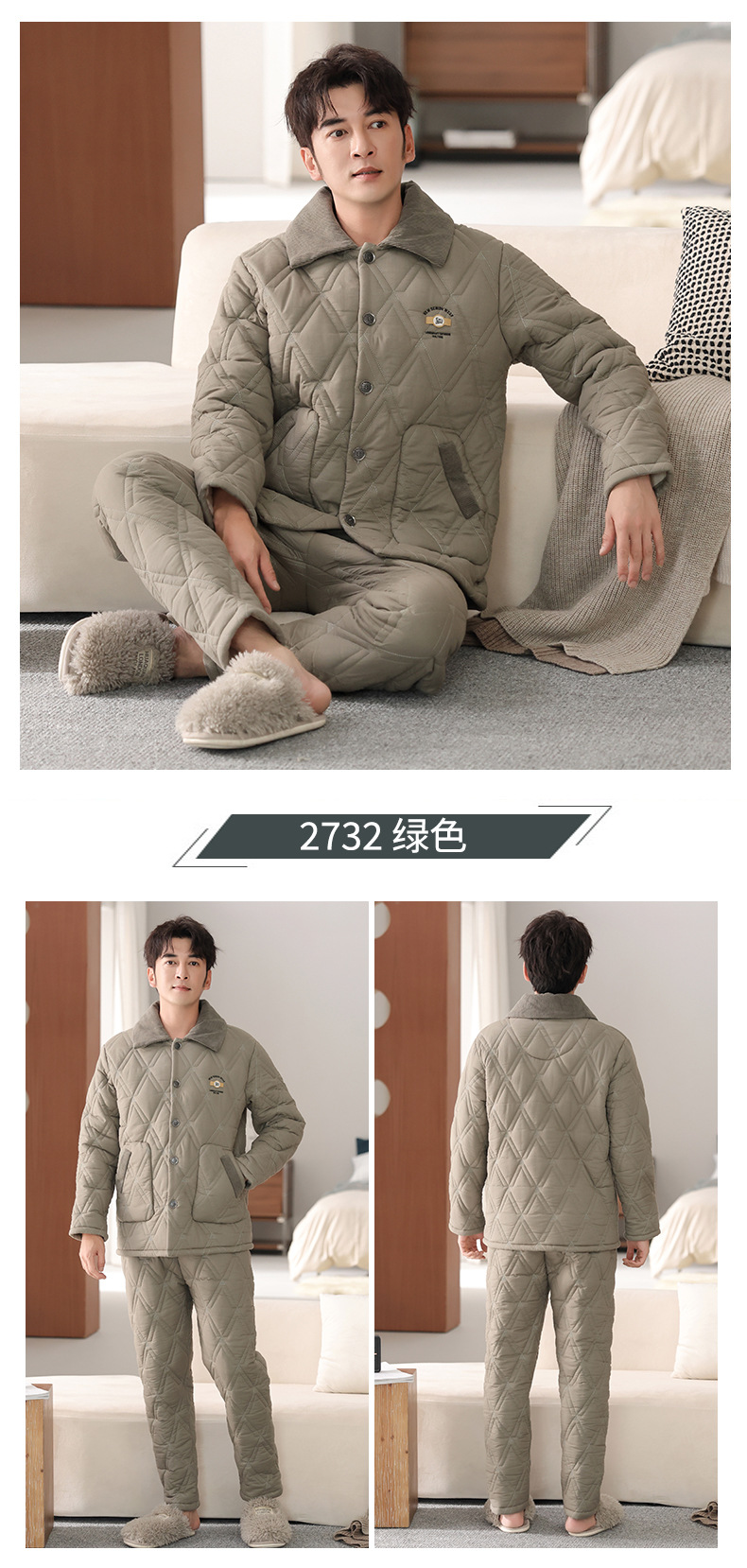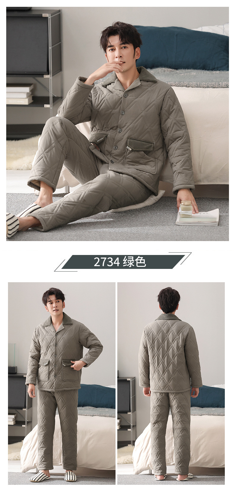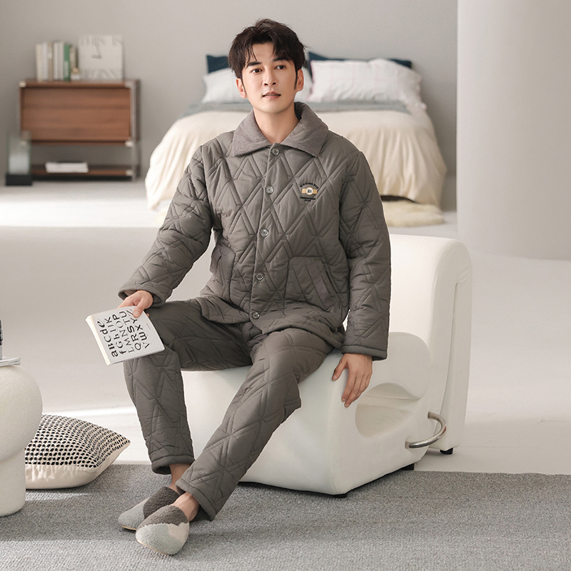 100%纯棉三层加厚夹棉冬季男士睡衣棉袄秋冬款男式大码居家服套装