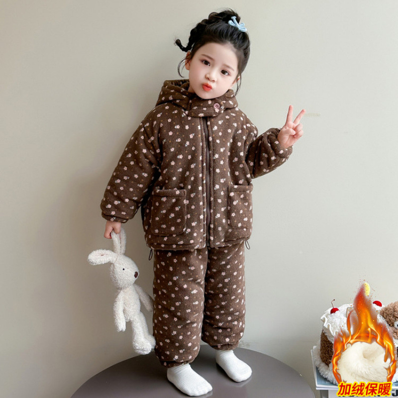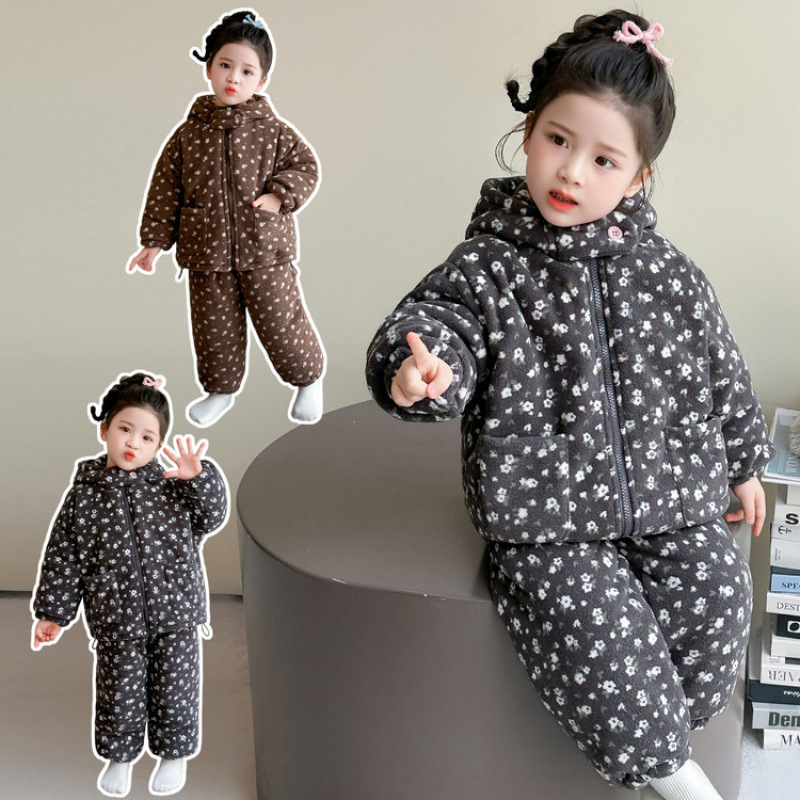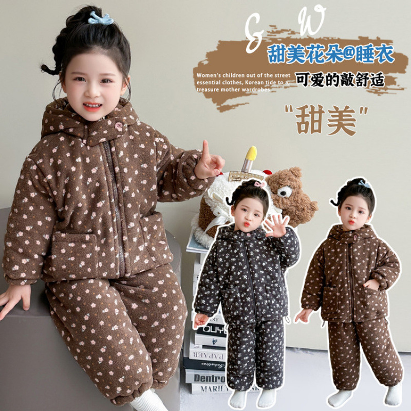 女童睡衣三层夹棉2025新款秋冬季珊瑚绒小女孩家居服套装简约款潮