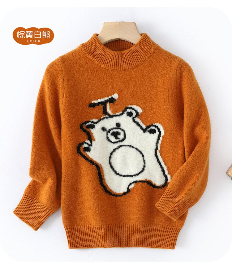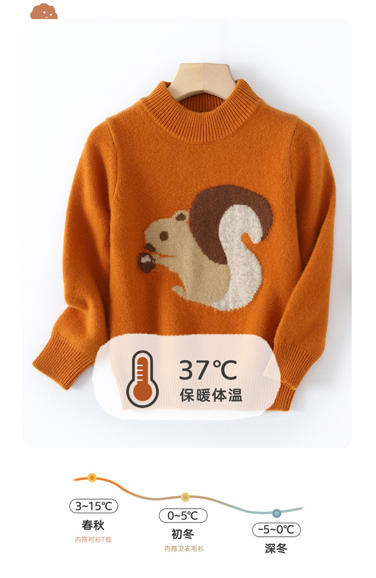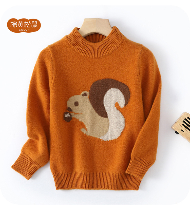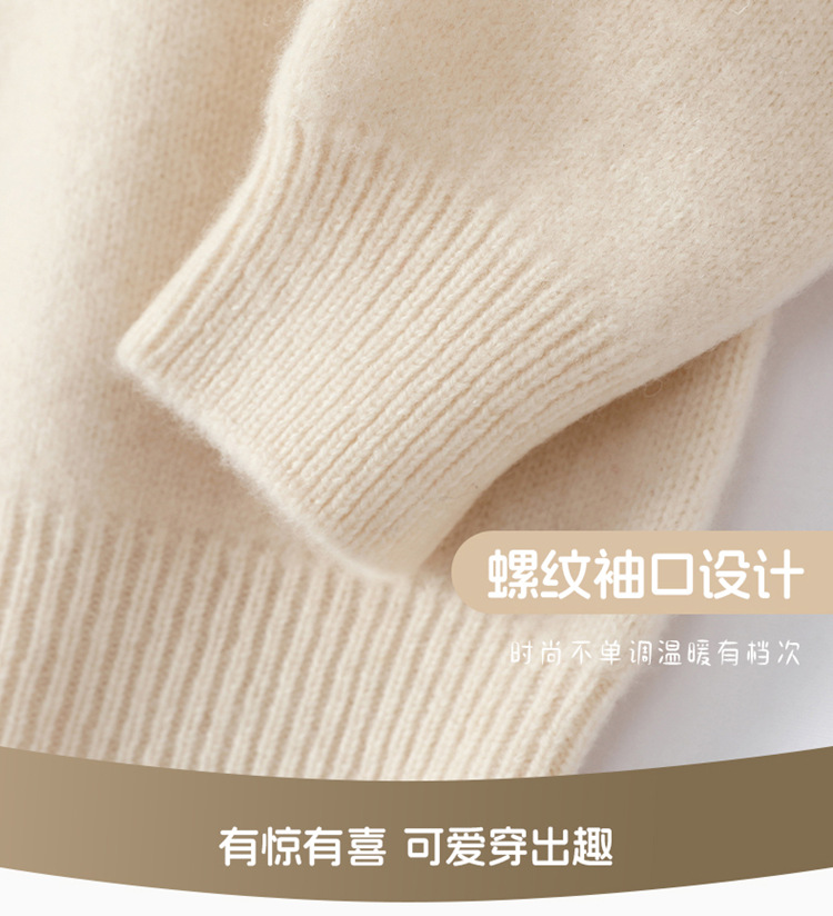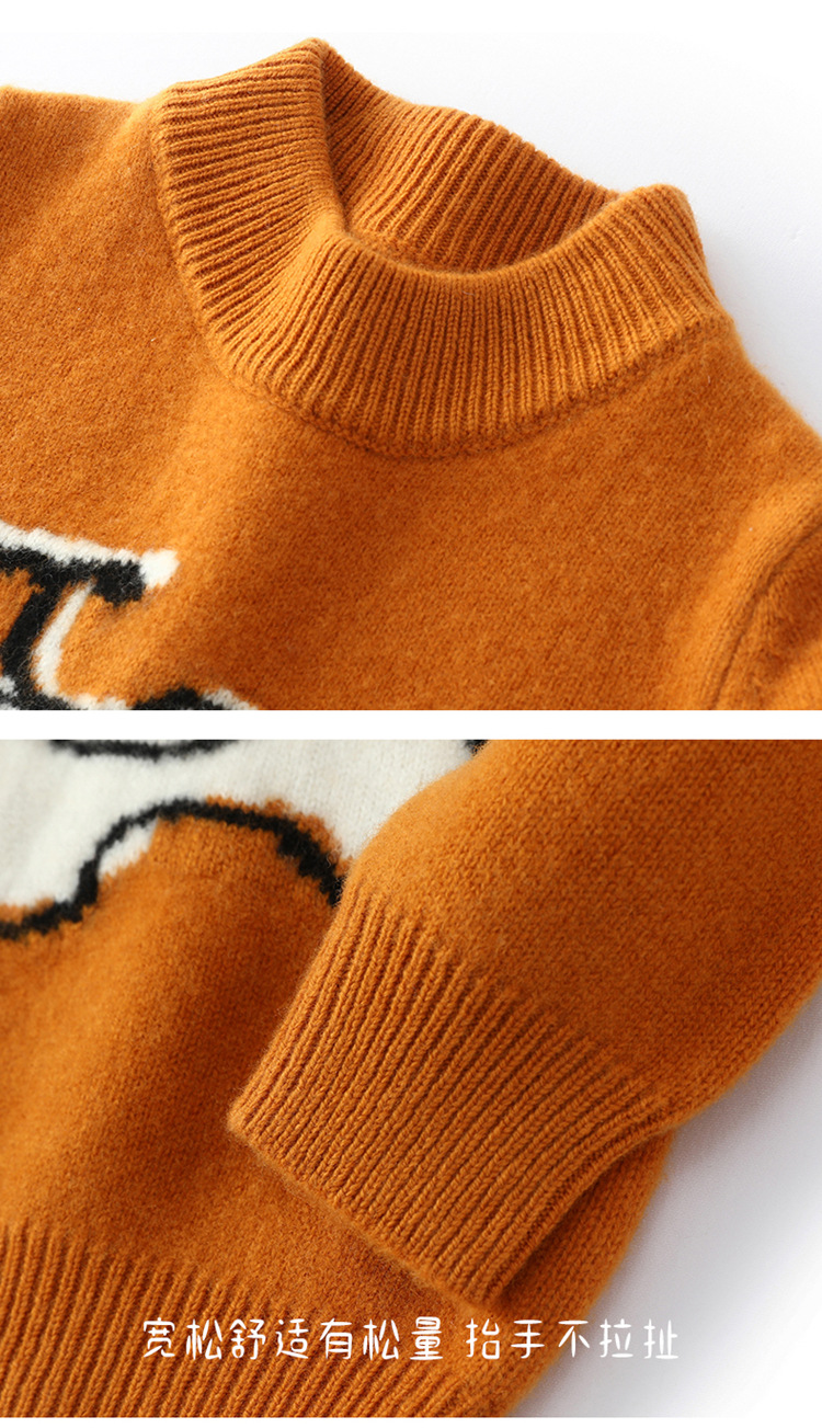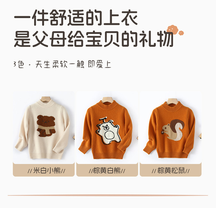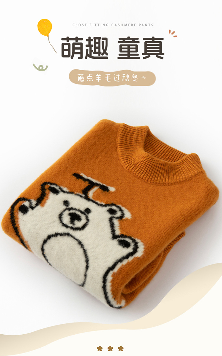 儿童100%纯羊毛衫秋冬中大童圆领毛衣男童女童棕色卡通宝宝针织衫
