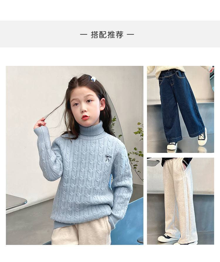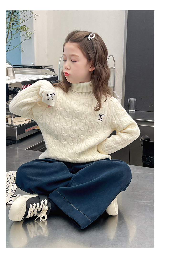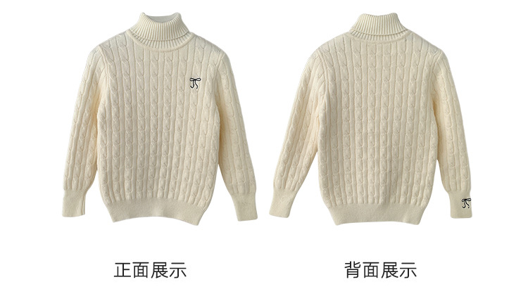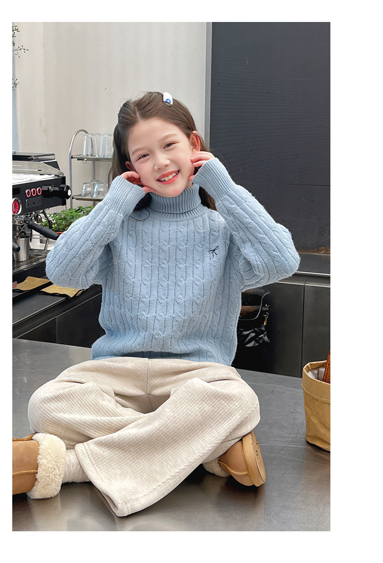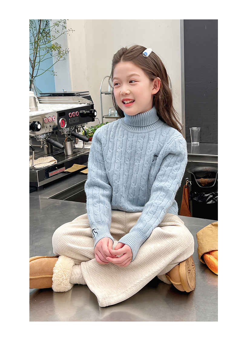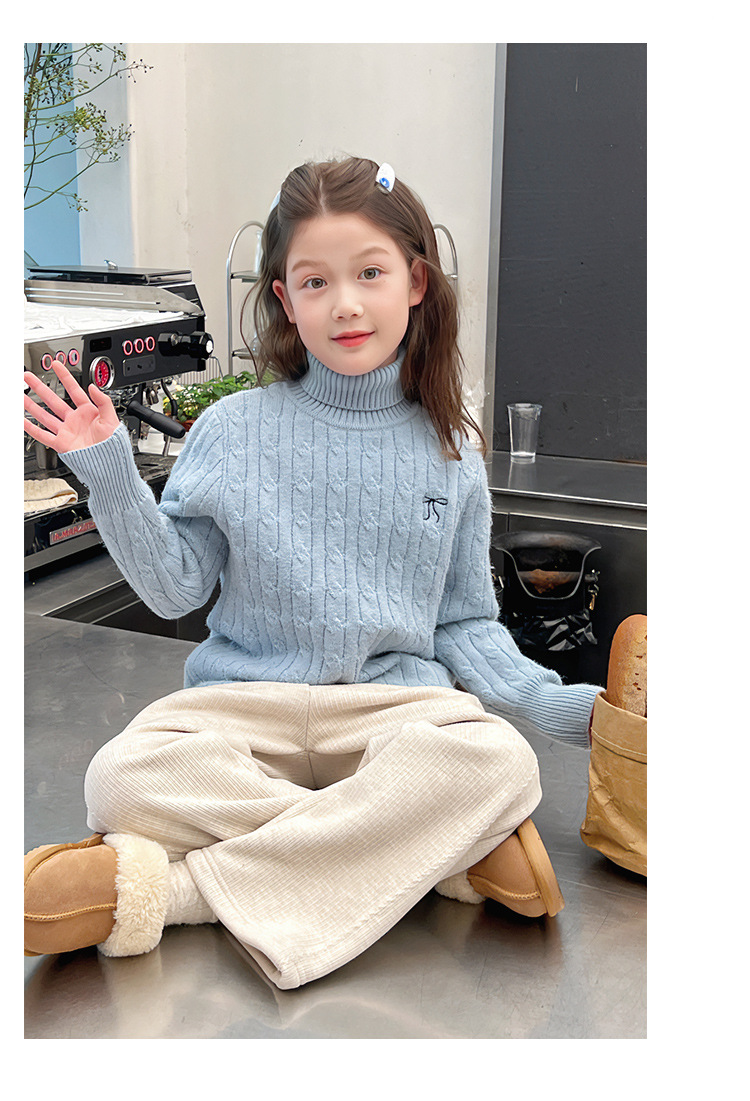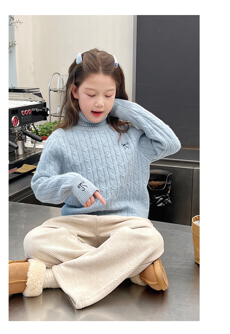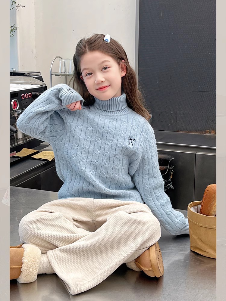 一体绒女童高领毛衣儿童翻领针织衫大童装绞花上衣2025冬装新款