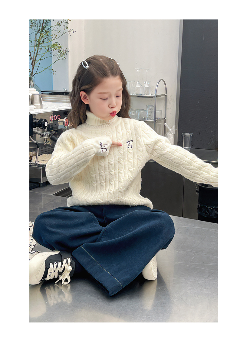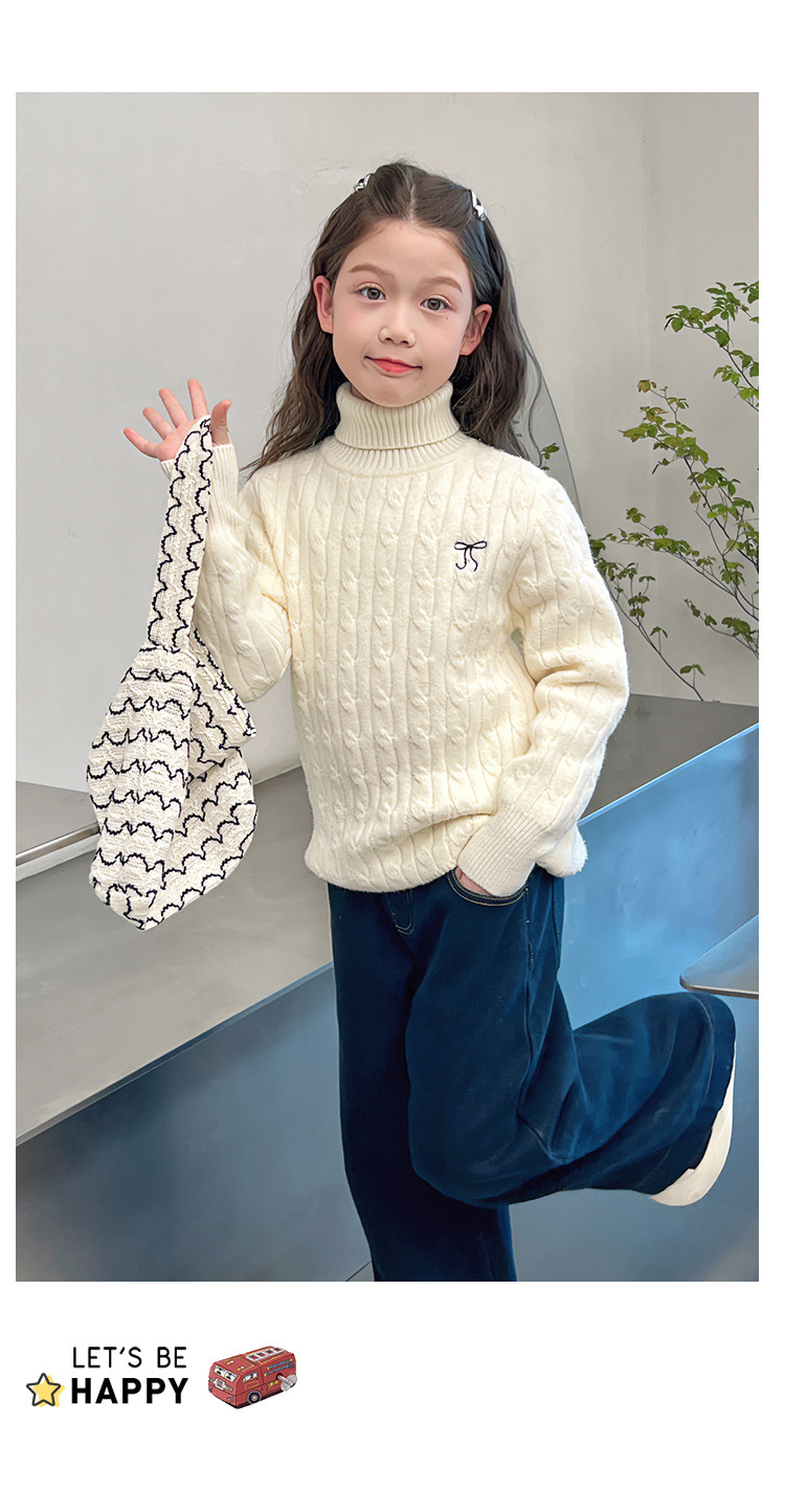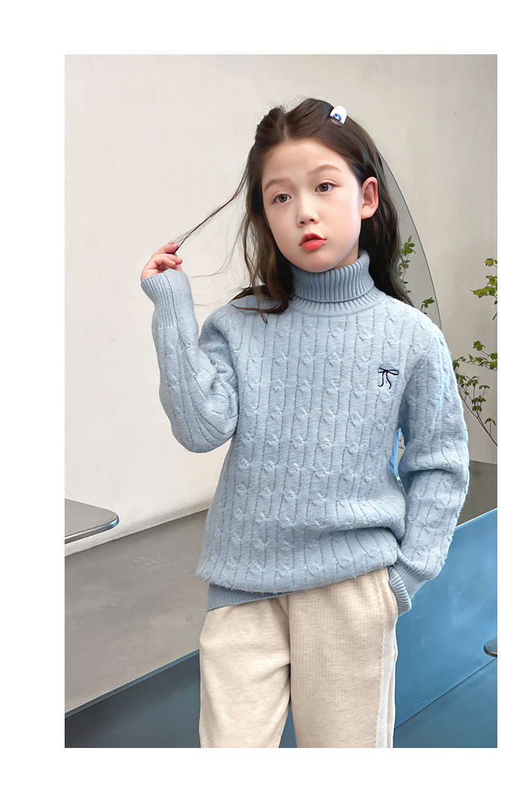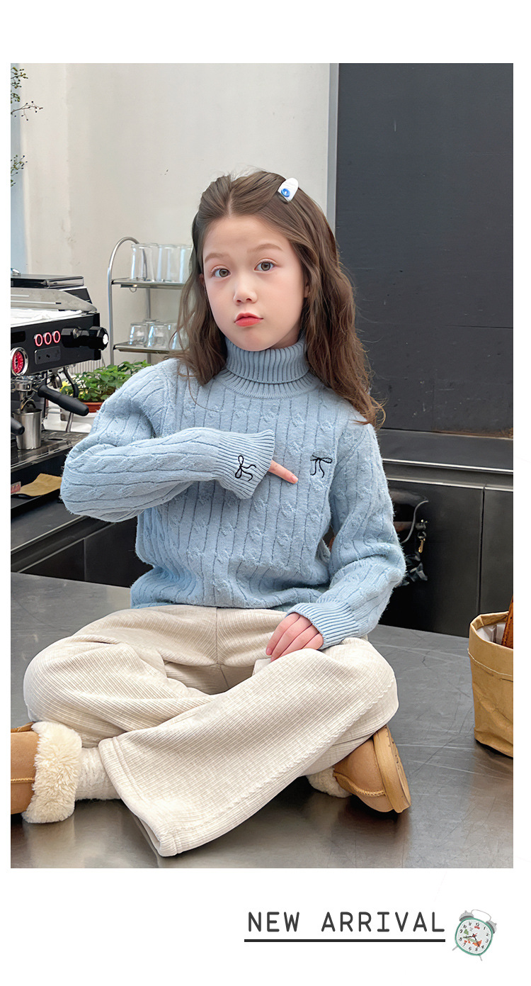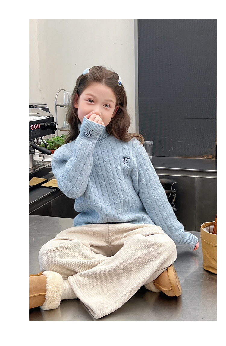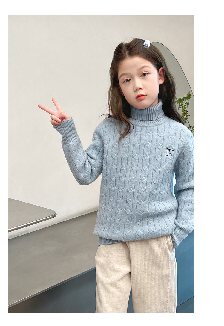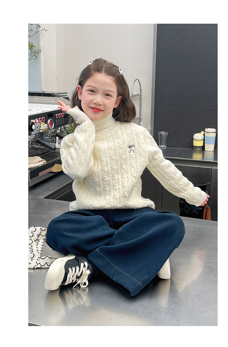 一体绒女童高领毛衣儿童翻领针织衫大童装绞花上衣2025冬装新款