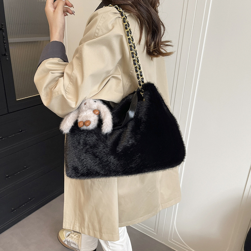 跨境毛绒绒包包女大容量2025新款秋冬季百搭链条斜挎包毛毛托特包