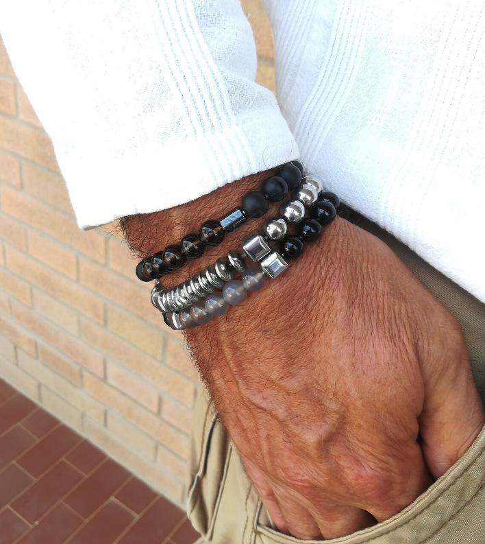 跨境新款男士串珠手链套装 地图石黑胆石十字架手链弹力手串组合