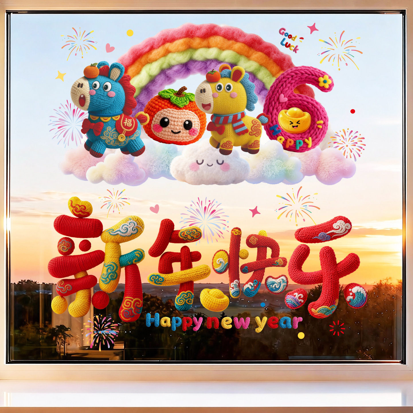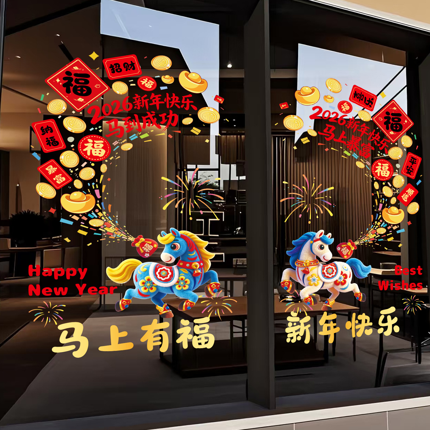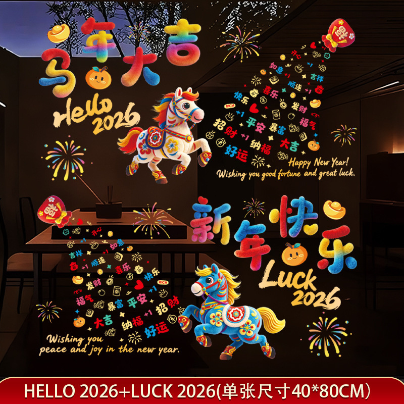 5D毛绒风马年窗花2026过年场景布置装饰春节玻璃门贴纸新年静电贴