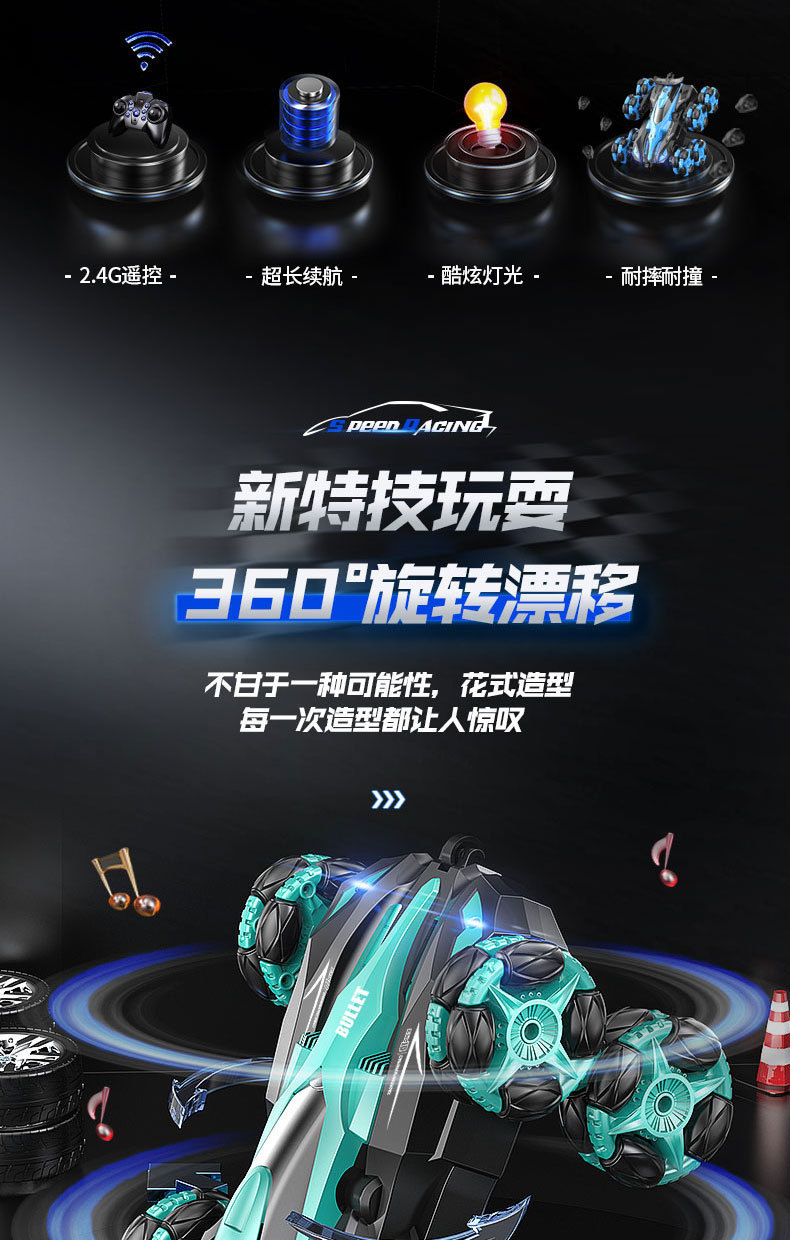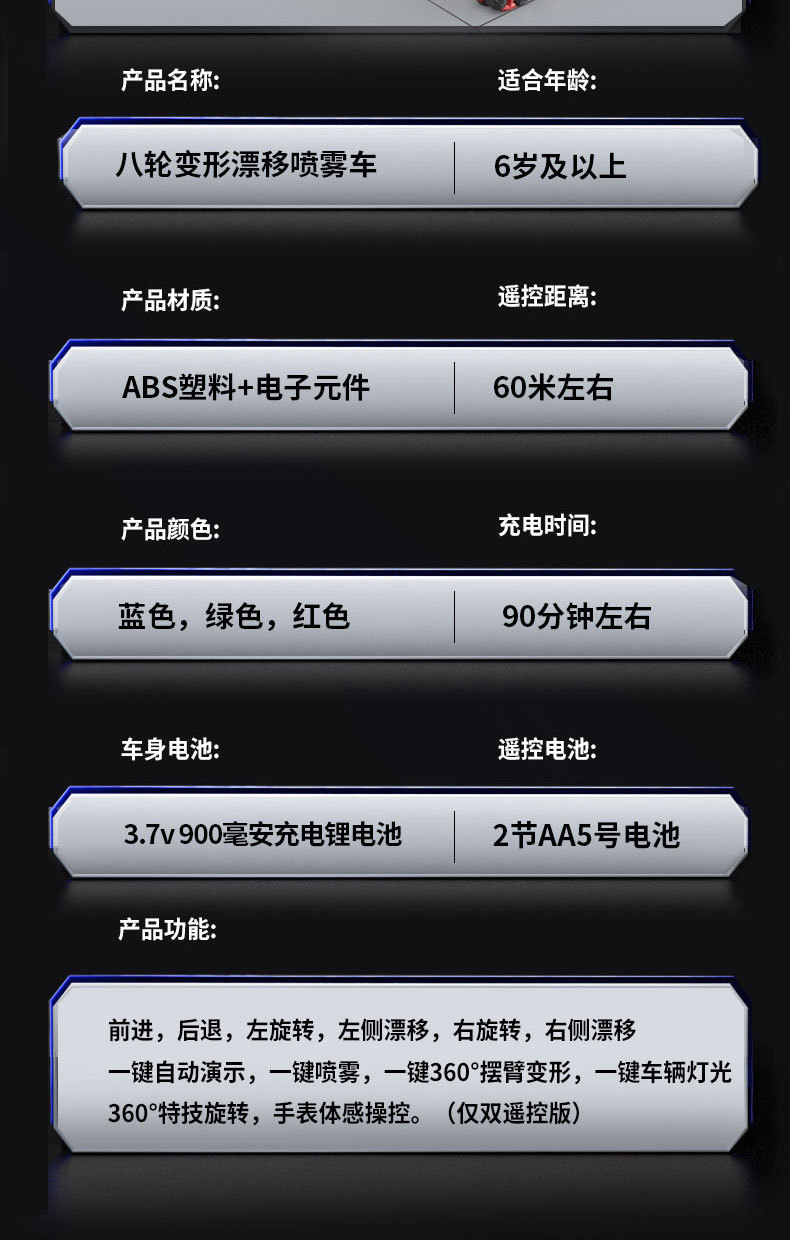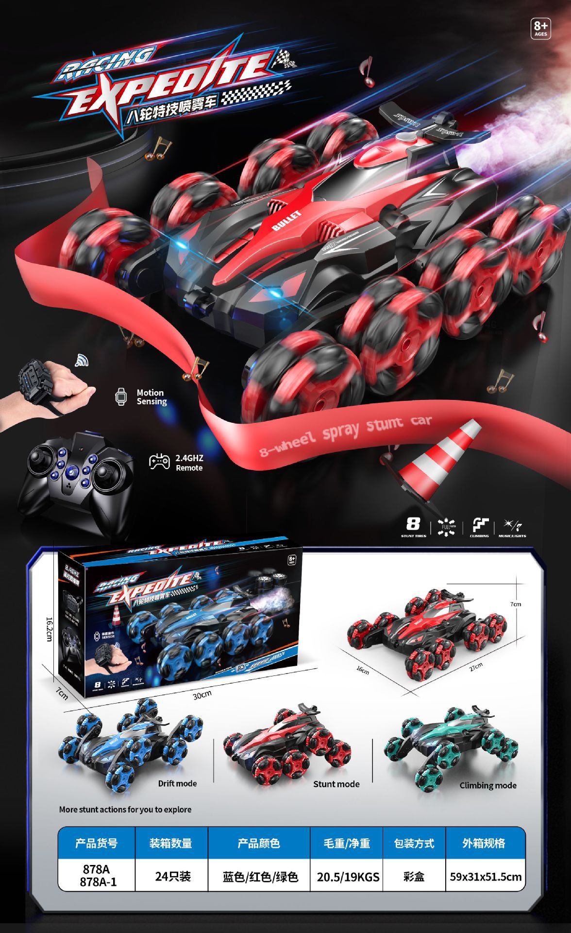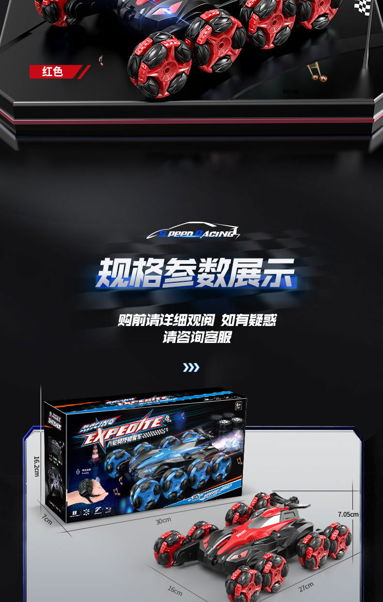 产品名称:2.4G 8轮喷雾漂移特技车(带灯光 音乐 喷雾)