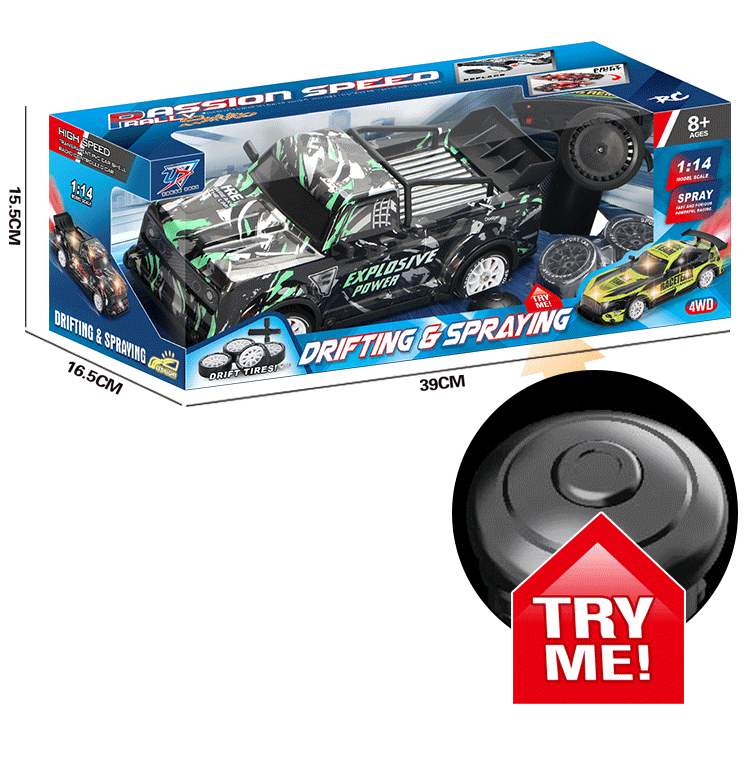 产品名:奥迪R8-1:14 四驱漂移灯光喷雾遥控车【开窗盒】带TRY ME(速度可调可控制)