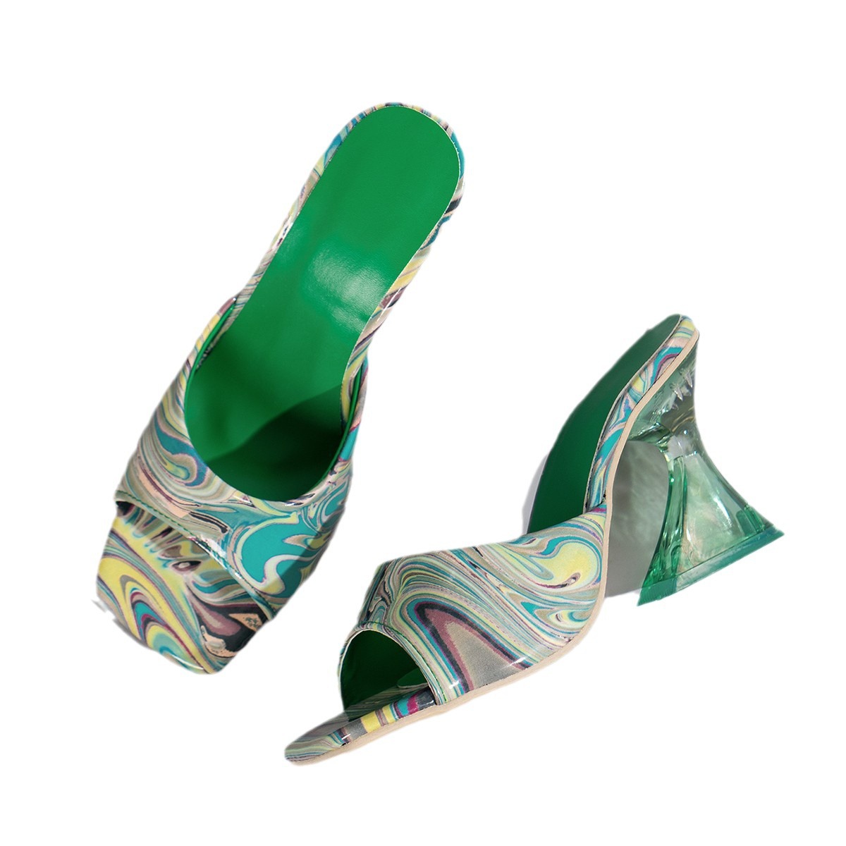 夏季新款外贸大码女士高跟鞋欧美风格特色花纹水晶跟方头跟鞋