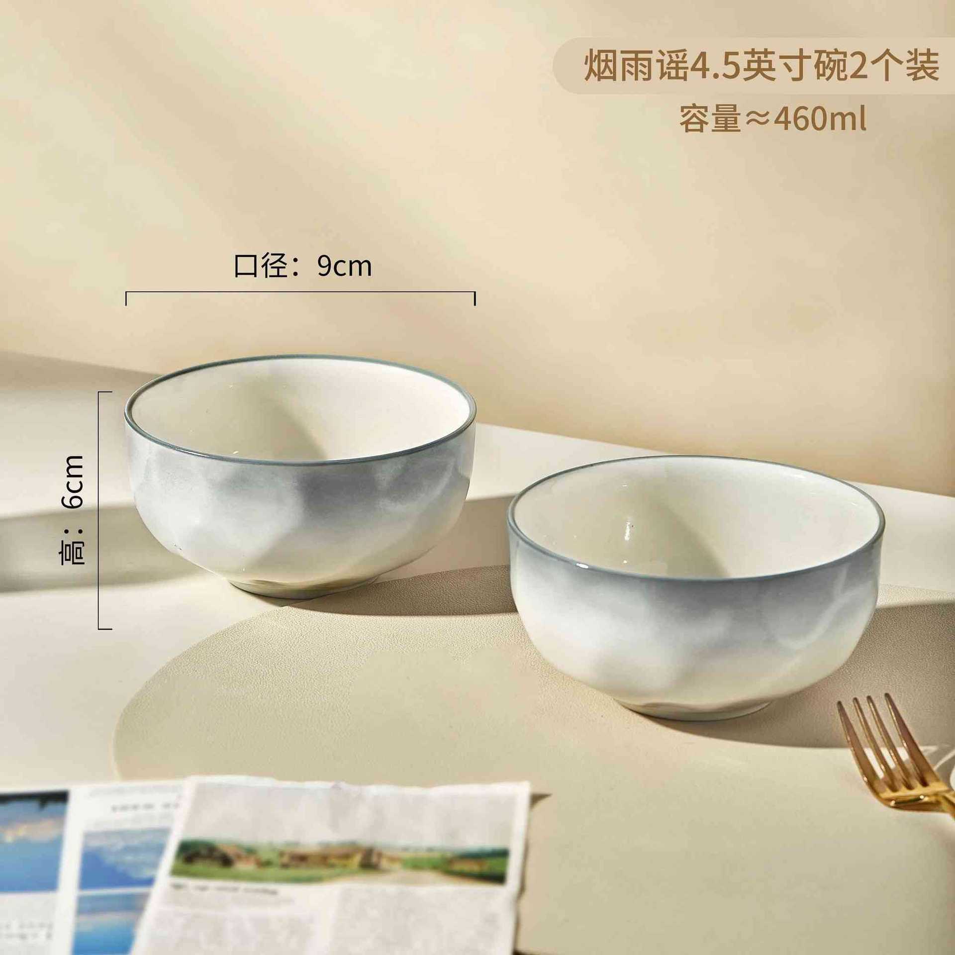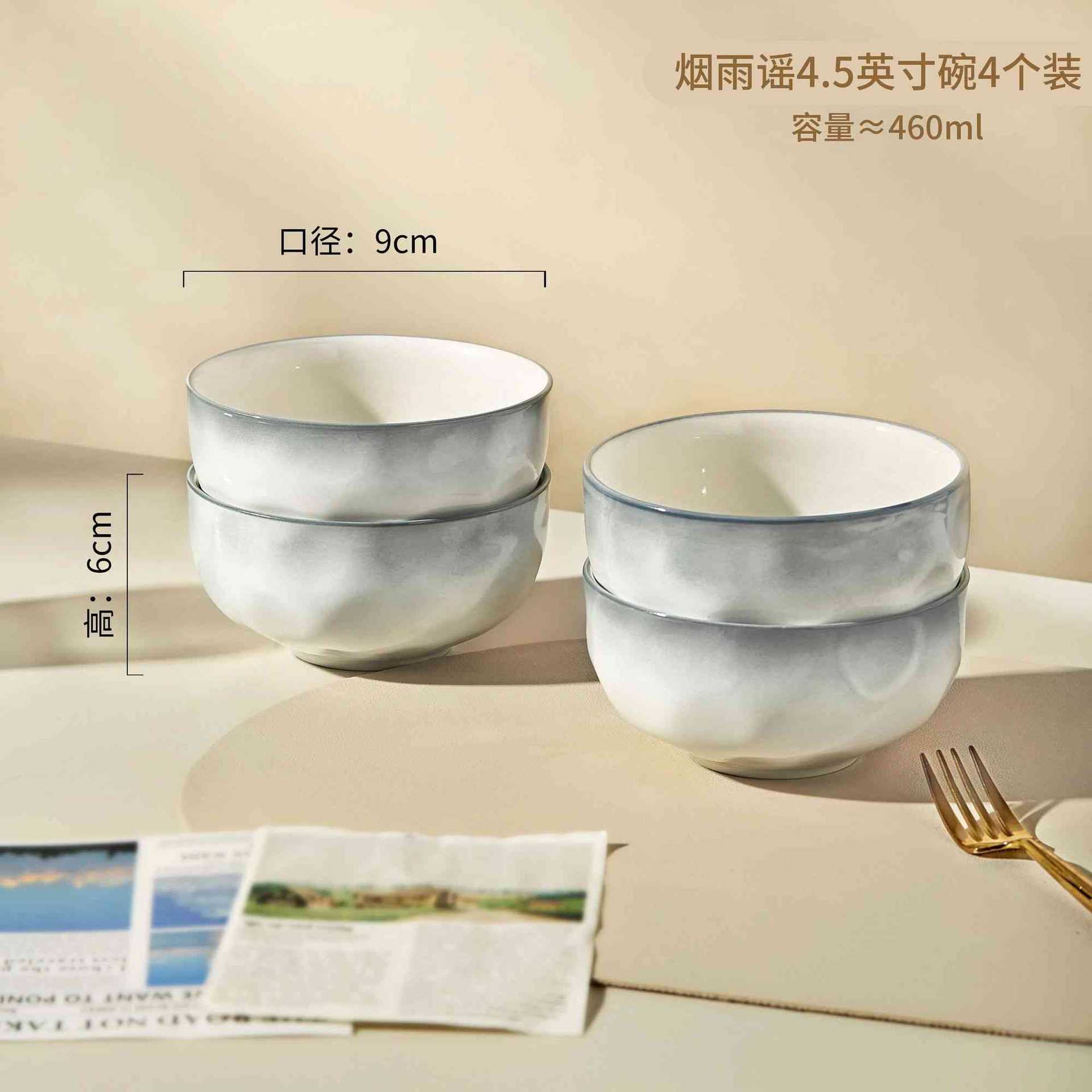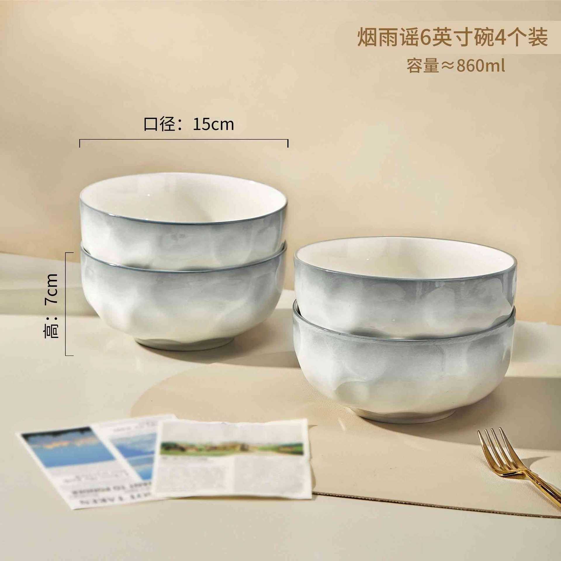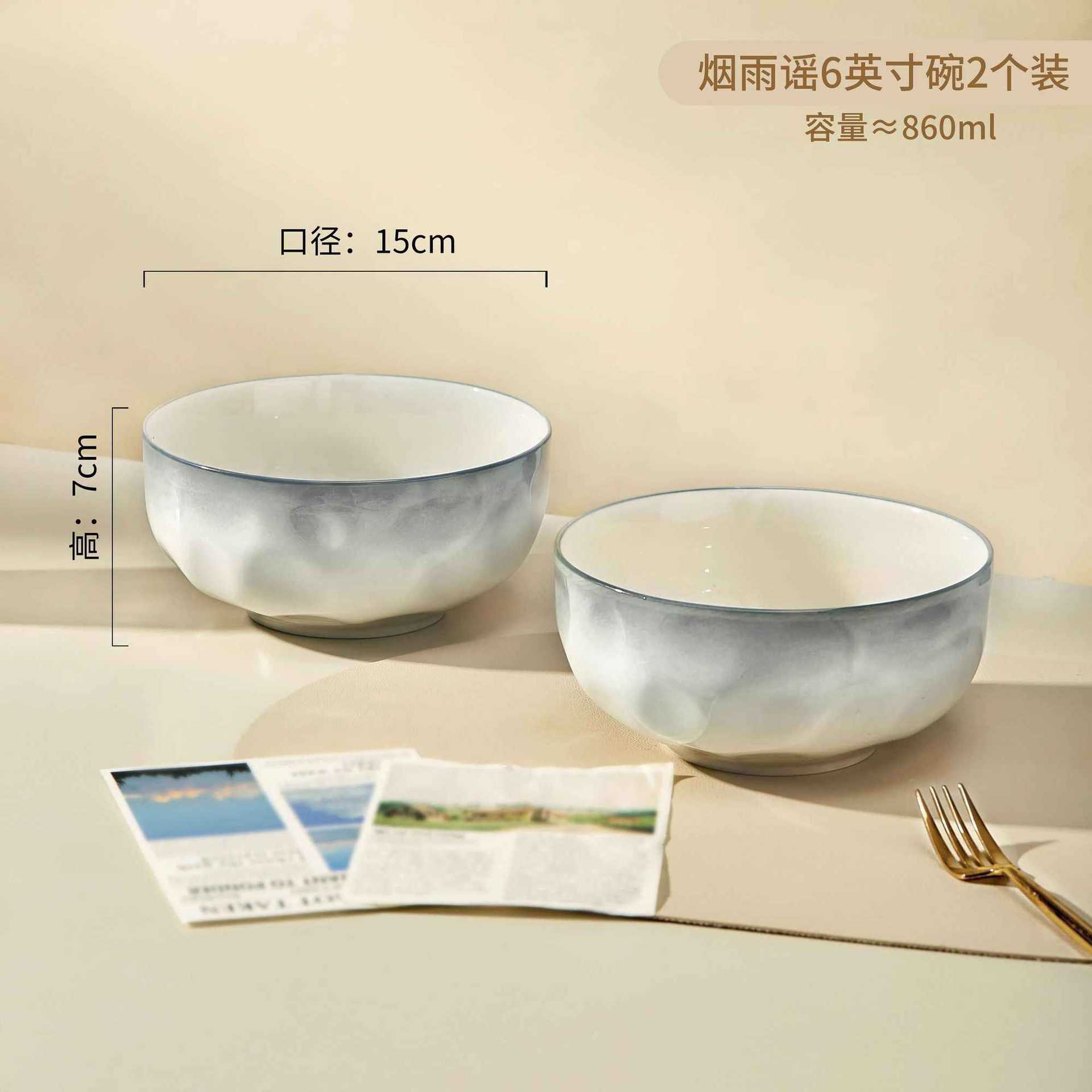 烟雨遥碗盘碟家用釉下彩陶瓷米饭碗高级渐变青碗具简约家用汤盘