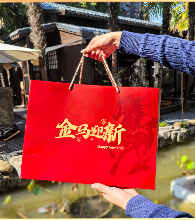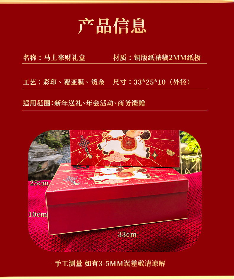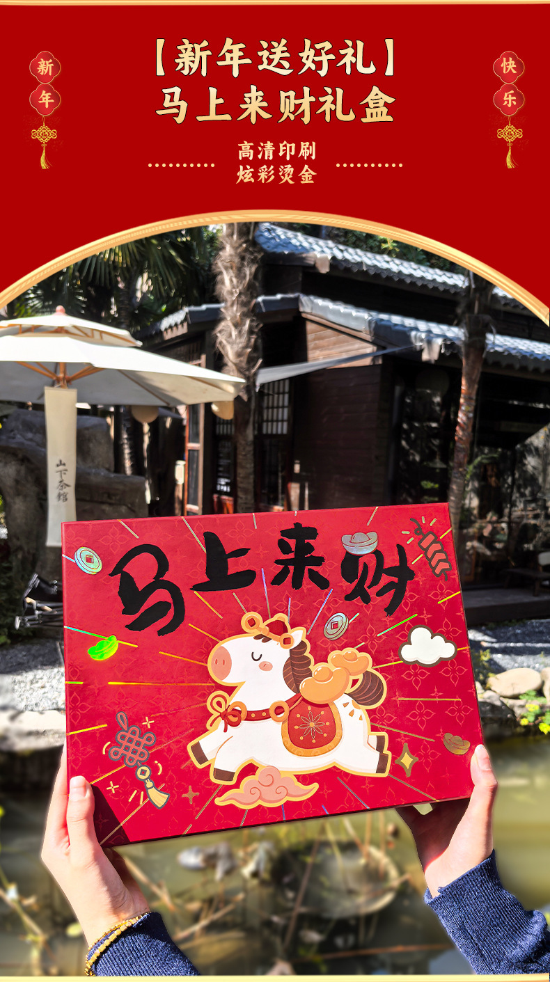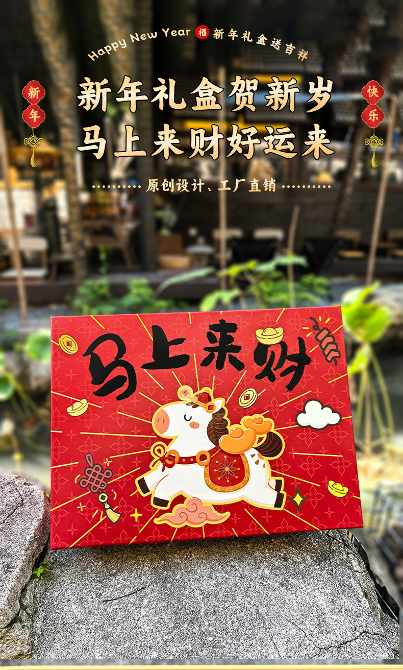 马年新春喜庆礼盒年货礼物马上来财红色包装盒坚果特产手提礼袋