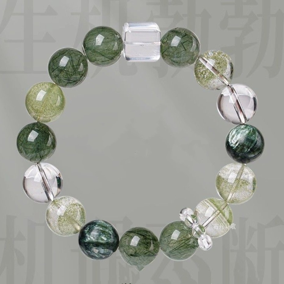 天然石绿发晶手链女绿幽灵绿龙晶串珠方糖蓝针水晶新中式手饰礼物