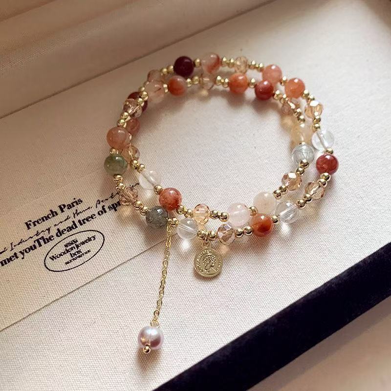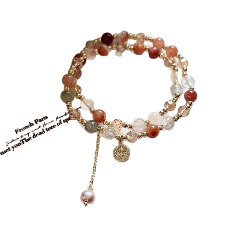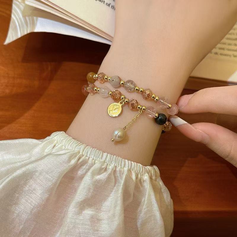 双层茶晶串珠珍珠手链小众法式复古轻奢高级感手串气质百搭手饰女