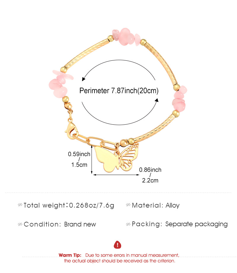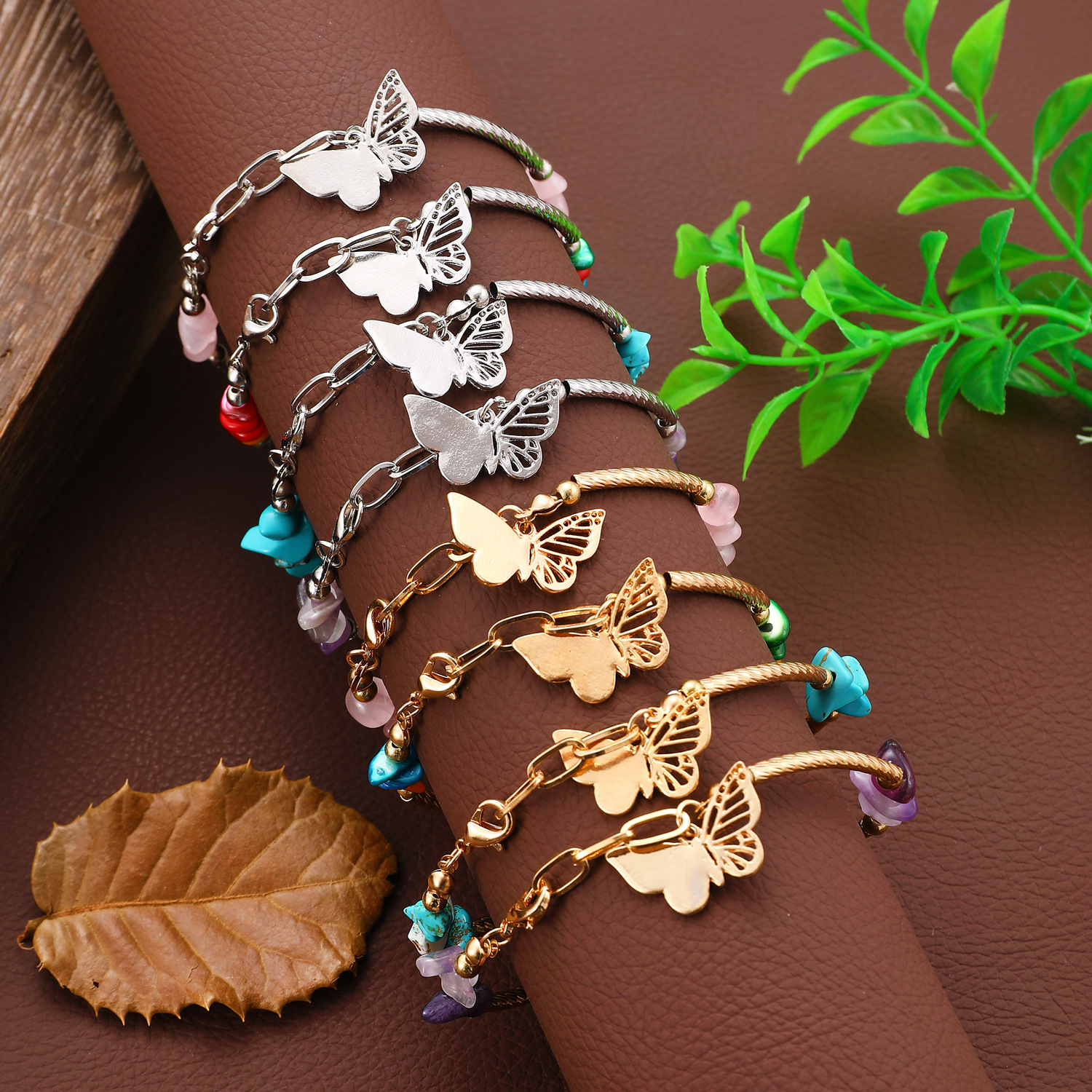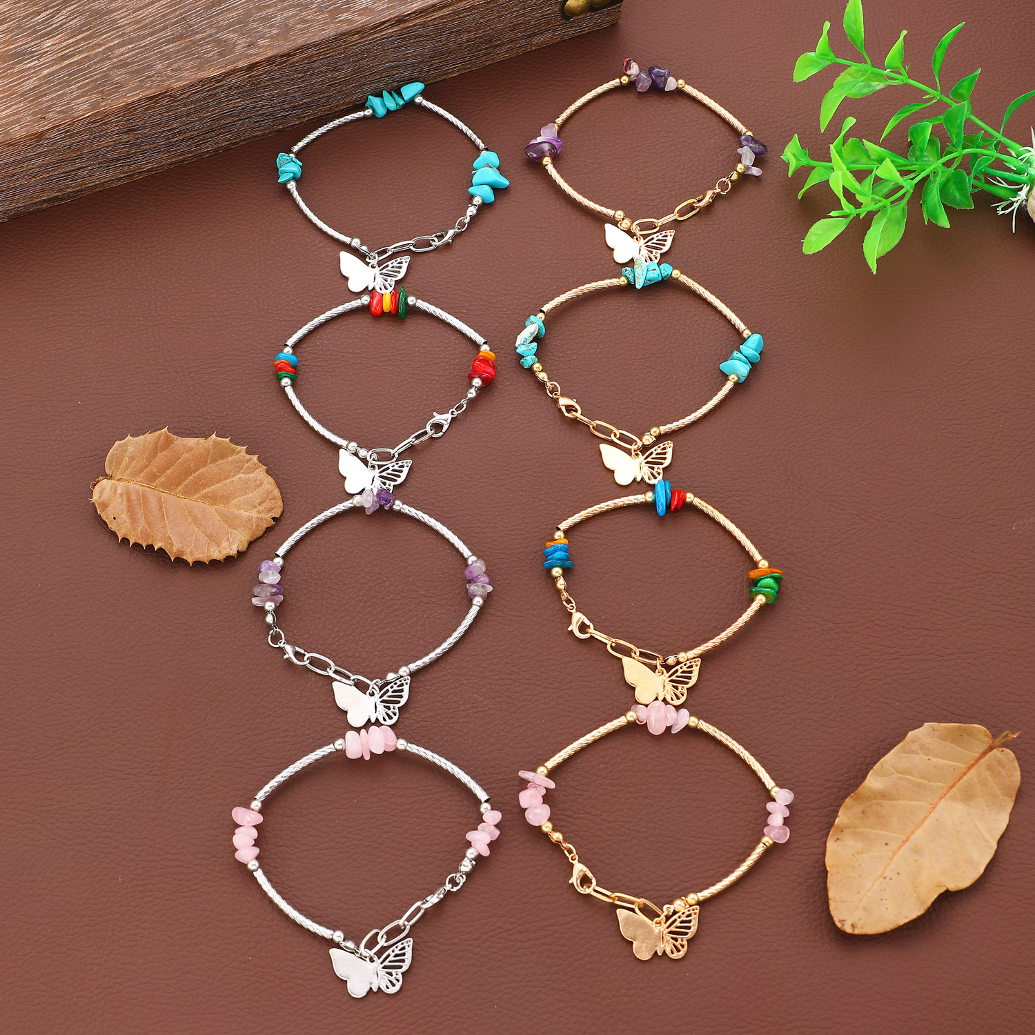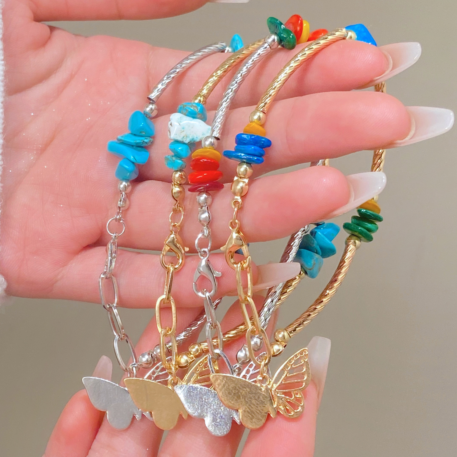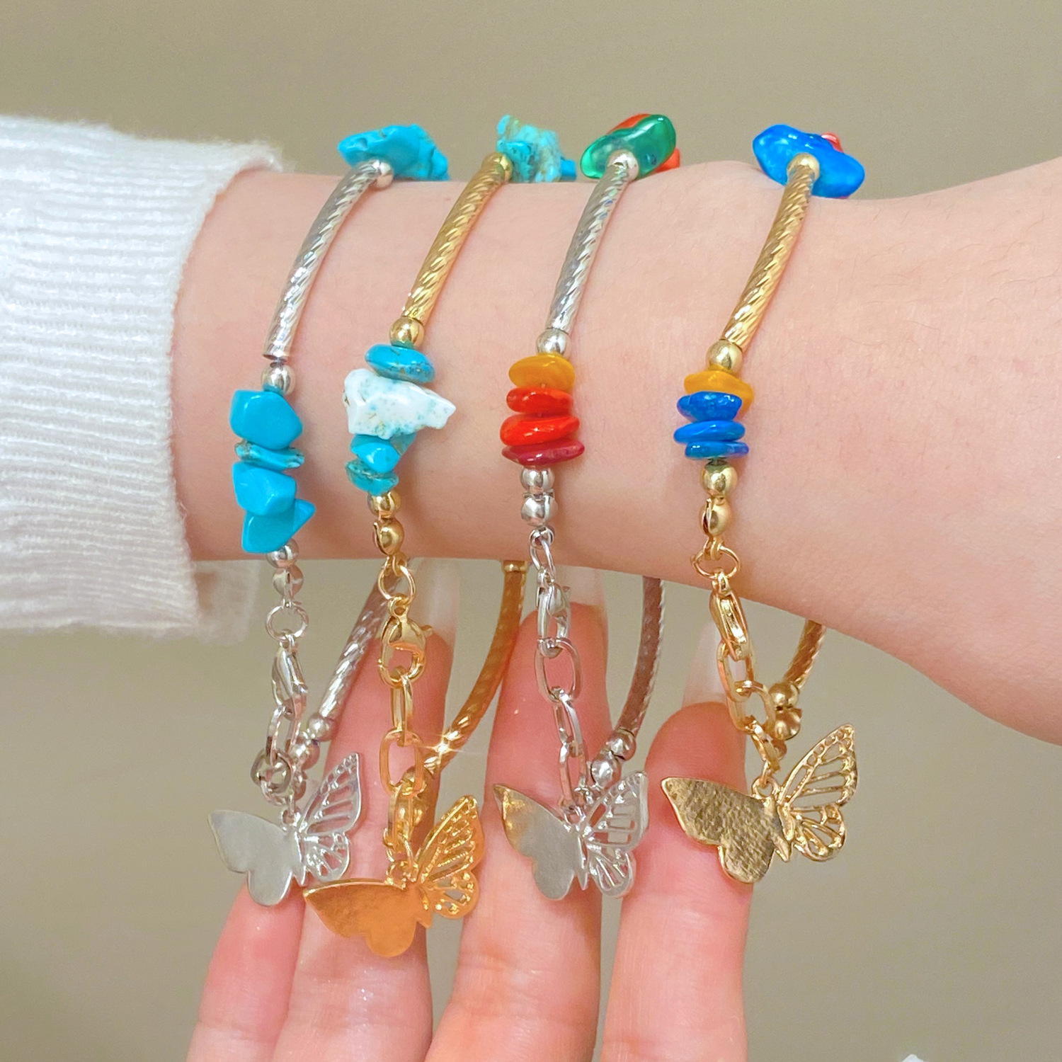 跨境复古天然石水晶仿珍珠叠戴手链女多巴胺彩色碎石蝴蝶吊坠手饰