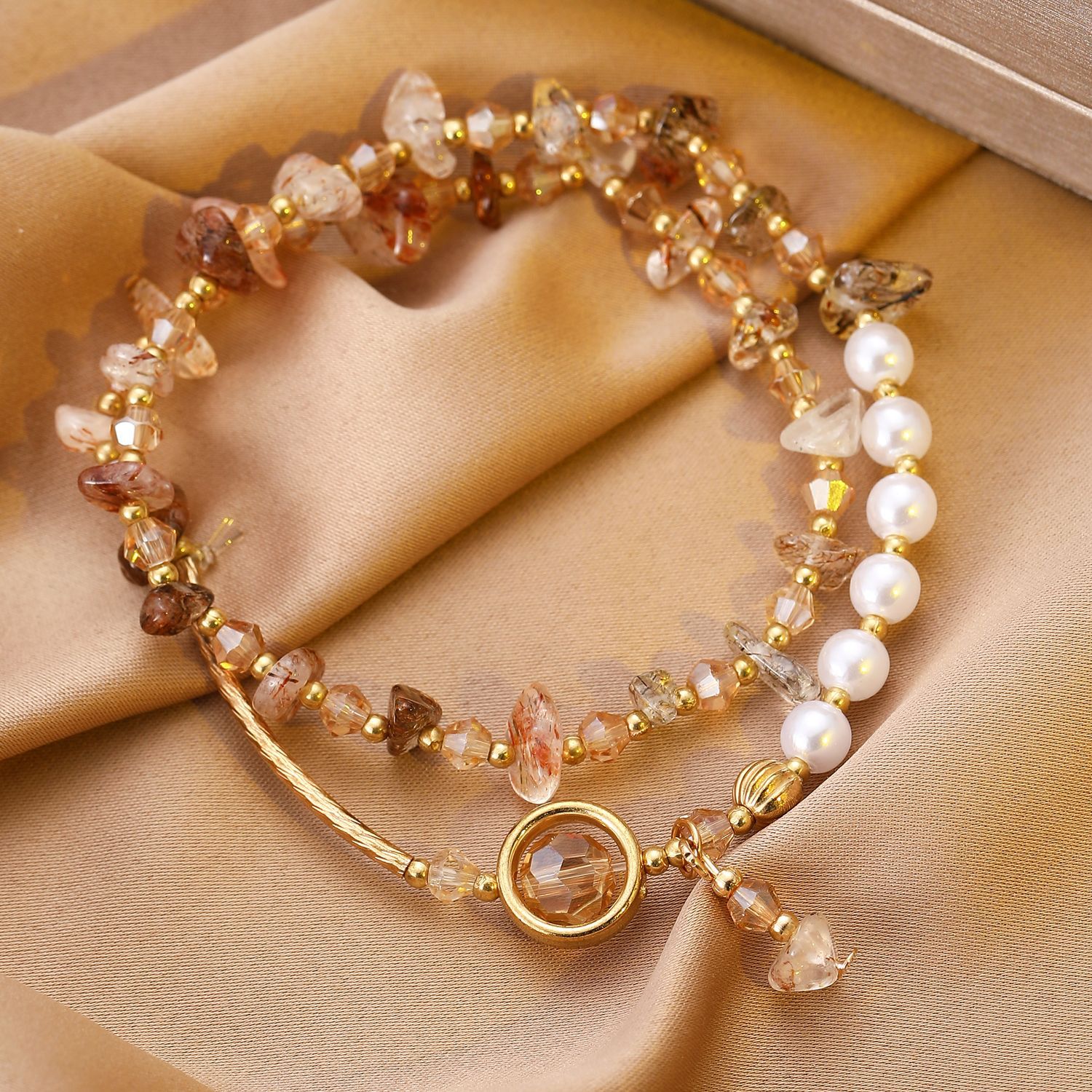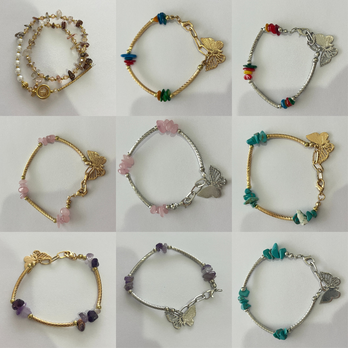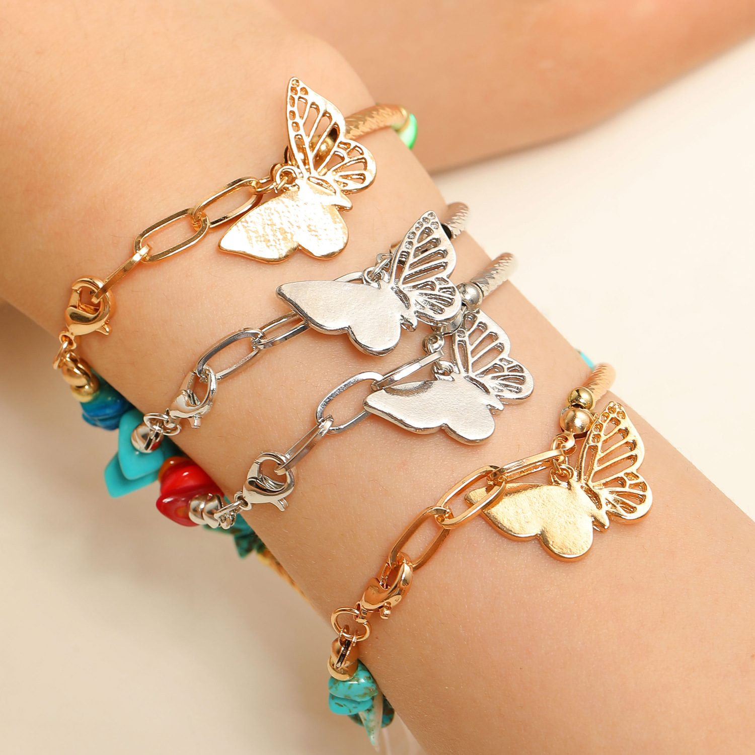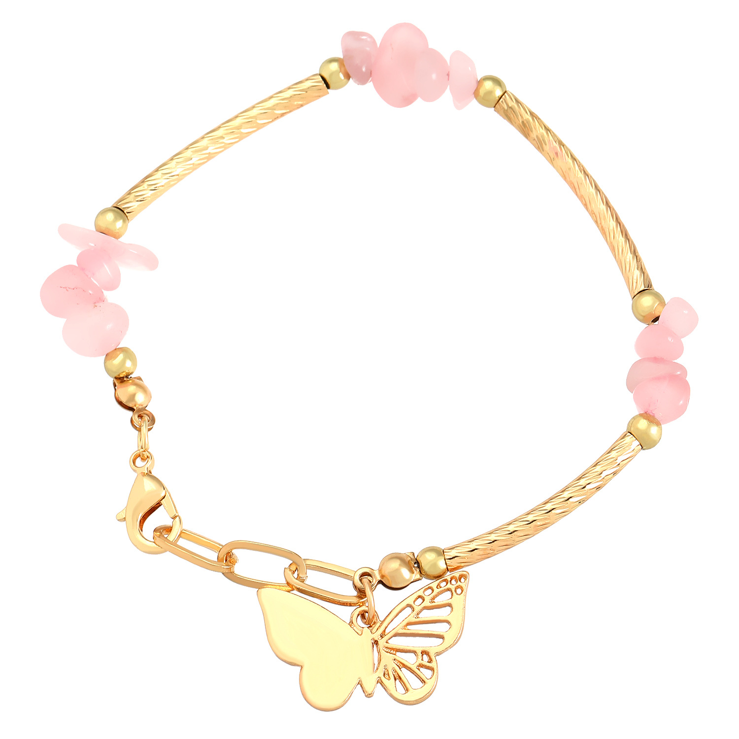 跨境复古天然石水晶仿珍珠叠戴手链女多巴胺彩色碎石蝴蝶吊坠手饰