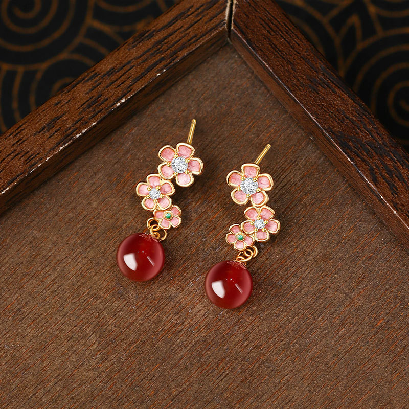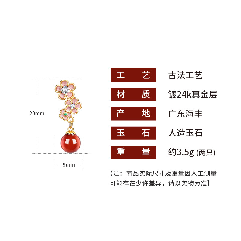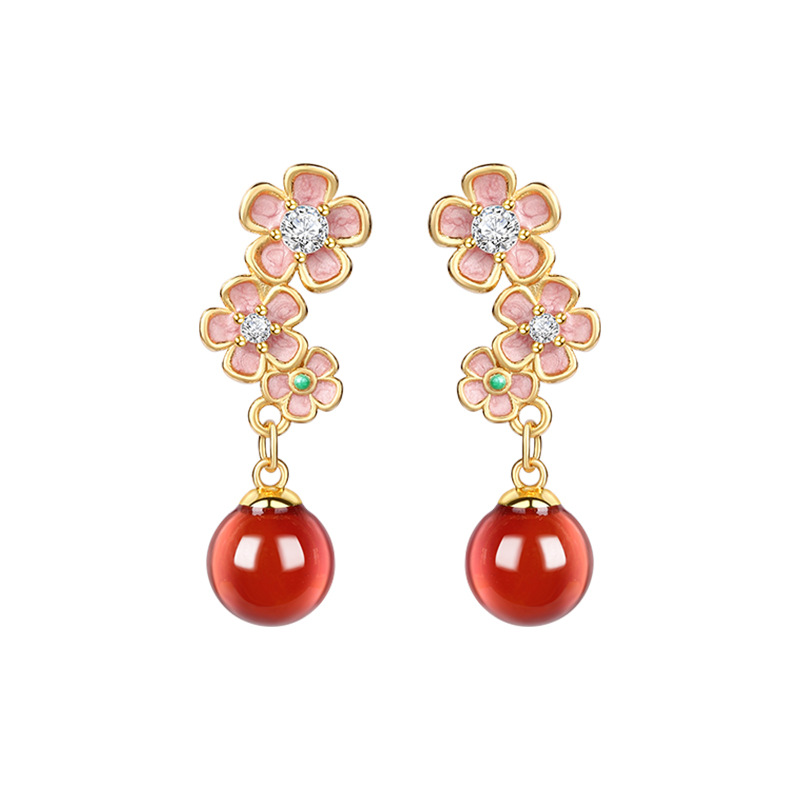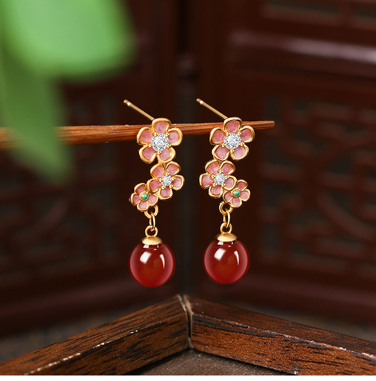 S925银针珐琅桃花仿玉石耳坠女新中式轻奢高级感耳钉七夕节礼物