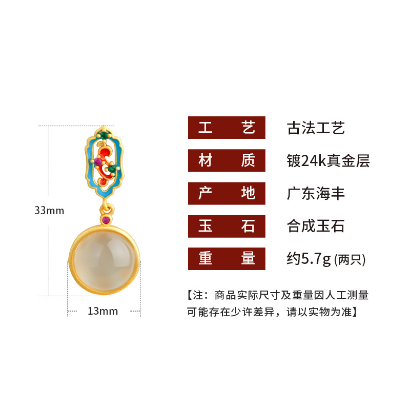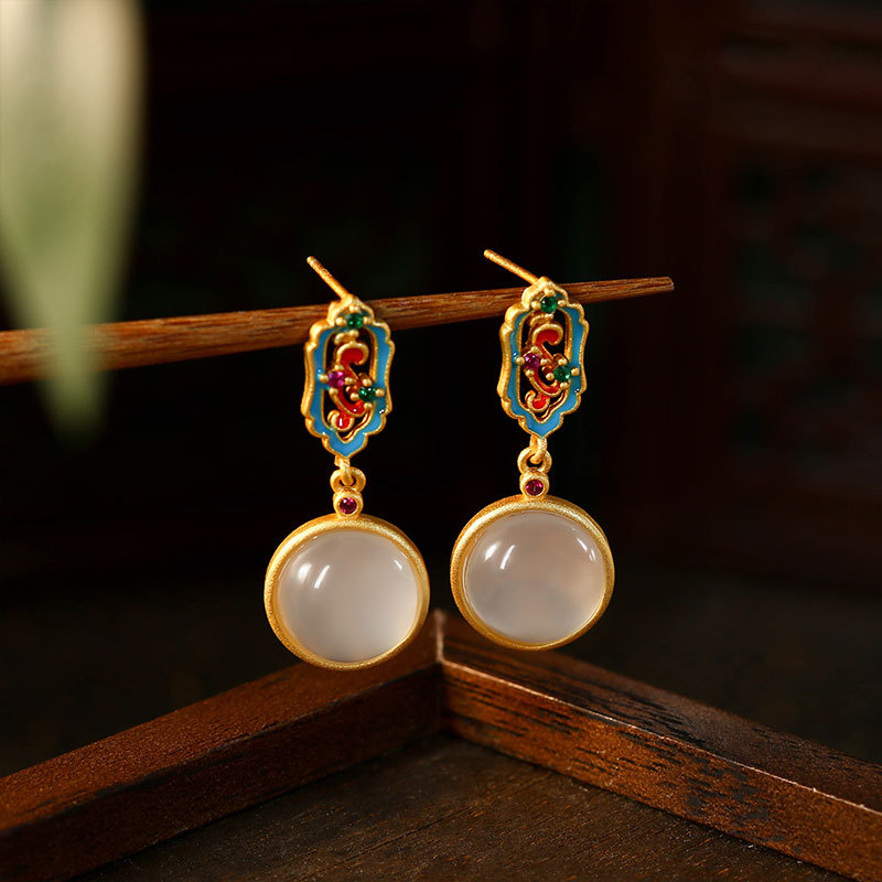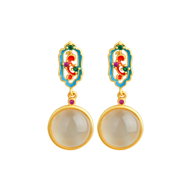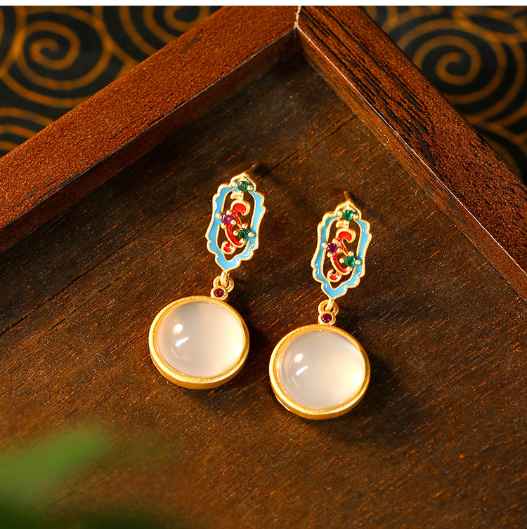 新中式珐琅釉彩镶嵌天然玉髓圆形耳钉925银针复古高级感轻奢耳饰